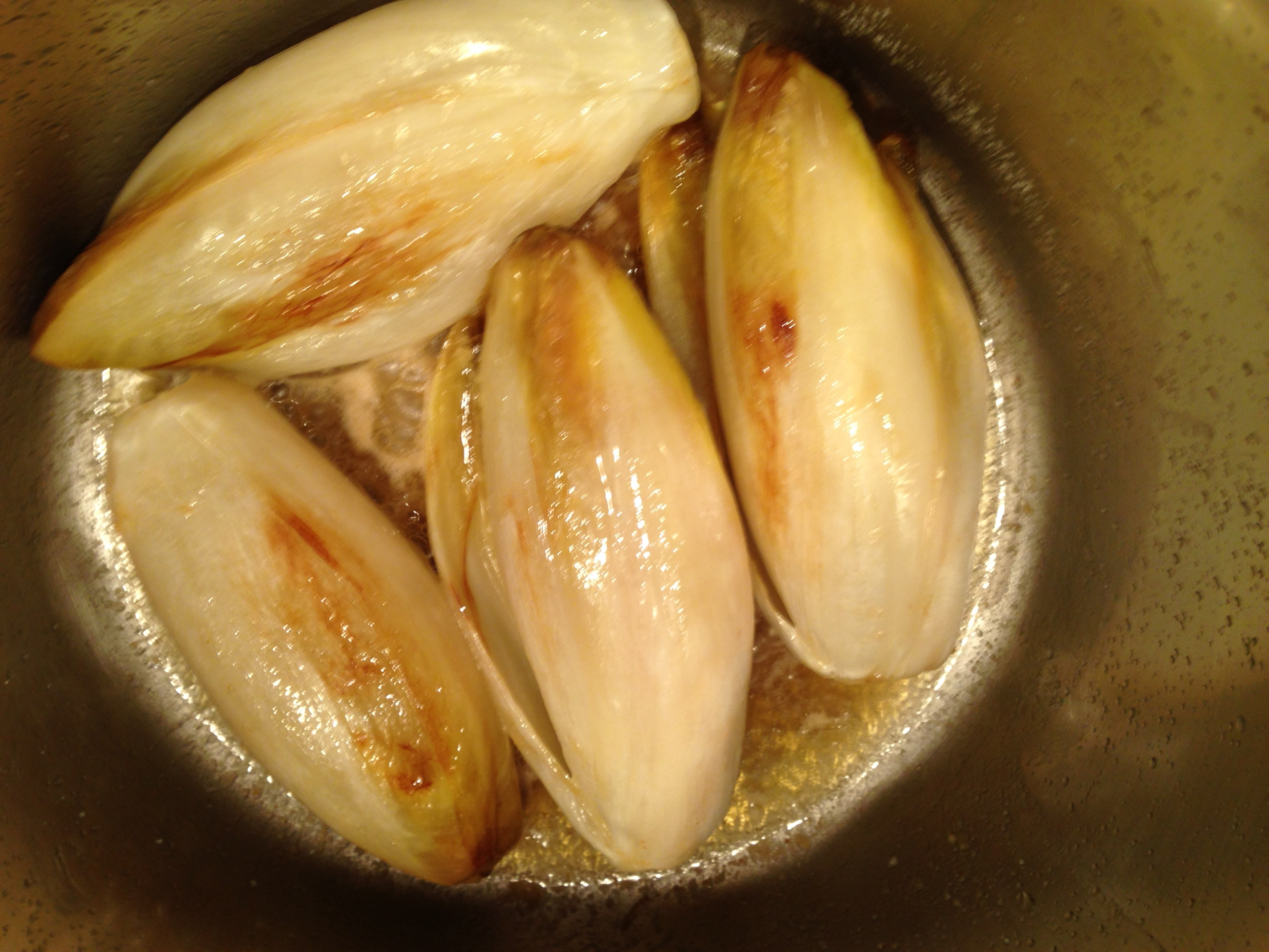 1º Preparar las endivias, poner a caramelizar y preparar su fondo de ave. 15 minutos.