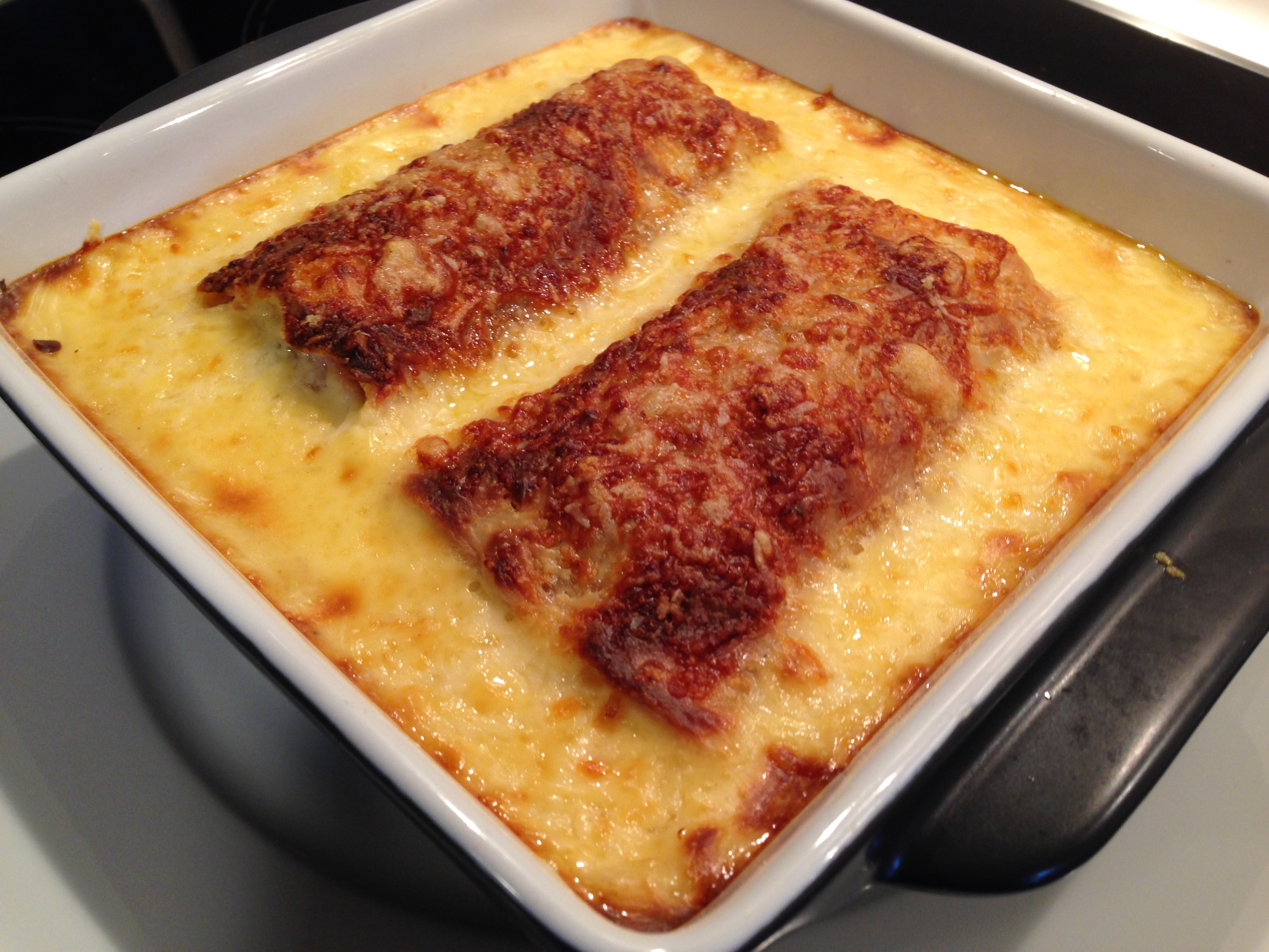 Cogemos la fuente de horno, limpiamos y, sobre su fondo, hacemos una base de salsa Mornay. Encima de ésta colocamos los crêpes perfectamente alineados y, sobre ellos, ponemos salsa Mornay. No hay que cubrir los crêpes con ésta, sólo taparlos por arriba y hasta la mitad de ellos. Por último, se ralla queso por encima.