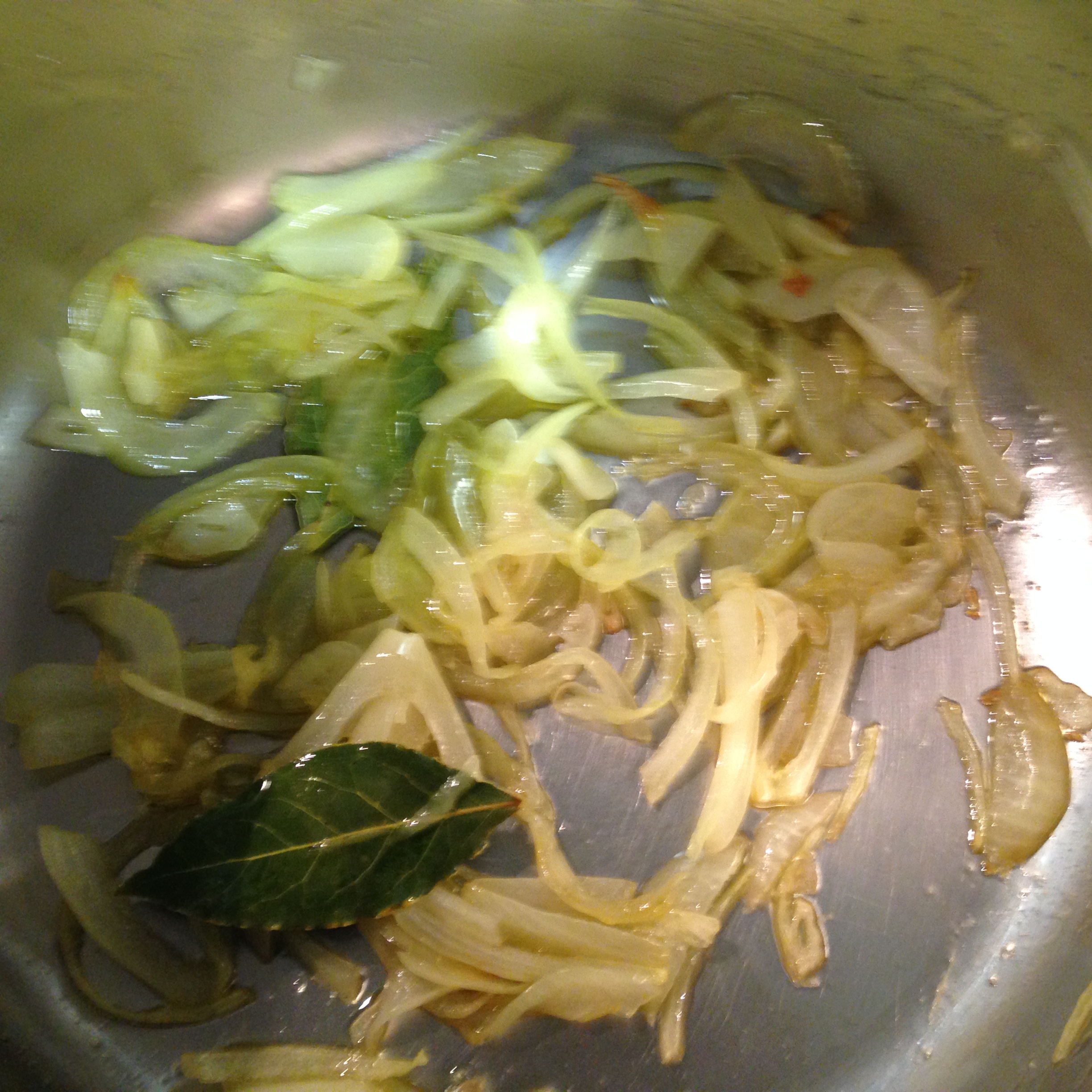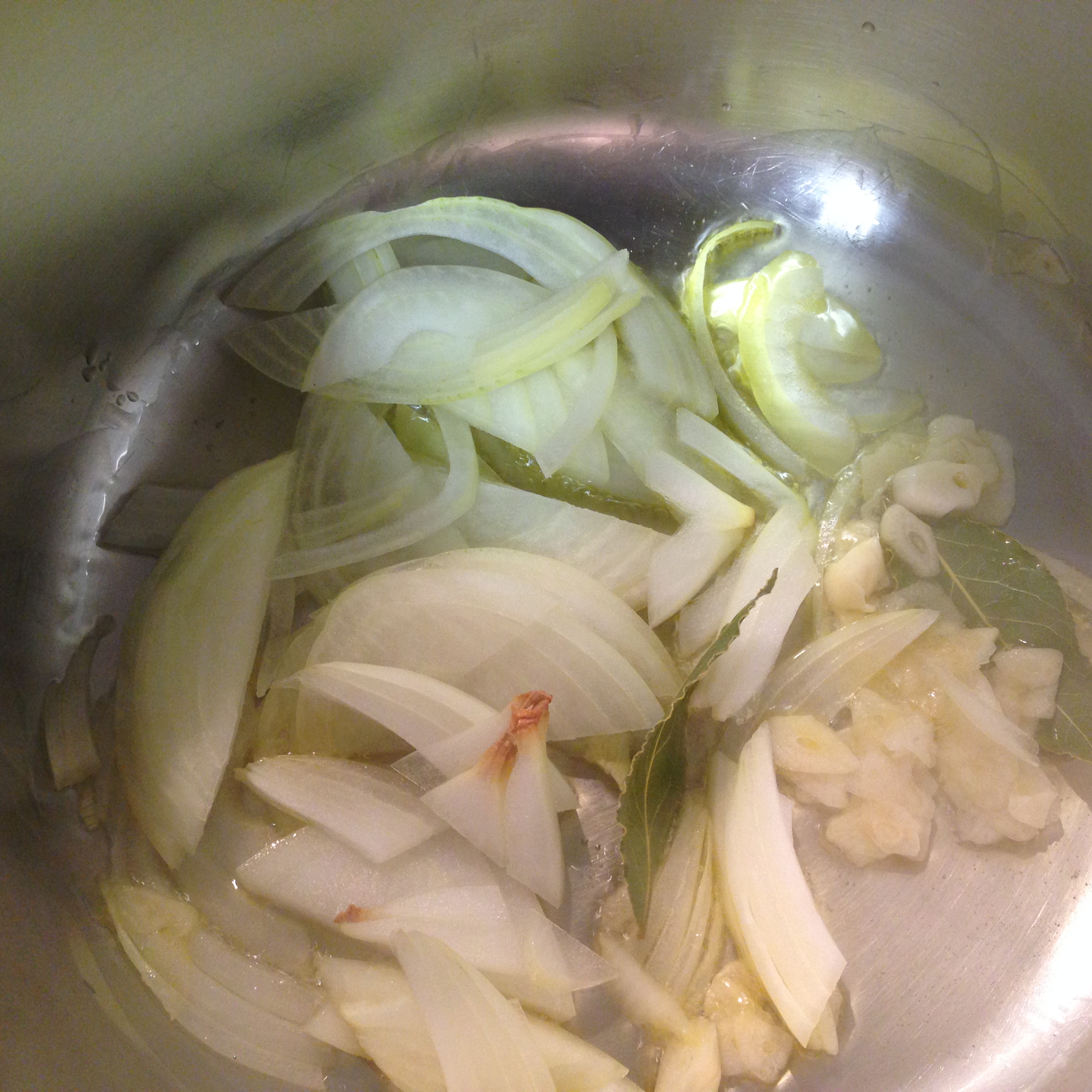 Ponemos un poco de aceite en una cacerola que tenga fondo suficiente para que nos quepan todos los mejillones que luego abrirán y en ella ponemos a sudar la media cebolla cortada en tiras, el ajo en láminas y una hoja de laurel. Le añadimos una pizca de sal y pimienta.