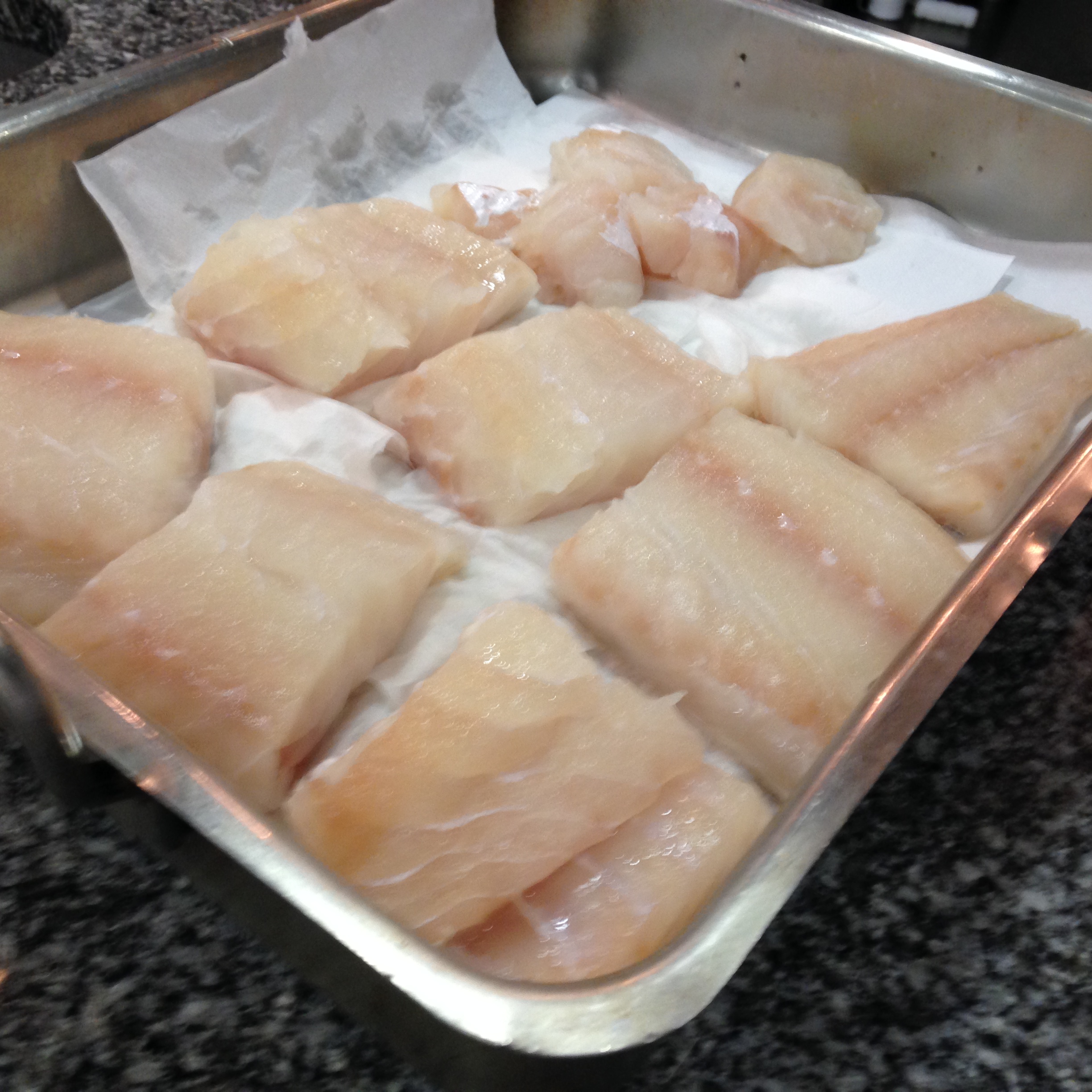 Sacamos el lomo del bacalao fresco, lo limpiamos bien, comprobamos que no tenga Anisakis, aunque debiéramos congelarlo durante cuarenta y ocho horas a -30º como prevención, lo lavamos, lo troceamos y le ponemos sal gorda por encima, lo dejamos un rato mientras hacemos las lentejas y comenzamos la salsa.
