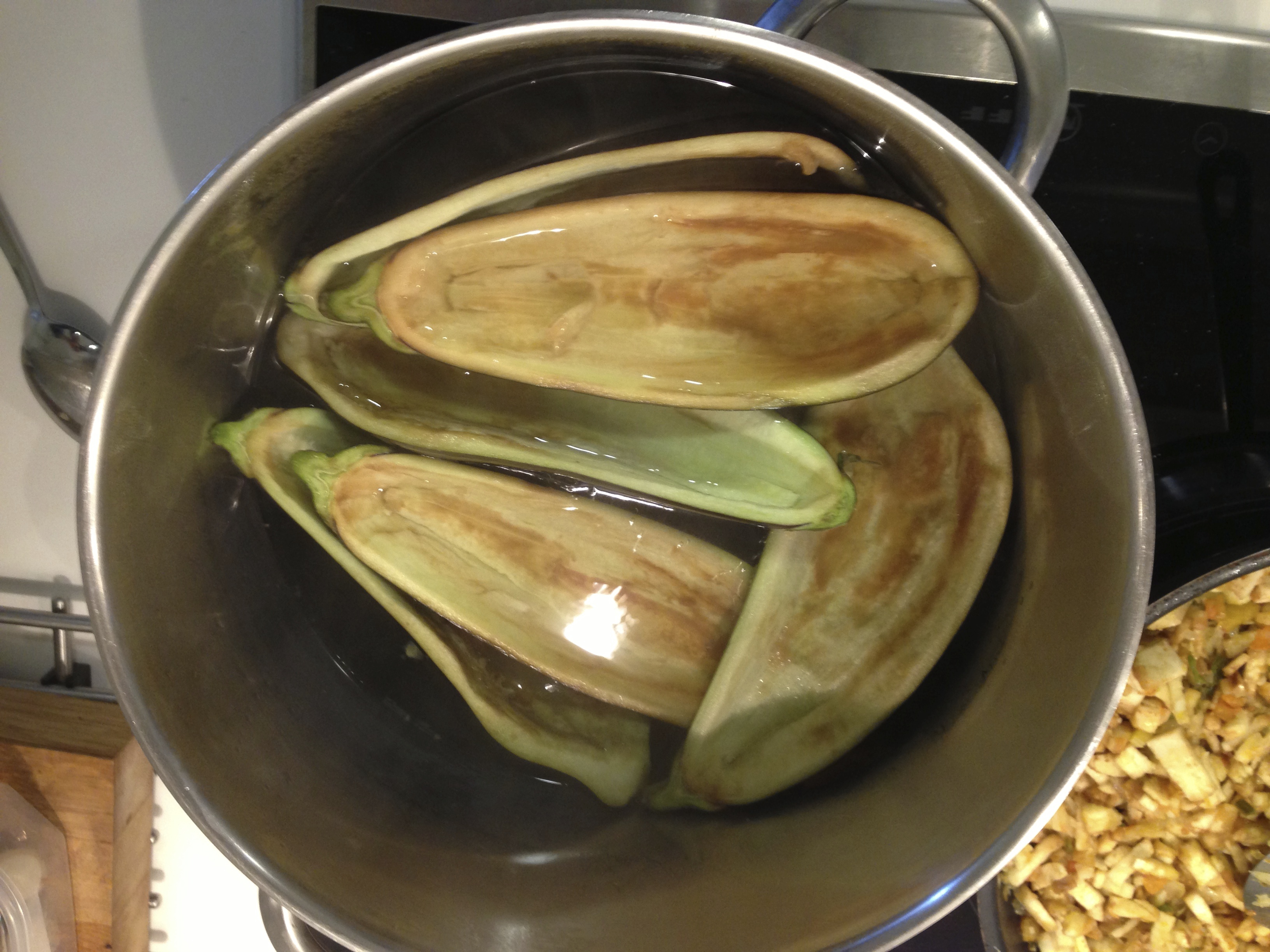 Partimos las berenjenas en dos por el centro, con ayuda de un cuchillo pequeño y con una cuchara las vaciamos. Las berenjenas se oxidan con facilidad, pero para evitar esto ponemos agua a hervir en abundancia con un puñado de sal e