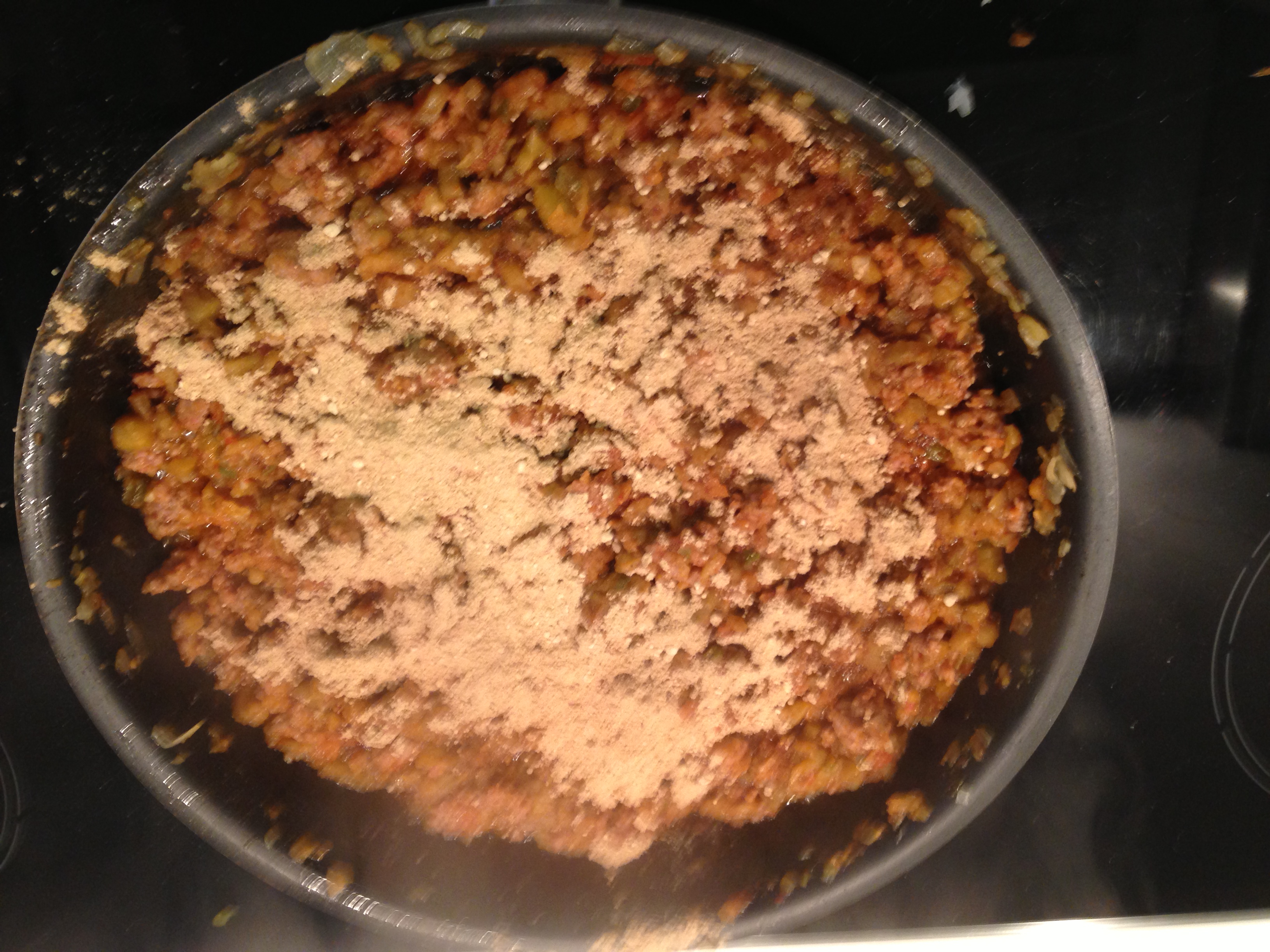 Una vez sudada la cebolla y demás verduras, le incorporamos la carne de las berenjenas para que se vaya haciendo, luego incorporamos el tomate, mezclamos bien, le añadimos un poco de azúcar, una hoja de laurel y un ramillete de tomillo. Ambas cosas, laurel y tomillo, las retiraremos con posterioridad. Tapamos la sartén con una tapadera que deje salir el vapor o con un Cartouce de papel, lo ponemos a fuego bajo y lo dejamos hacer hasta que veamos que la cebolla ya no esta crujiente y ha evaporado suficiente. Entonces, le incorporamos la carne y lo dejamos otros 5 ó 10 minutos. En ese momento, le echamos la harina tostada y removemos bien, como se nos secará mucho, le incorporaremos entonces la nata para conseguir la textura deseada y tener una consistencia no demasiado blanda, lo retiramos y lo tapamos con papel film en contacto. Esto podemos hacerlo también incorporándole directamente una bechamel espesa y dejando reducir un poco si fuera necesario.