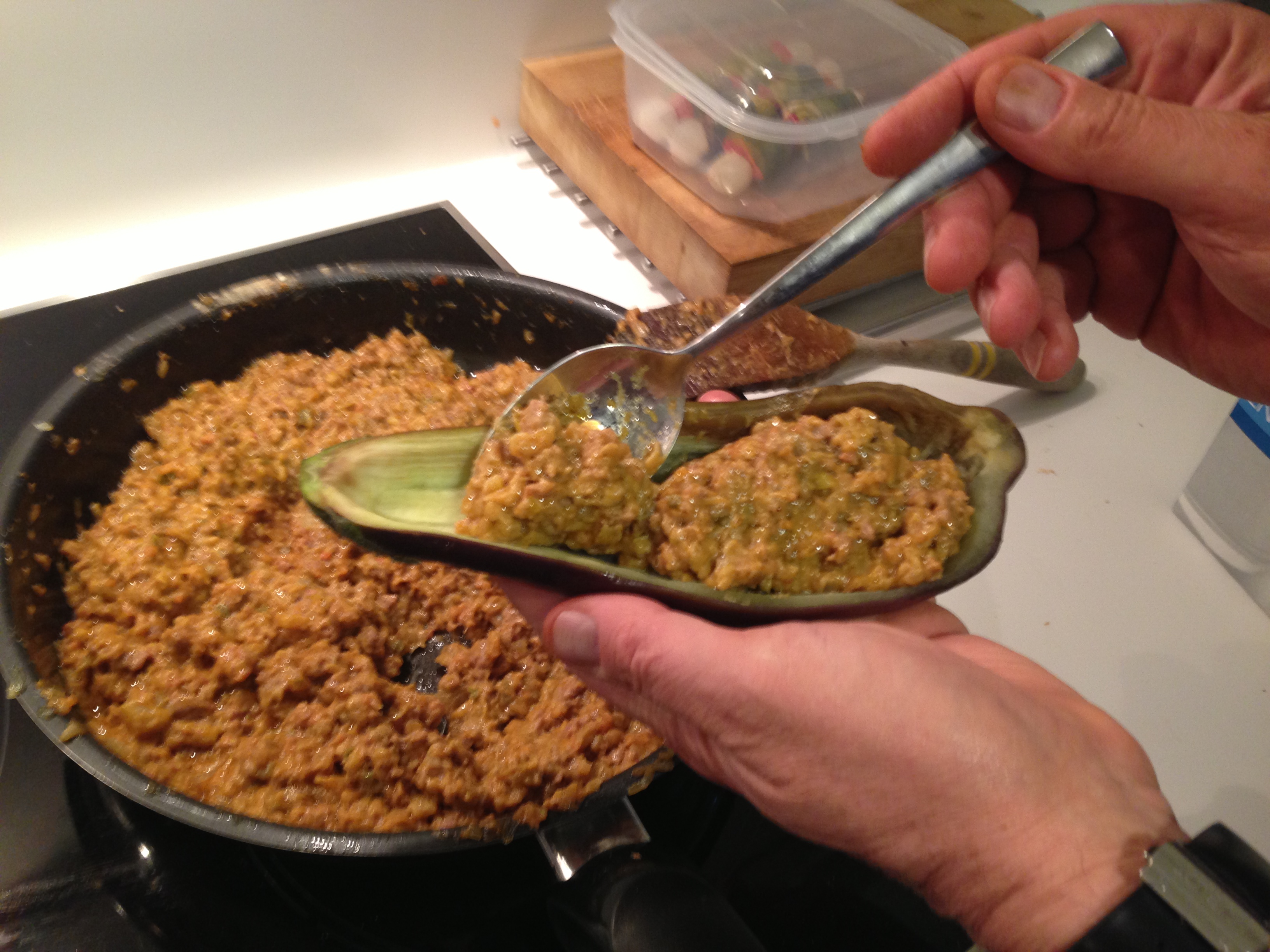 Es importante que el relleno no esté muy fluido puesto que la berenjena hará que no esté tan seca y, al cortarla para servirla, no soltará líquido y mantendrá la forma.