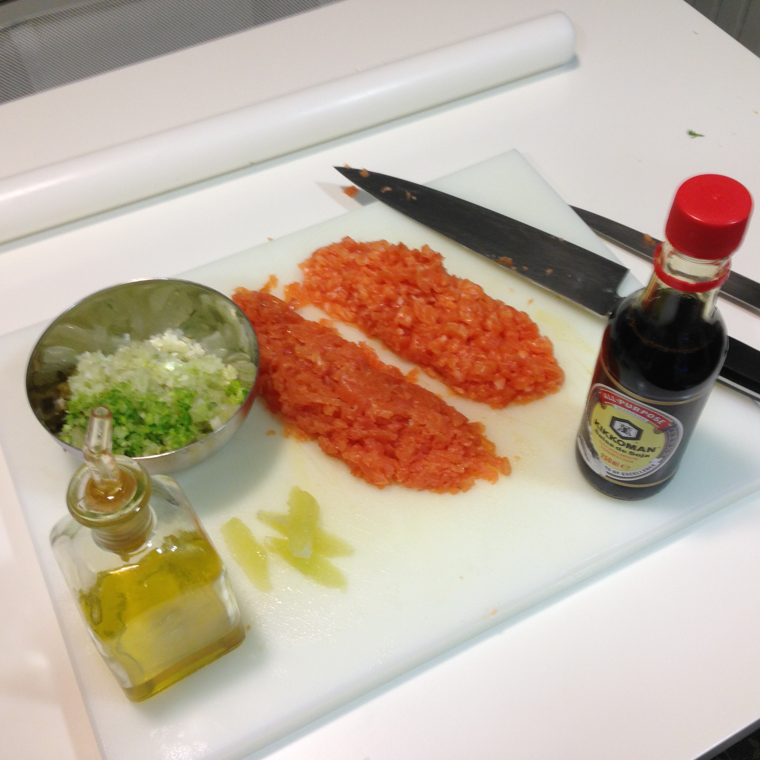 Picamos, «con cuchillo», tanto el salmón fresco como el ahumado, procurando que tengan el mismo tamaño y lo reservamos en frío.