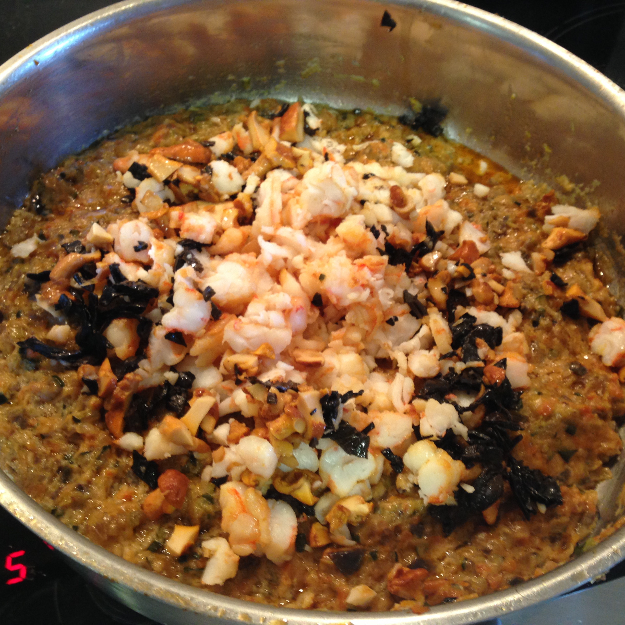 langostinos, igualmente, no queremos que se nos cuezan dentro, los salteamos y cortamos luego muy fino para incorporarlos, puesto que nada tiene que ver el sabor de estos entre salteados y cocidos.