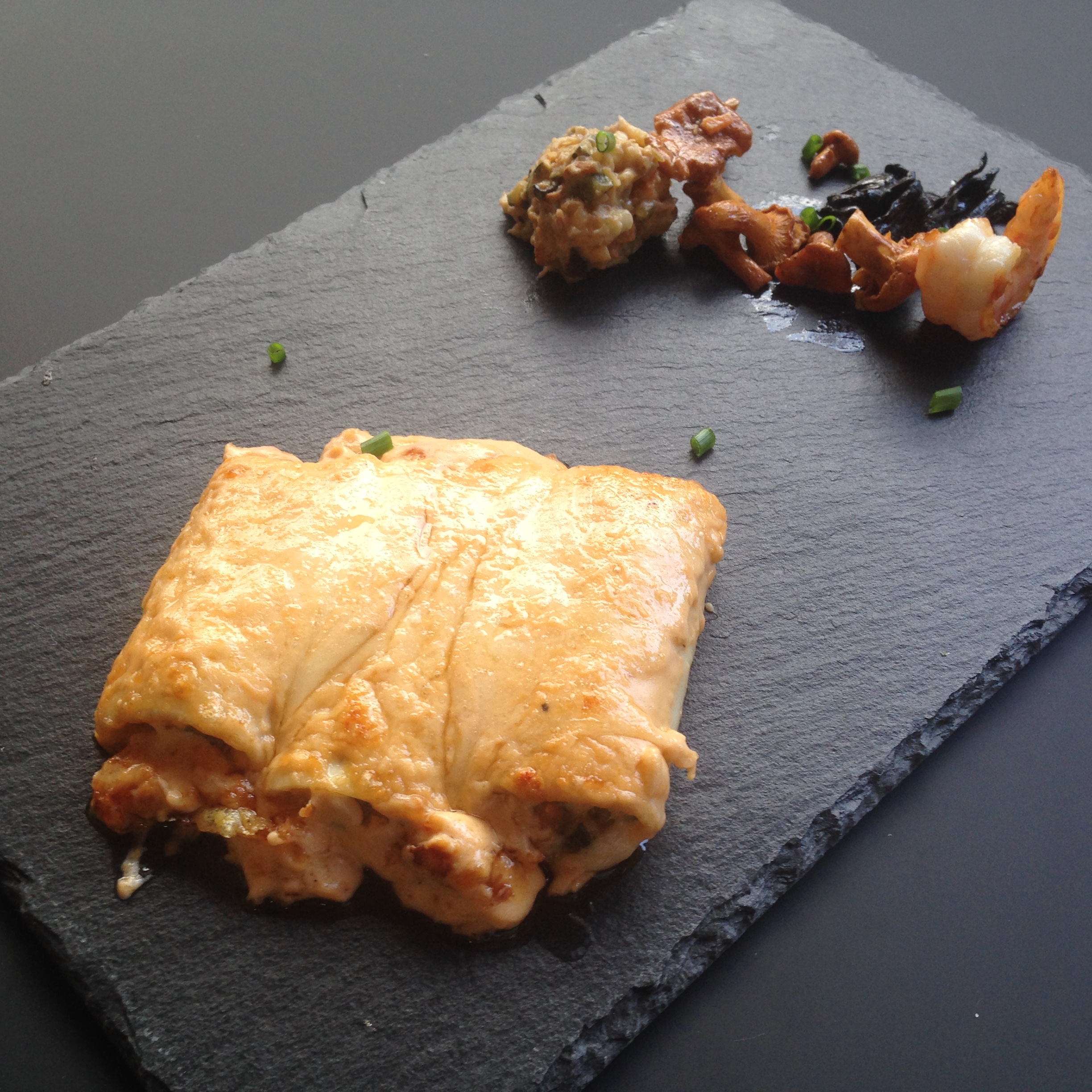 Sacamos el relleno, picamos bien las setas y los langostinos y los mezclamos. Con ello vamos rellenando los canelones, cerrándolos y colocándolos sobre una fuente.