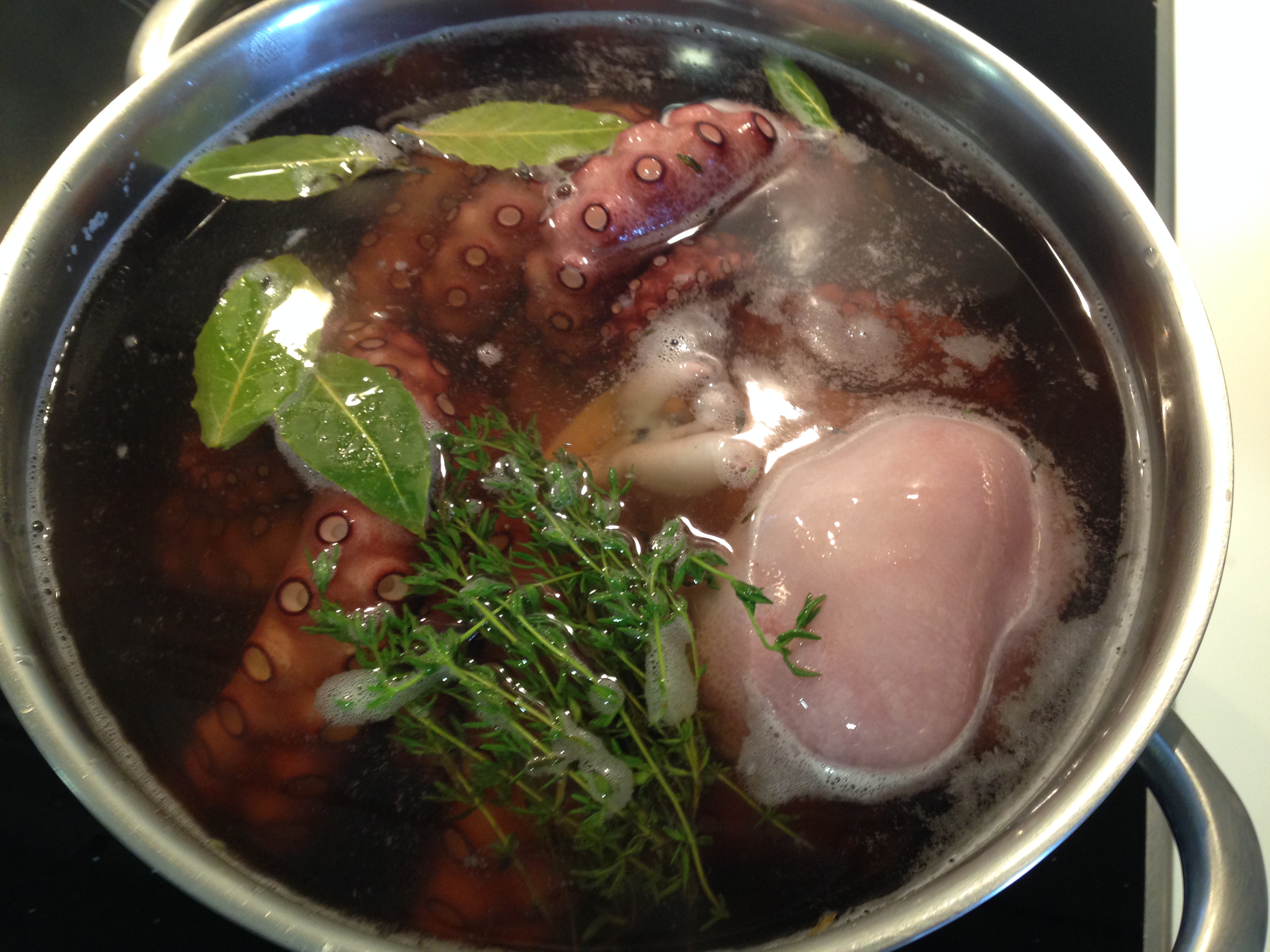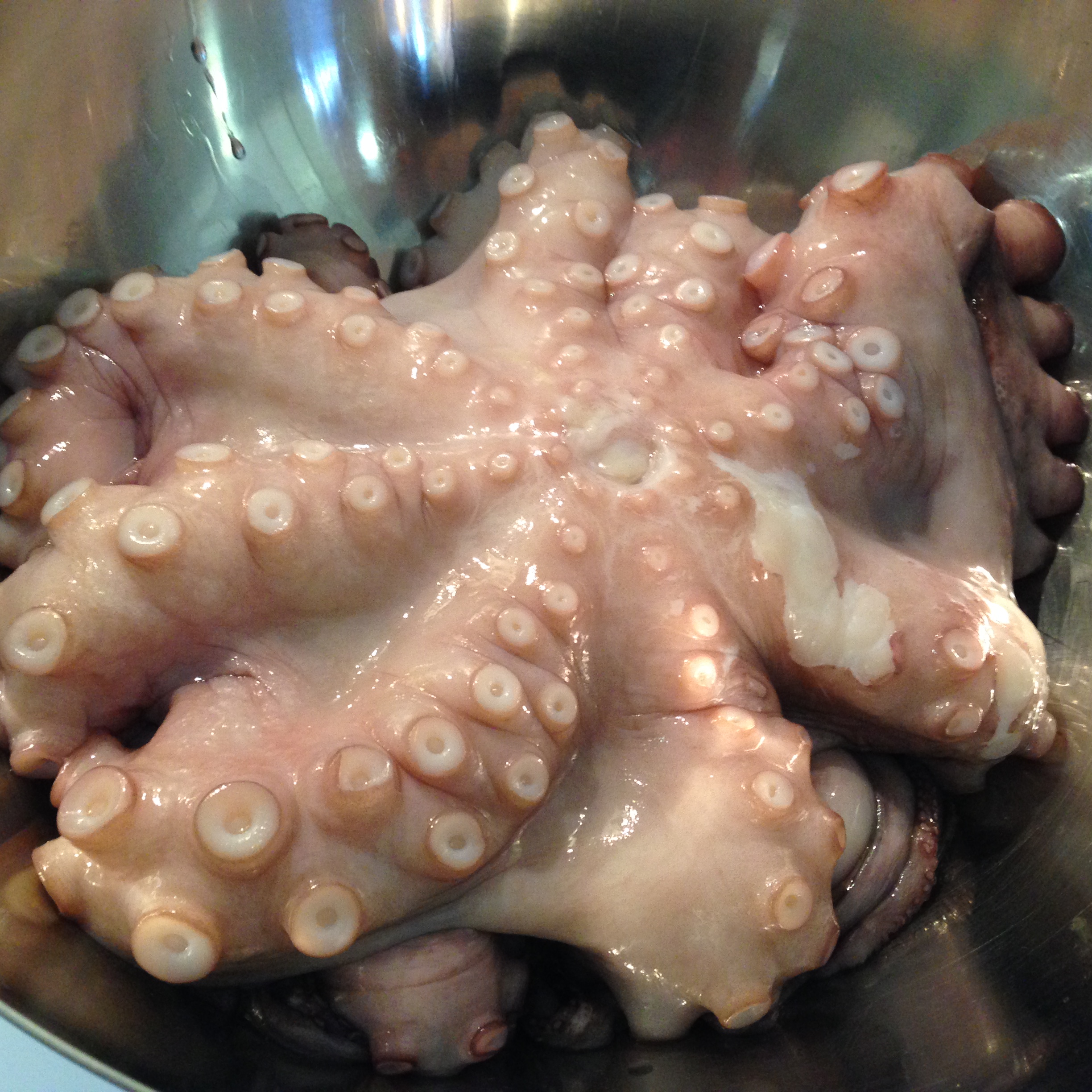 El pulpo lo tenemos limpio: se le ha vaciado la cabeza, le hemos eliminado el pico y, previamente, se ha congelado para romperle las fibras