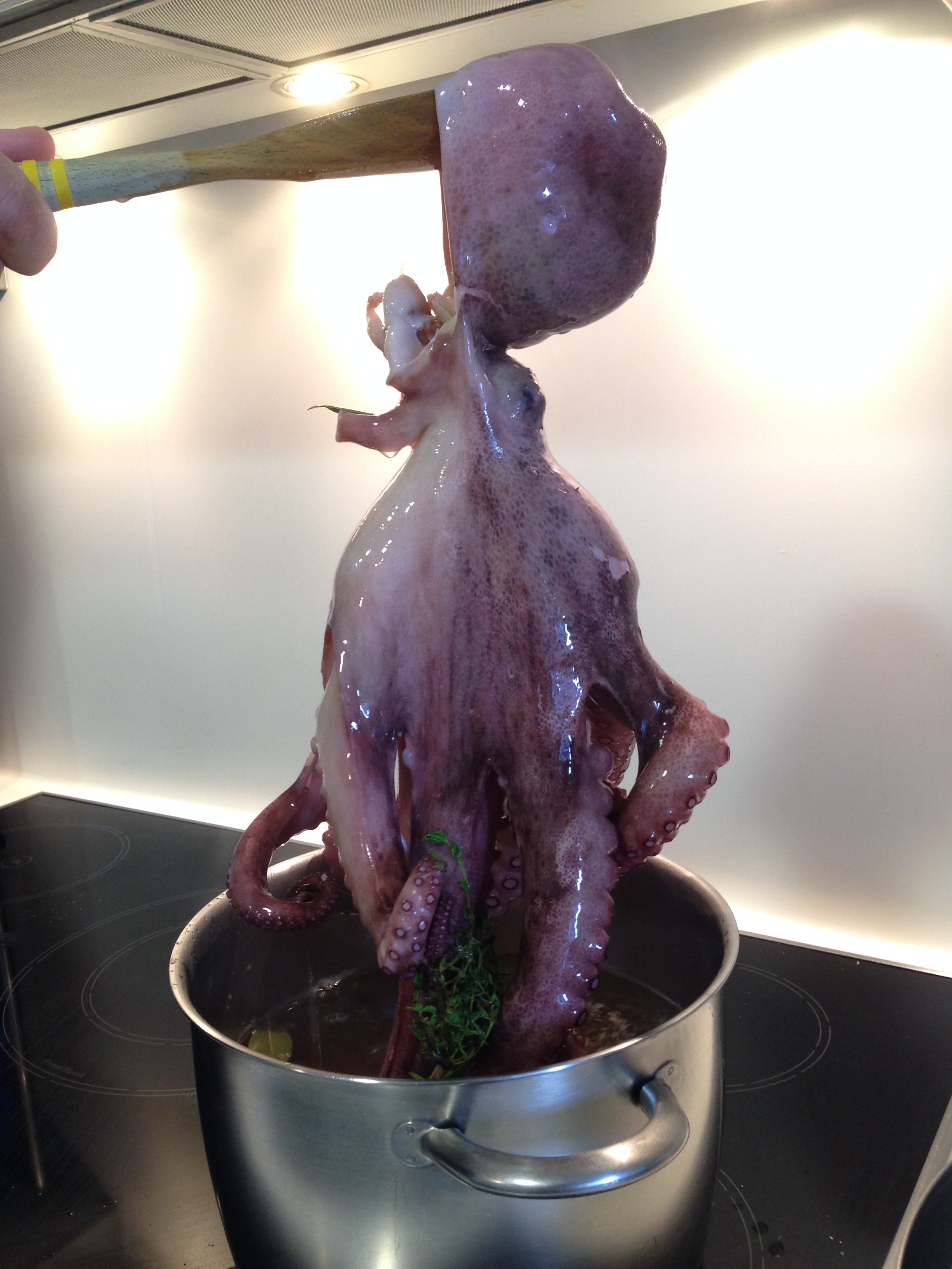 Cuando el agua está hirviendo, introducimos y sacamos tres o cuatro veces el pulpo y luego lo dejamos en una cocción muy lenta, sin ebullición, por espacio aproximado de una hora si bien esto dependerá del tamaño del pulpo, por lo que debemos ir comprobando si está cocido pinchando el mismo.