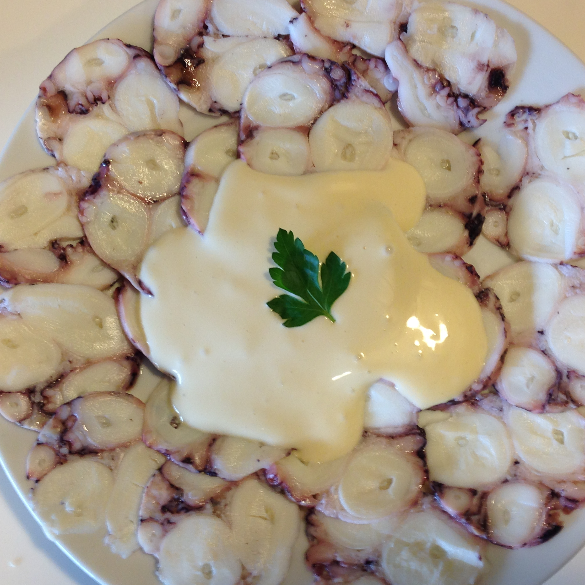 Aquí aparecen distintas maneras de hacerlo y presentarlo, tradicional cortando cada pata, haciendo el montaje en rulo de varias y luego cortadas, en carpaccio con mayonesa, etc