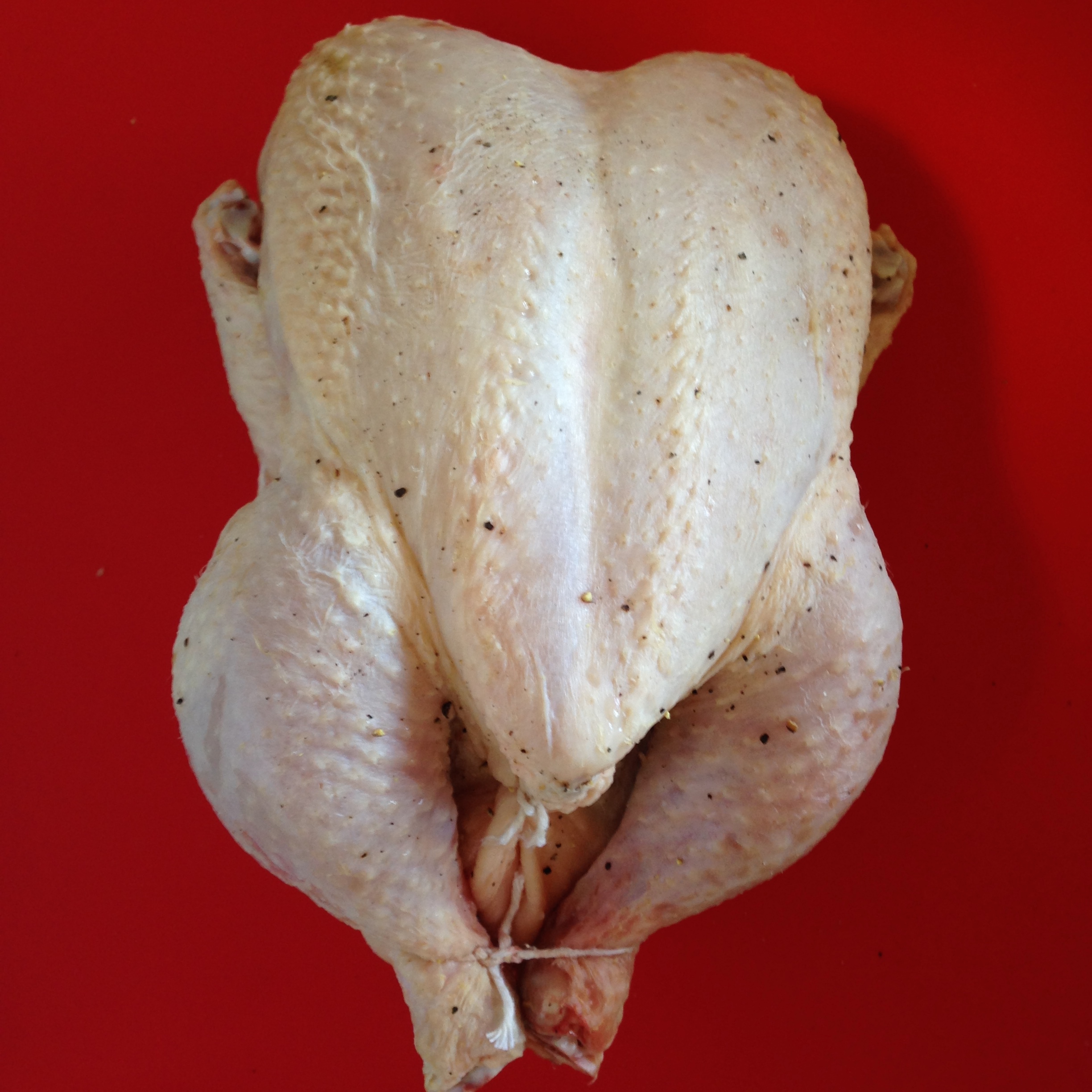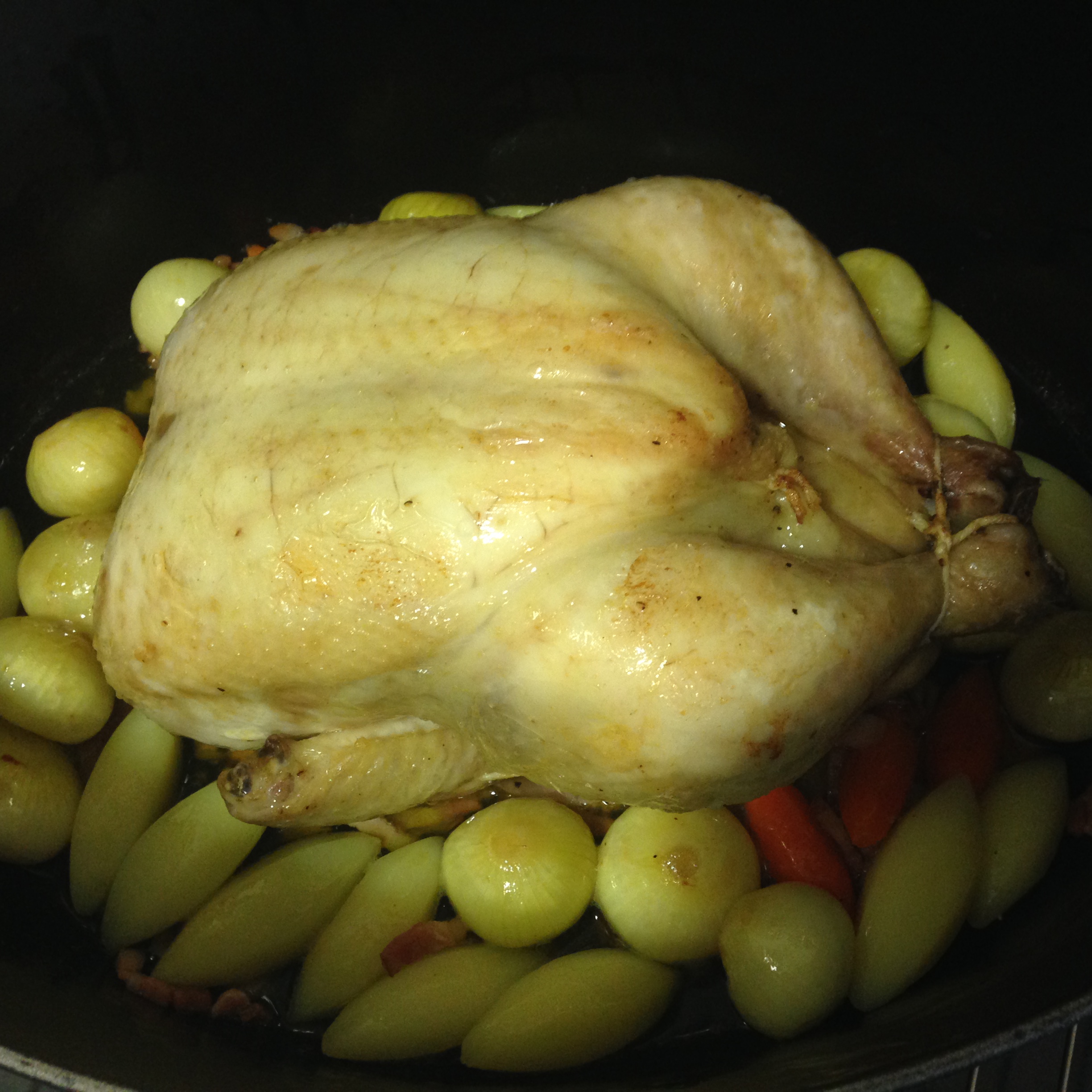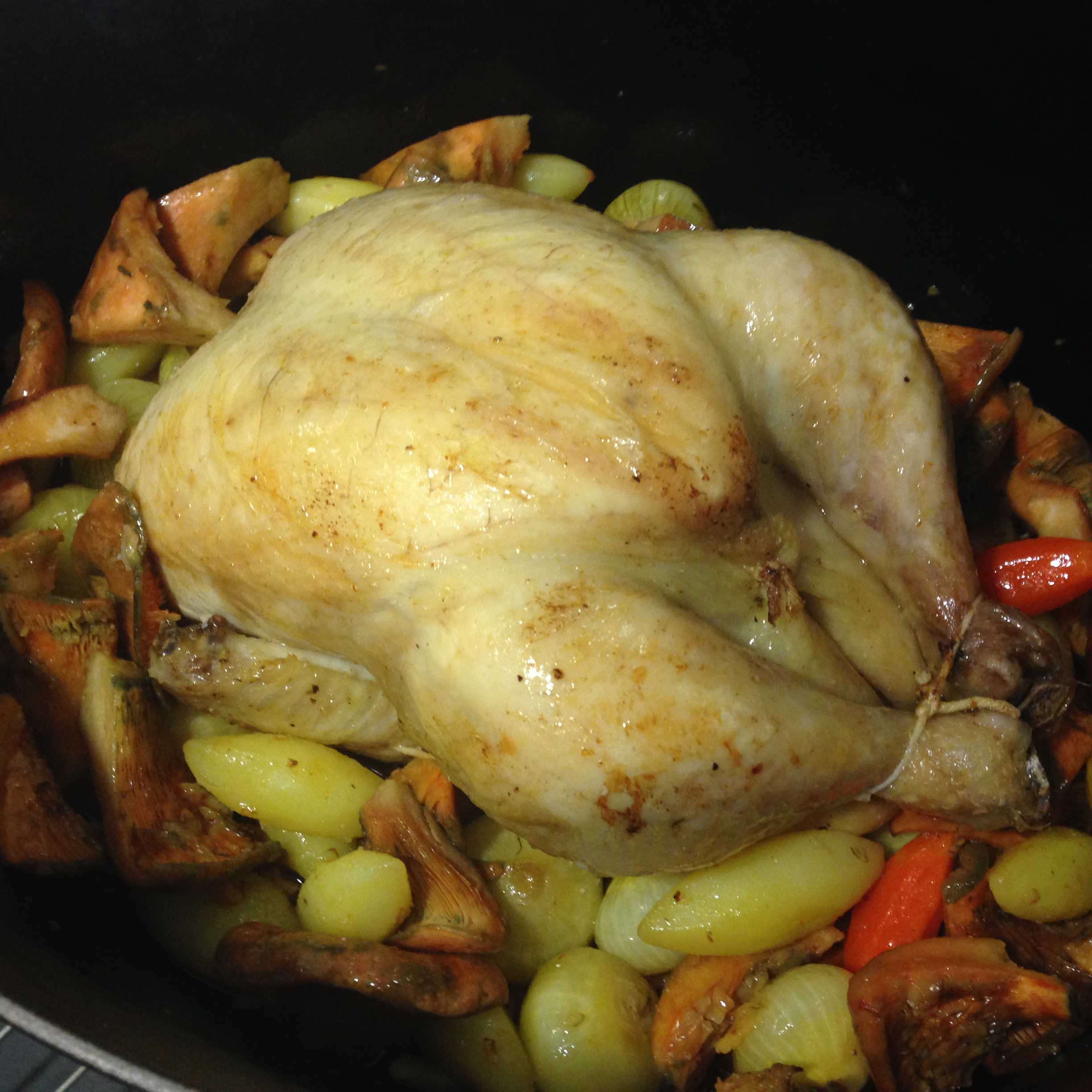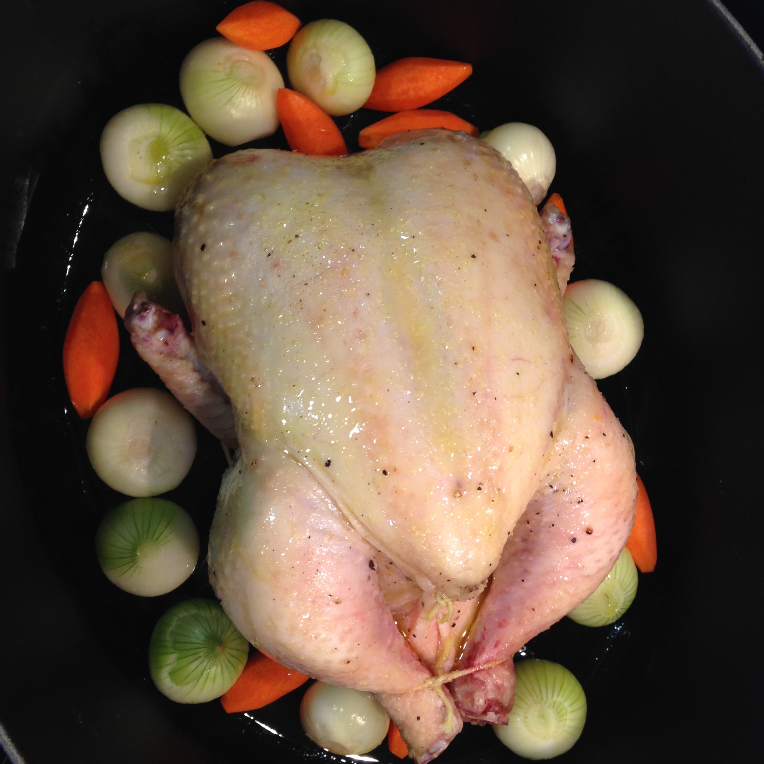 - Preparar el pollo, bridar, salpimentar introducir en la Cocotte, con grasa o aceite de oliva, a 180º en el horno con la Cocotte tapada