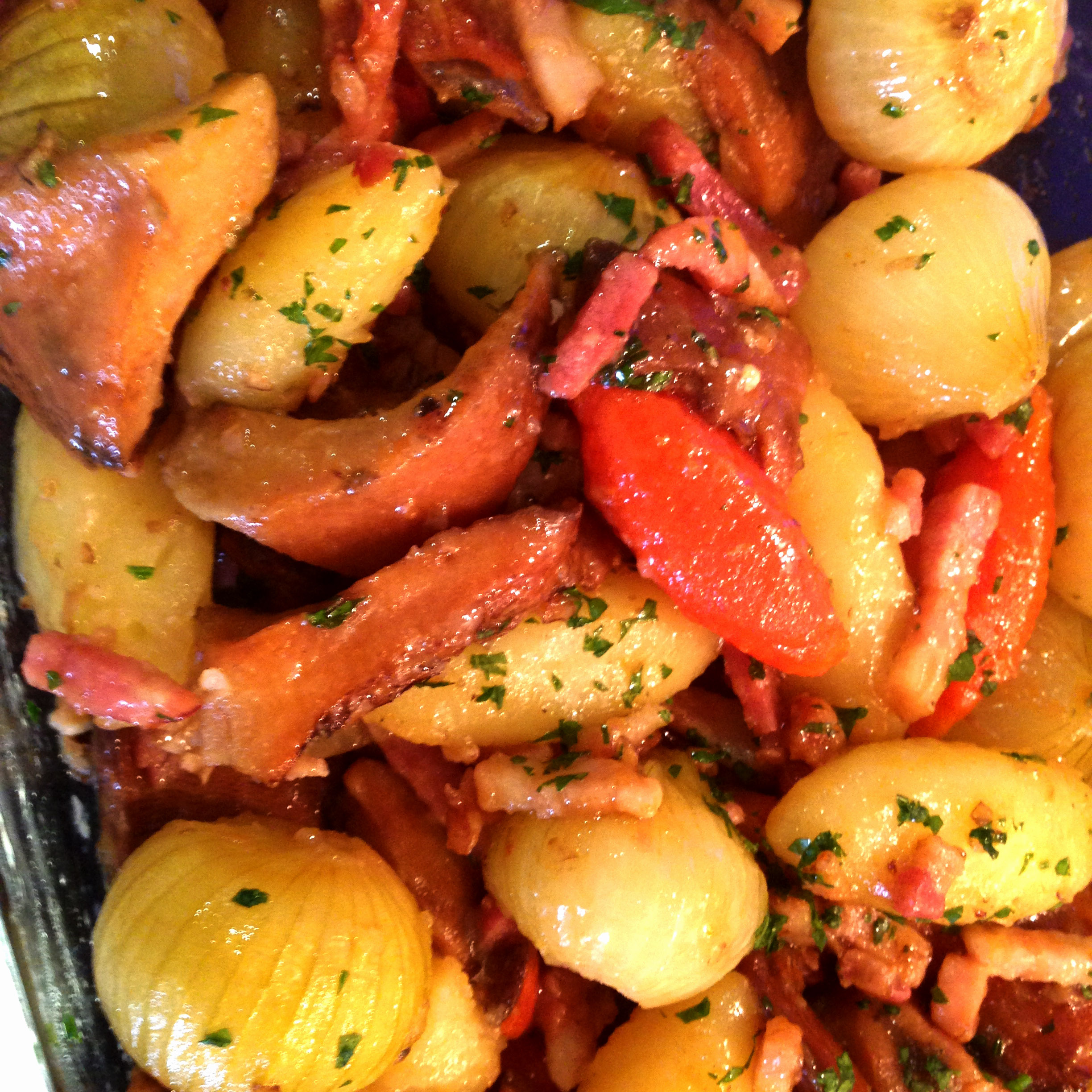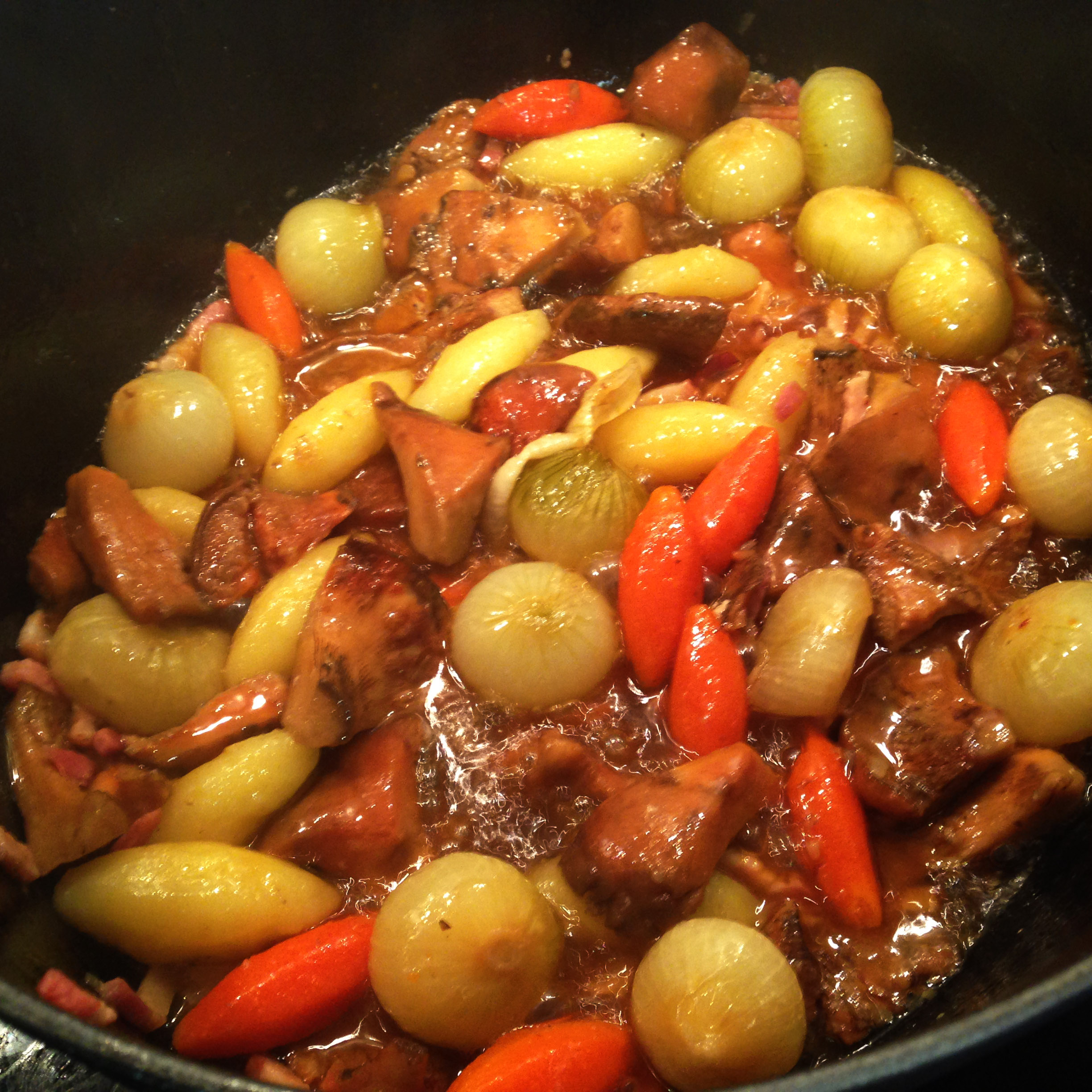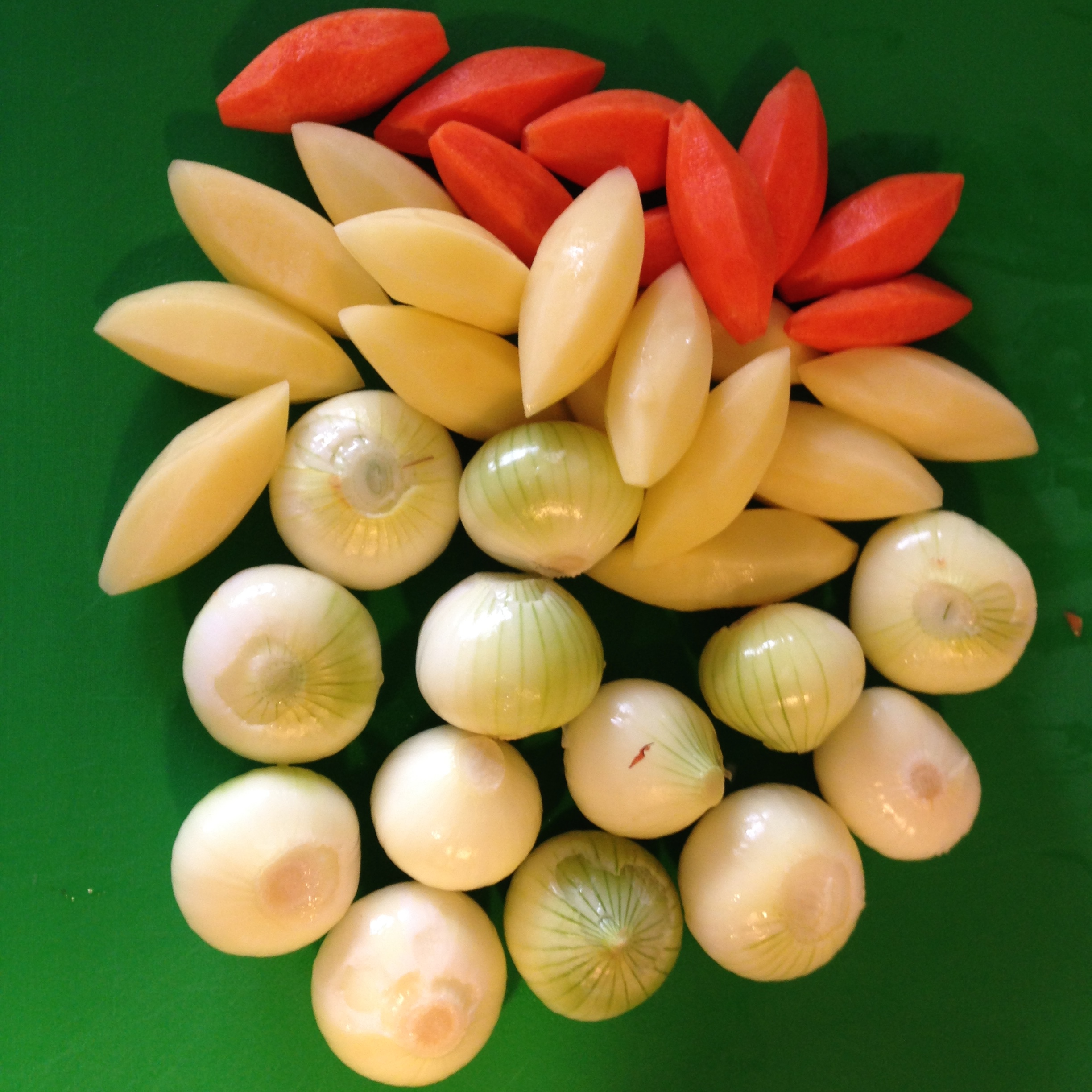 - Preparar las guarniciones, pelar cebollitas, tornear patatas y zanahorias, limpiar y trocear las setas, cortar los lardons de bacon.
