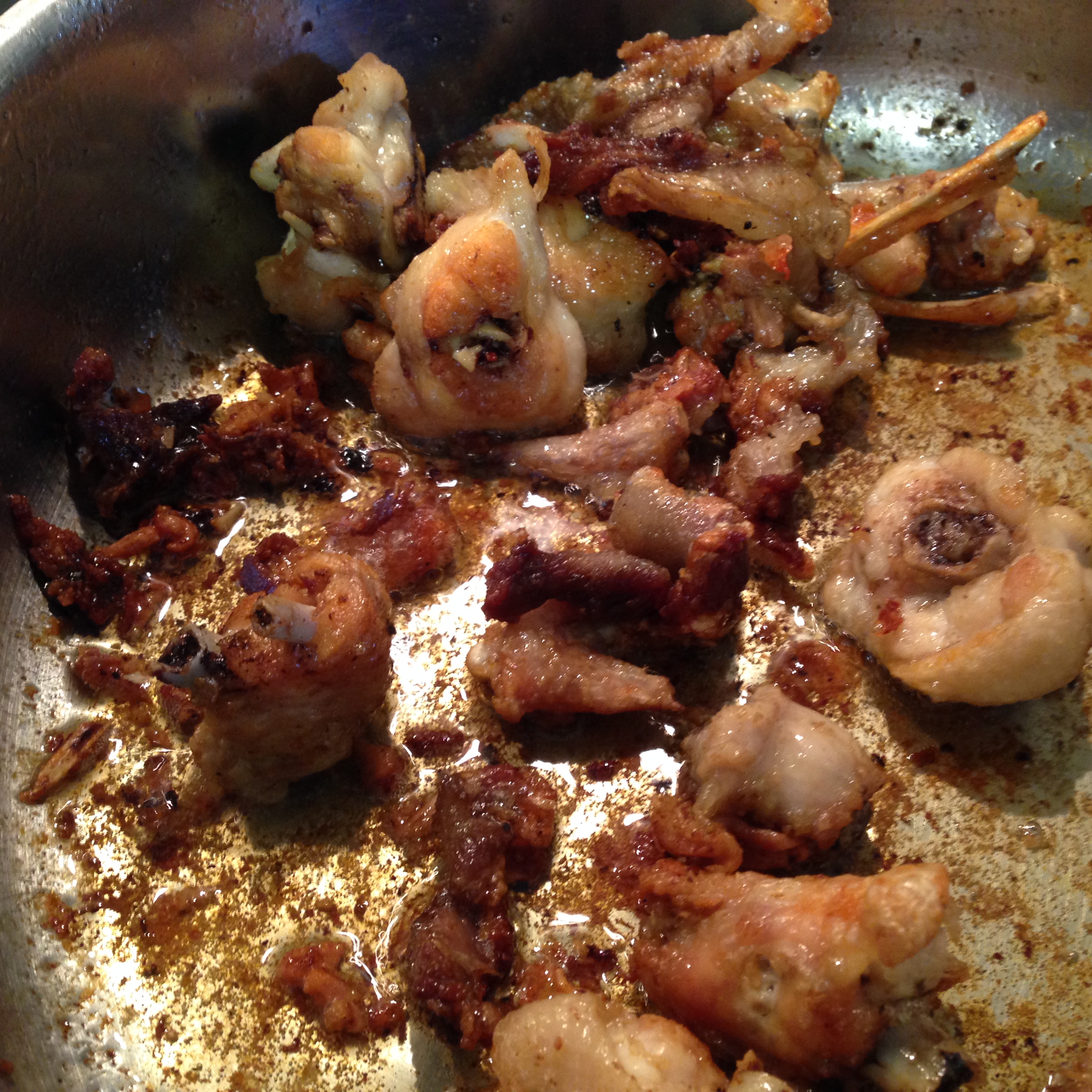 Ponemos en marcha, una vez metido en el horno, el fondo. En una sartén, con un poco de aceite, echamos los recortes y las alas que tenemos, en trozos muy pequeños, para colorearlas y nos irán dejando sucs en la sartén (sucs son los restos que va dejando la carne en el fondo de la cacerola o sartén, que hay que cuidar que no se quemen, y son los que dan sabor). Mientras se doran, preparamos las verduras del fondo.