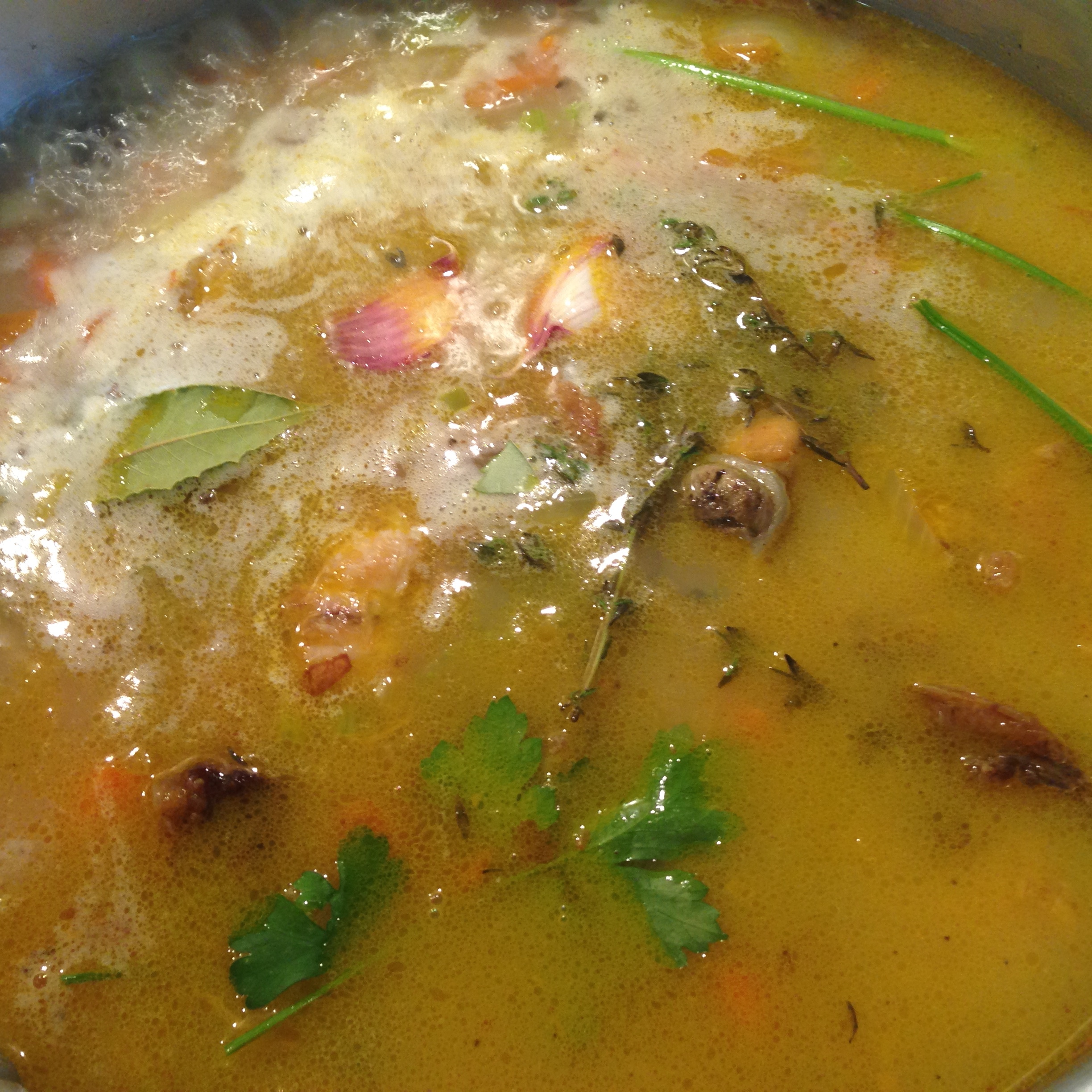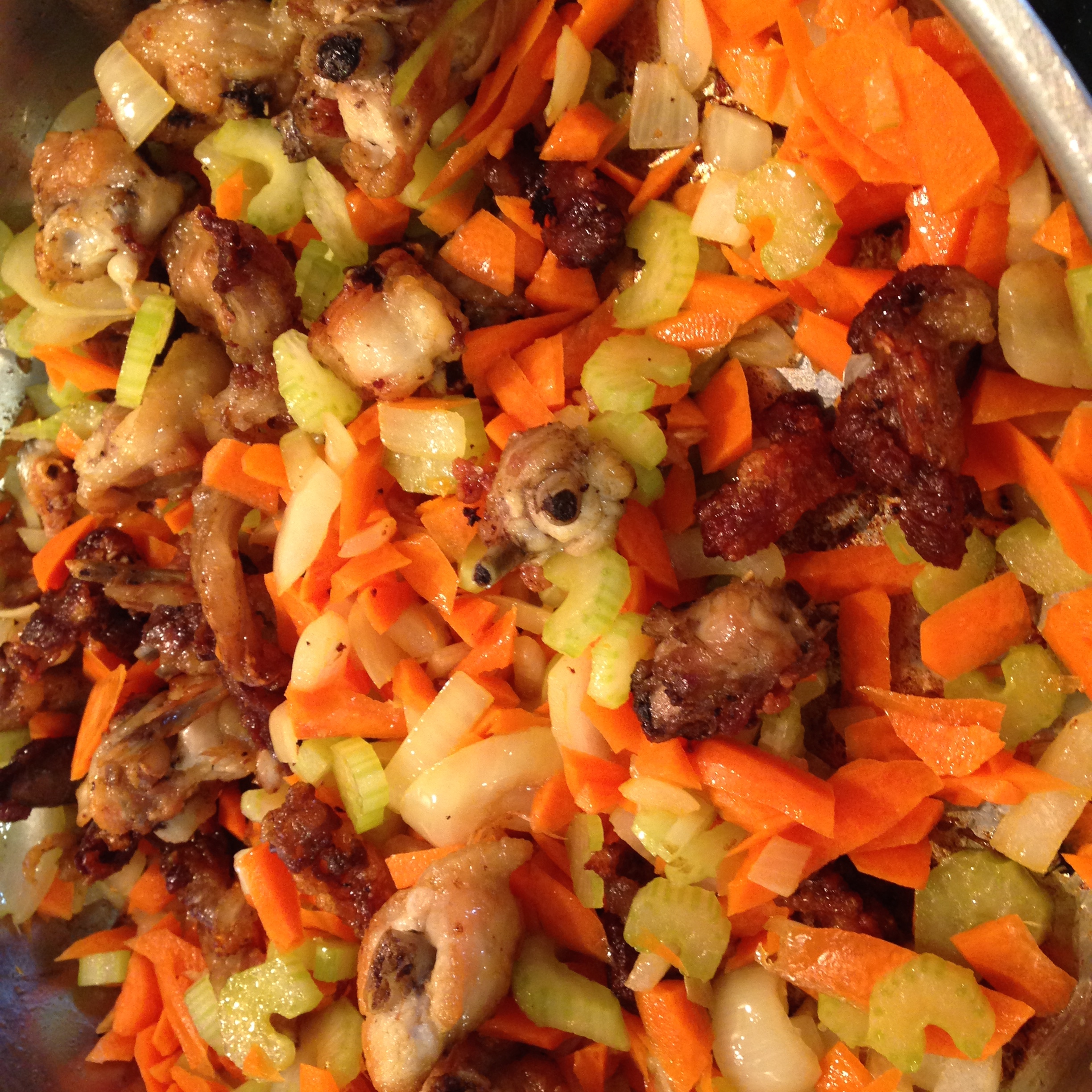 Cuando ya tenemos una buena base de sucs, echamos la cebolla a sudar con una pizca de sal, luego el apio y la zanahoria, las sudamos, les escurrimos el aceite y echamos el vino, para que se suelten los sucs y reducimos a seco. Añadimos entonces el fondo y lo dejamos cocer, primero que hierva y luego bajamos el fuego. Podemos poner, en lugar de fondo de ave, fondo oscuro de ternera que le dará mas cuerpo y fuerza.