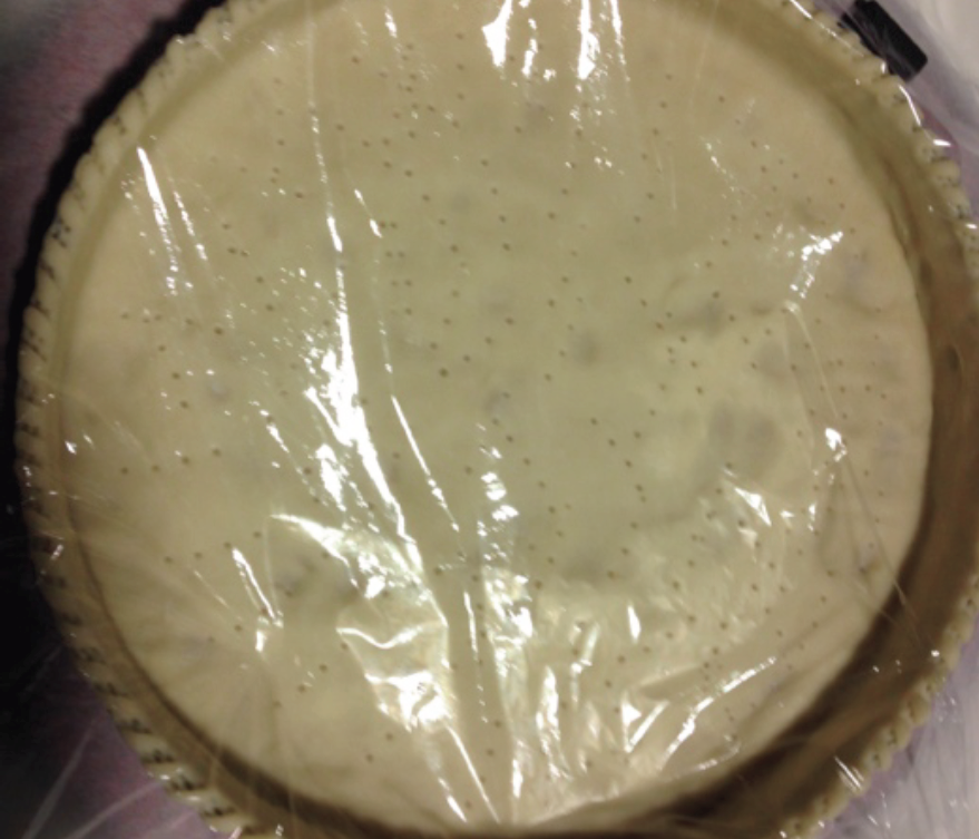 Procedemos entonces a hacer el CHIQUETAGE, con la pinza a CHIQUETER que es una pinza con pequeños dientes, en ese borde de, aproximadamente, tres milímetros que ahora sobresale y que hemos redondeado bien con los dedos. Esto lo hacemos como aparece en la foto, pinchamos el fondo con un tenedor y volvemos a meterlo en la nevera a enfriar.
