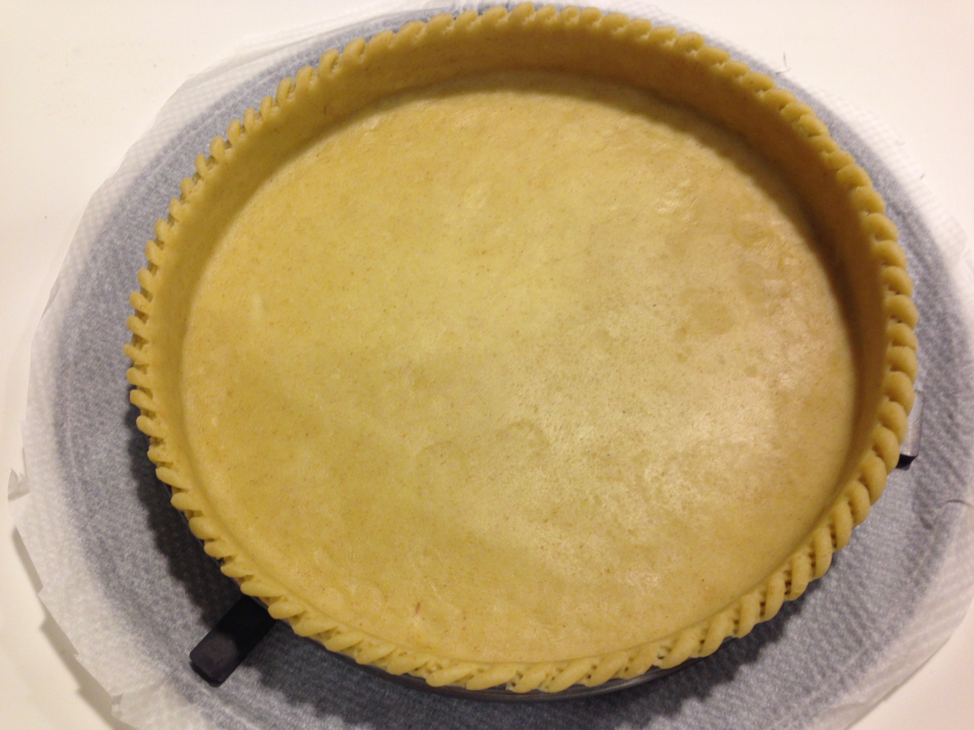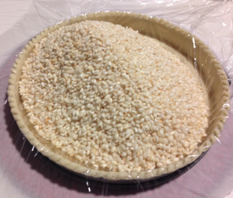 Transcurridos 15 minutos desde que lo pusimos en el horno, lo sacamos. El borde ha empezado a colorear, le quitamos el arroz y lo volvemos a meter otros 5 minutos en el horno.