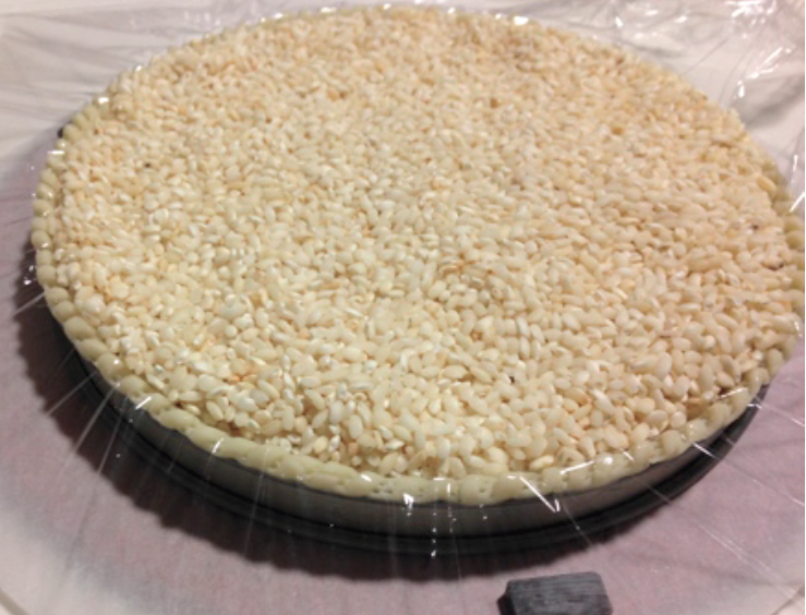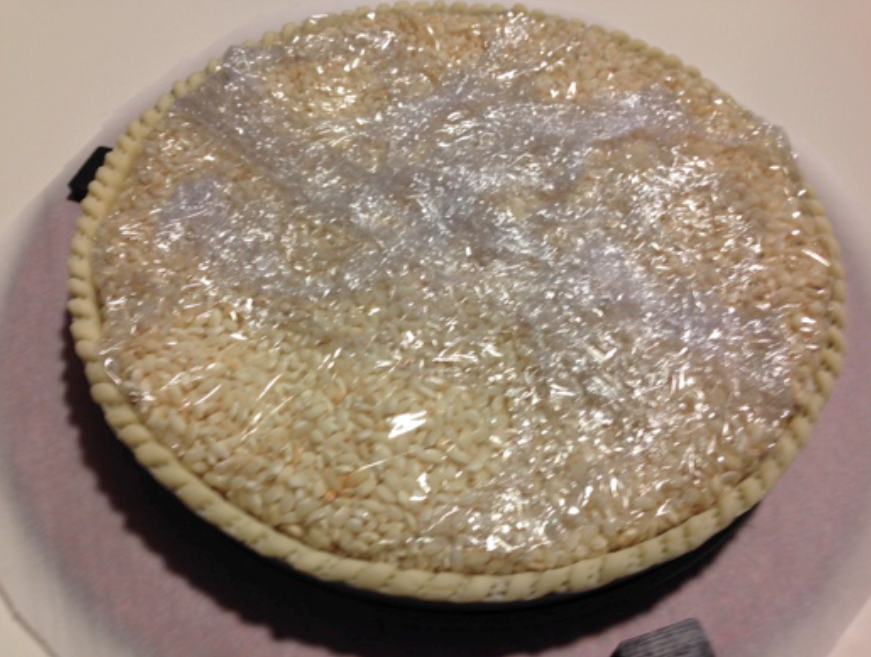 Una vez frío, lo sacamos, ponemos un film adherido en el interior y lo rellenamos de arroz hasta el borde del molde y lo cerramos con film. Tenemos precalentado el horno a 160º y lo introducimos de 15 a 20 minutos.