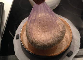 La cocción tardará alrededor de 25 minutos o media hora, dependiendo del horno, que debemos ir controlando. Para saber si está, le damos un pequeño golpe a la bandeja donde está el molde, si tiembla el centro es que aún está crudo, en cuanto deje de hacer eso lo sacamos, desmoldamos con cuidado, le colocamos debajo una blonda dorada y emplatamos en plato limpio.