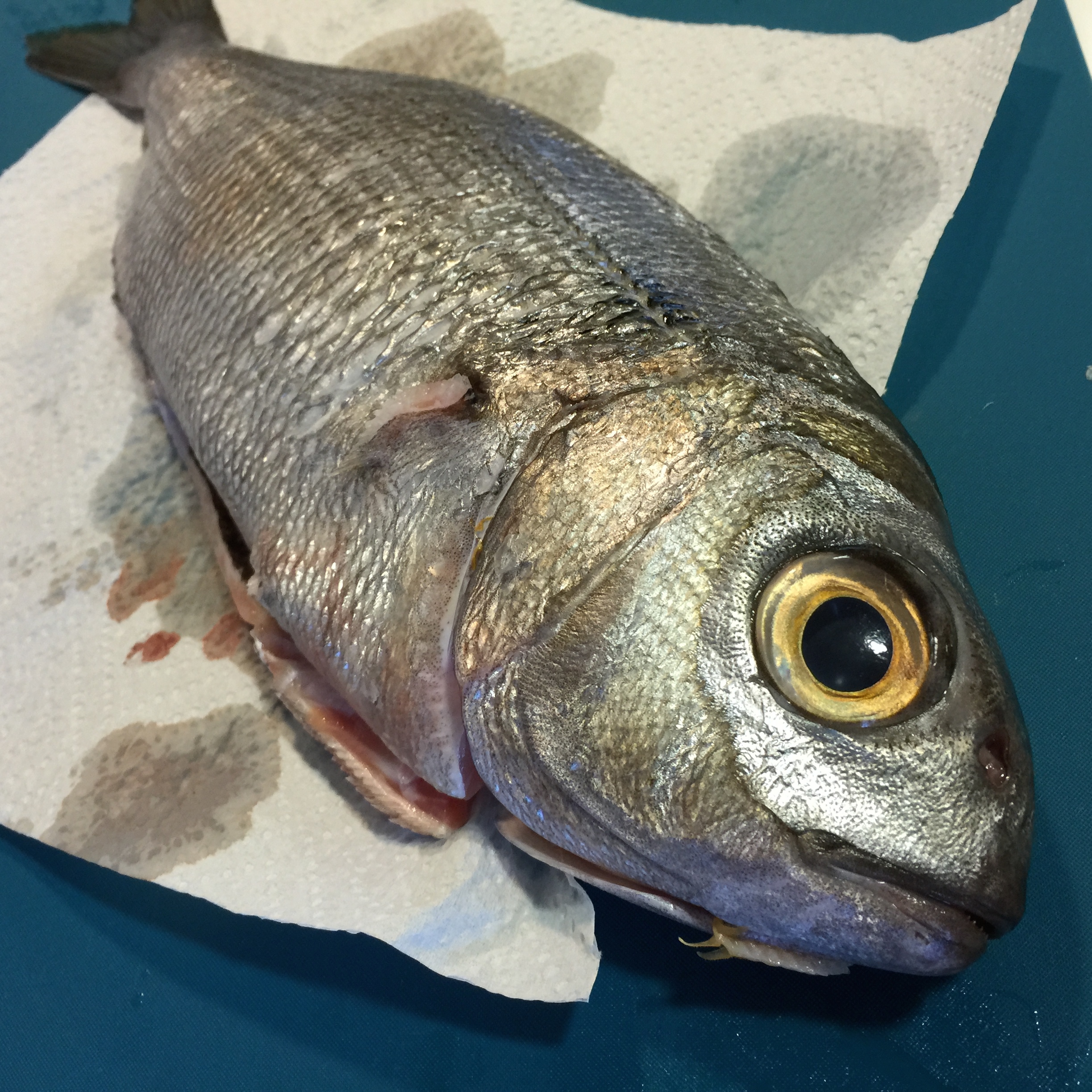 Empezamos por lavar bajo el grifo bien el besugo, eliminando cualquier resto de sangre y/o elemento que no le haya quitado bien de sus vísceras, lo ponemos a escurrir, lo secamos bien por dentro y por fuera con papel de cocina y lo reservamos en la nevera tapado.