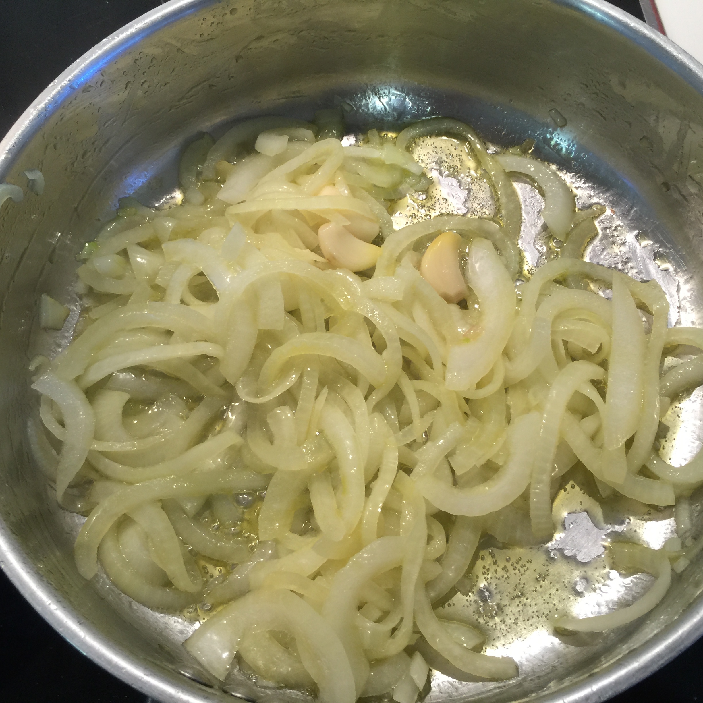 A continuación, pelamos cebolla y la cortamos en rodajas o medias rodajas, ponemos una sartén con aceite de oliva y echamos esta cebolla a que poche un poco. Mientras tanto, pelaremos los ajos, las patatas y cortaremos éstas en rodajas desiguales para panadera.