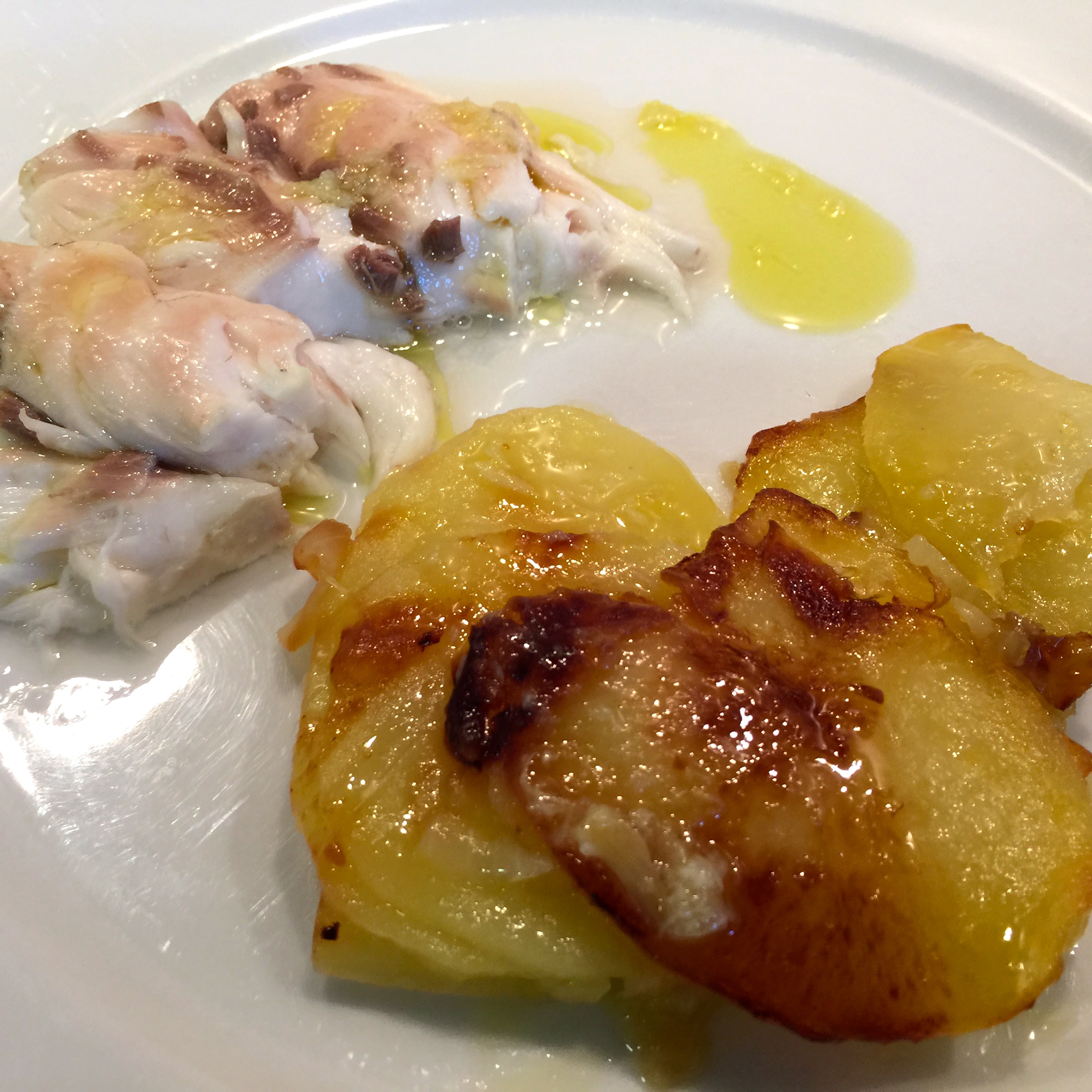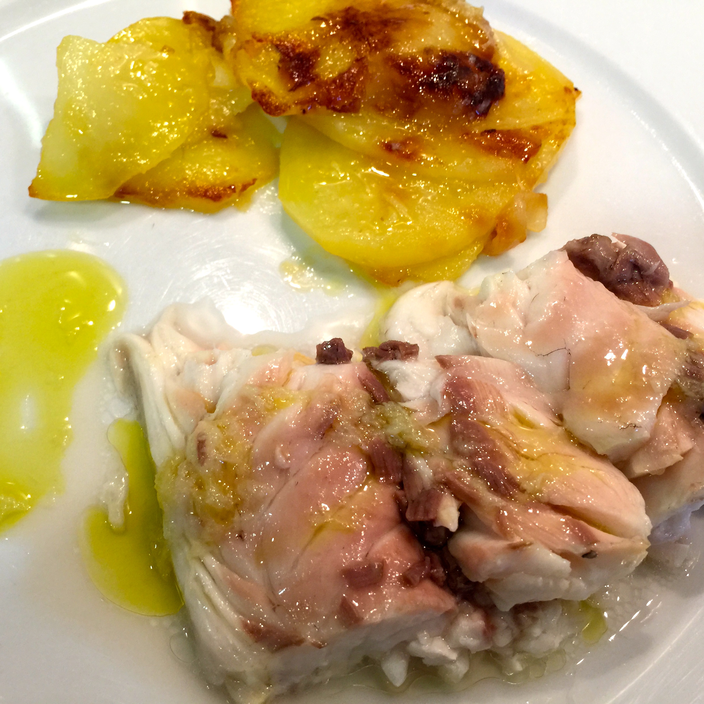 Con los ajos que reservamos haremos un aderezo: los aplastamos bien hasta que queden como un puré, le añadimos un poco de aceite de freir las patatas (si no tenemos, podemos coger del que nos quedará en el fondo de la fuente del asado), lo mezclamos bien y le añadimos unas gotas de vinagre de vino y un poco de sal. Con esta mezcla, pincelamos la carne del pescado cuando la servimos. Si no, tan sólo le ponemos un chorrito de aceite de oliva virgen extra.