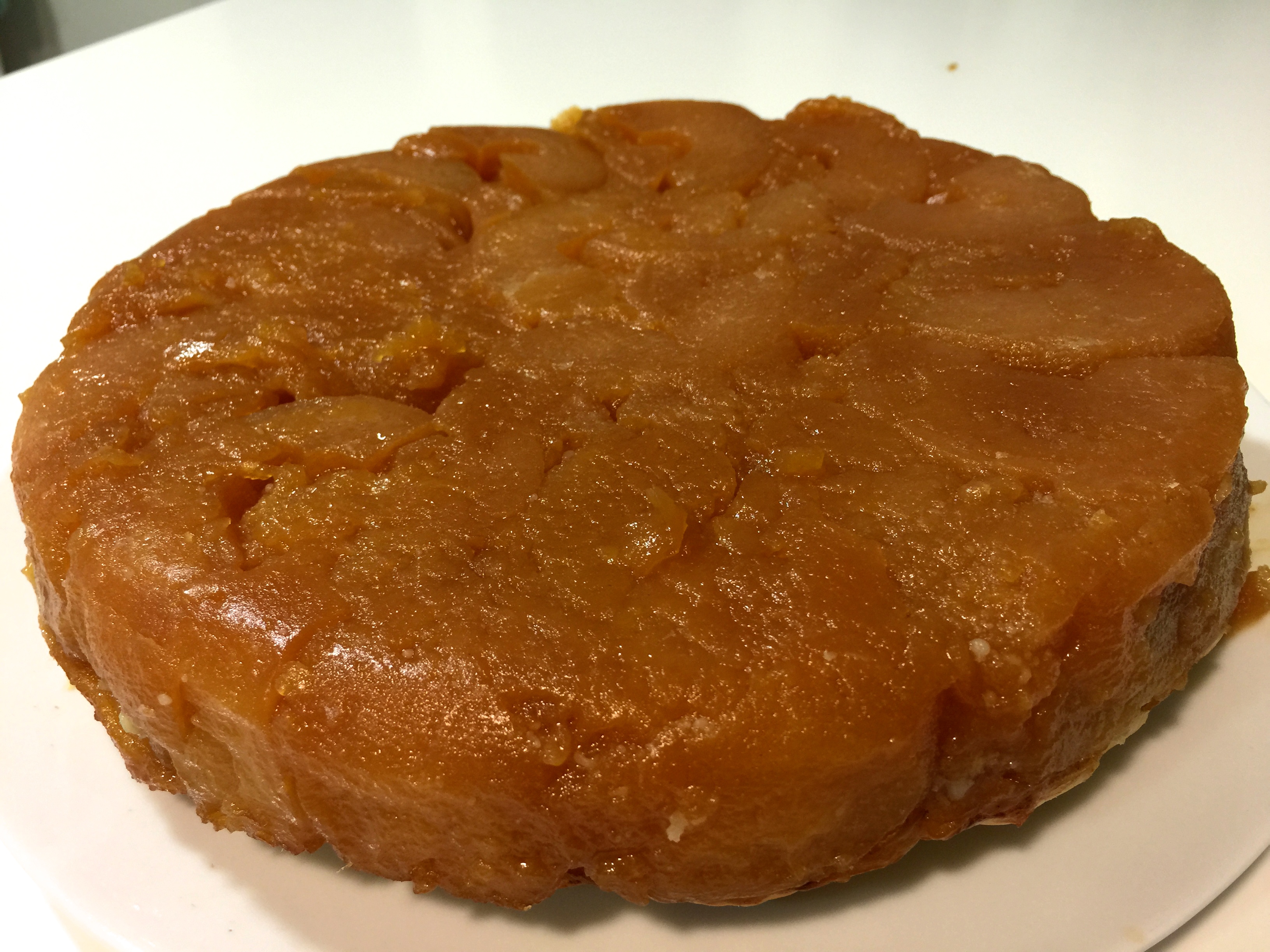 La sacamos y la metemos en el horno a 170-180º. Cuando la masa esté dorada, la sacamos y la dejamos enfriar. Para sacarla, pasaremos un cuchillo por el borde y le daremos la vuelta sobre el plato de manera que nos quedará la masa en el lado del plato y la manzana arriba ya que es una tarta invertida.