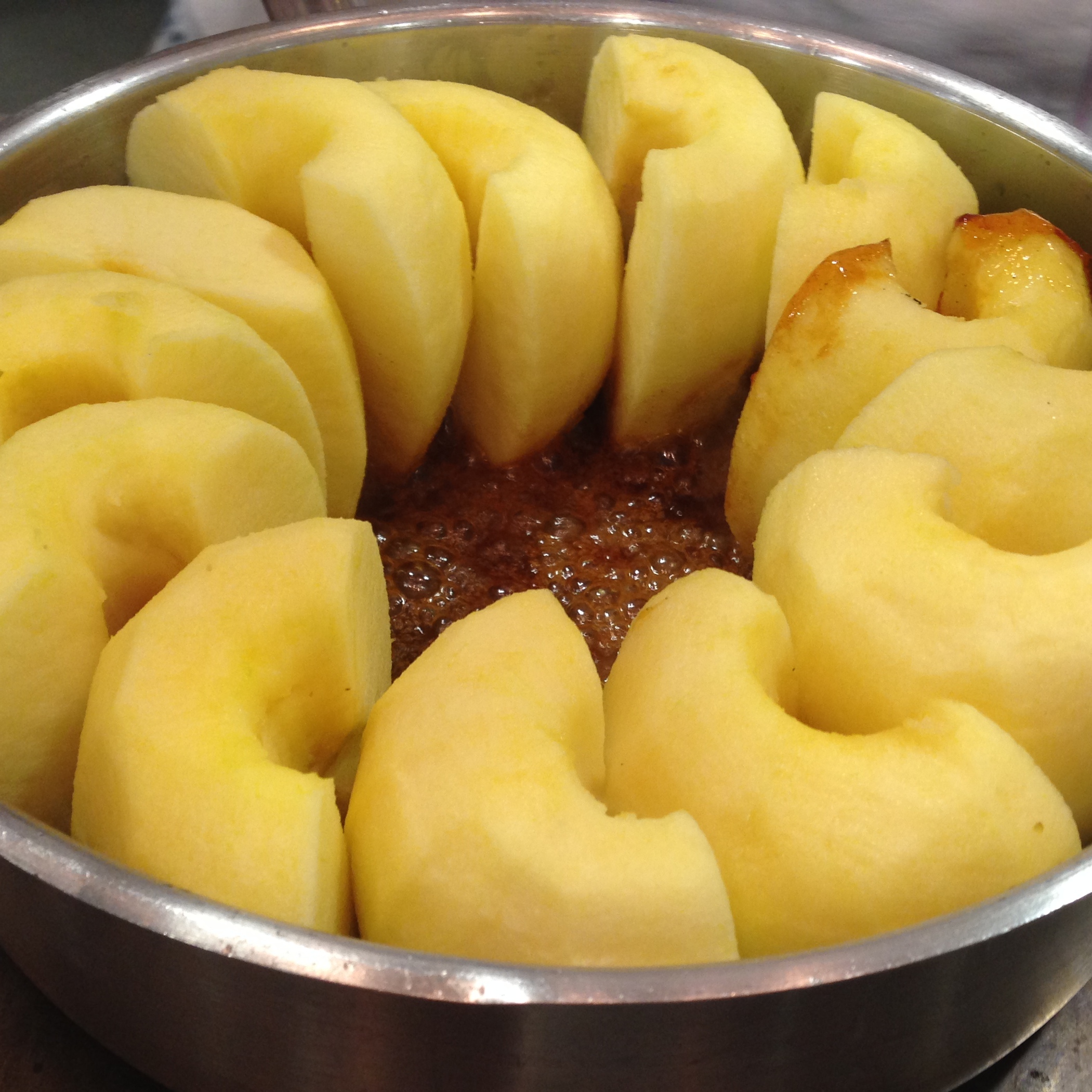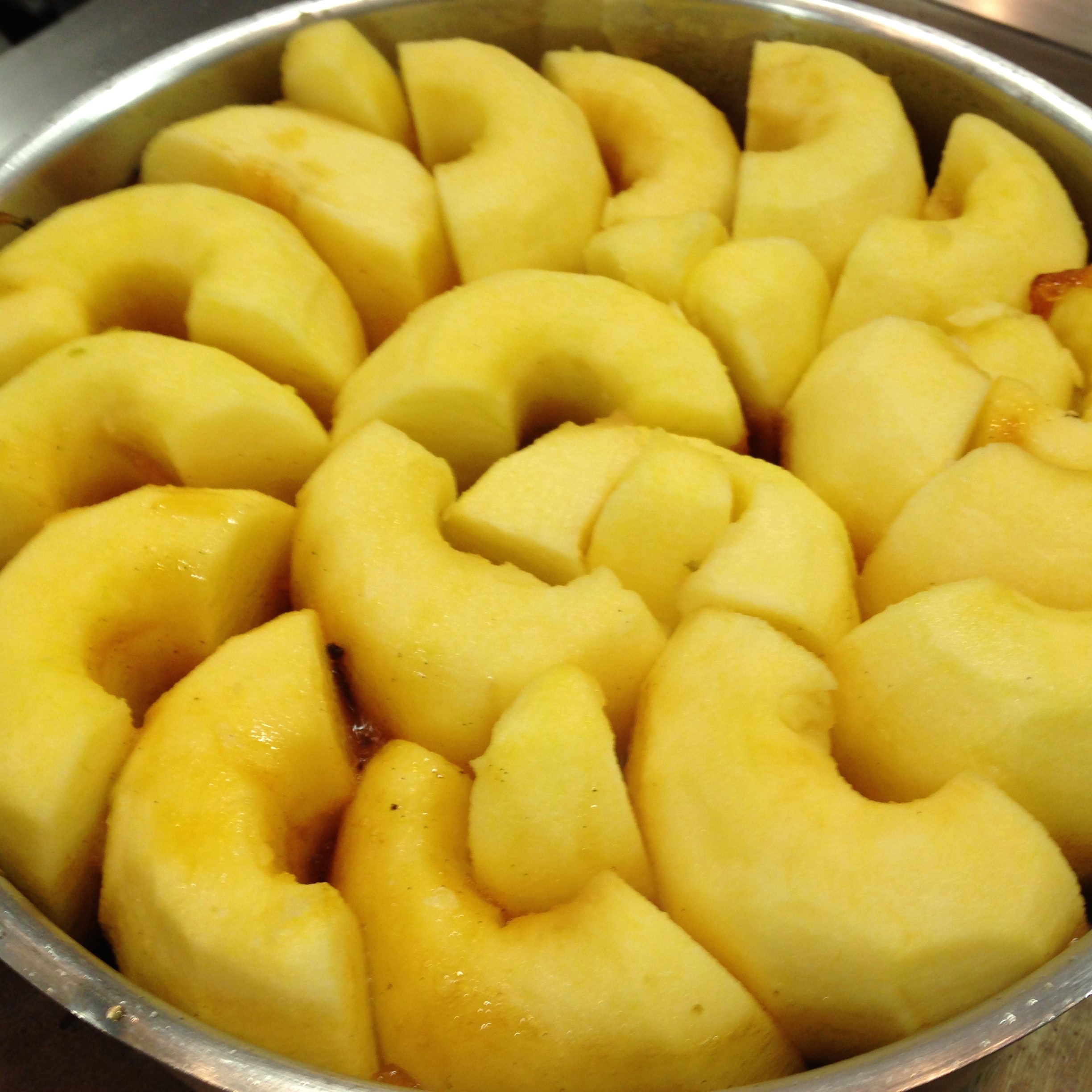 Colocamos entonces, ordenadamente, las mitades de las manzanas, presionando una sobre la siguiente hasta ir cerrando el círculo y luego el hueco intermedio procurando no dejar huecos y metiendo cortes más pequeños en los huecos que veamos. Todo ello con el fuego más lento. Cuando el caramelo con el líquido de las manzanas empiece a subir, la metemos en el horno a 170º y la vamos controlando y macizando si fuese necesario. Cuando están ya hechas las manzanas, la dejamos enfriar. Tiene que estar bastante fría para poner el hojaldre porque la masa tiene bastante mantequilla y necesitamos la base fría.