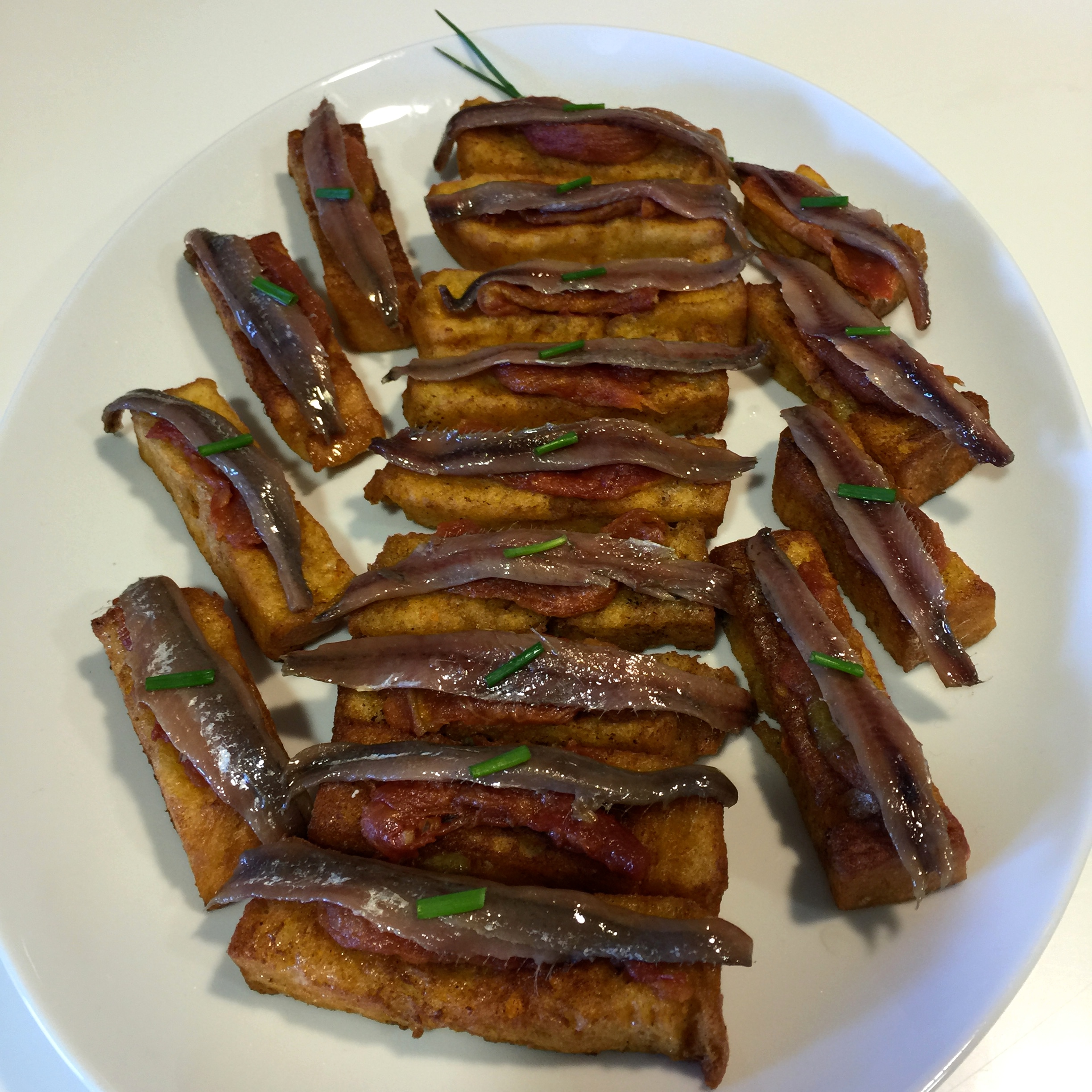 Además de estas anchoas, y con la misma receta, puse en las mini-torrijas partidas por la mitad jamón. La torrija templada hacía sudar un poco el jamón templándolo y estaba buenísimo.