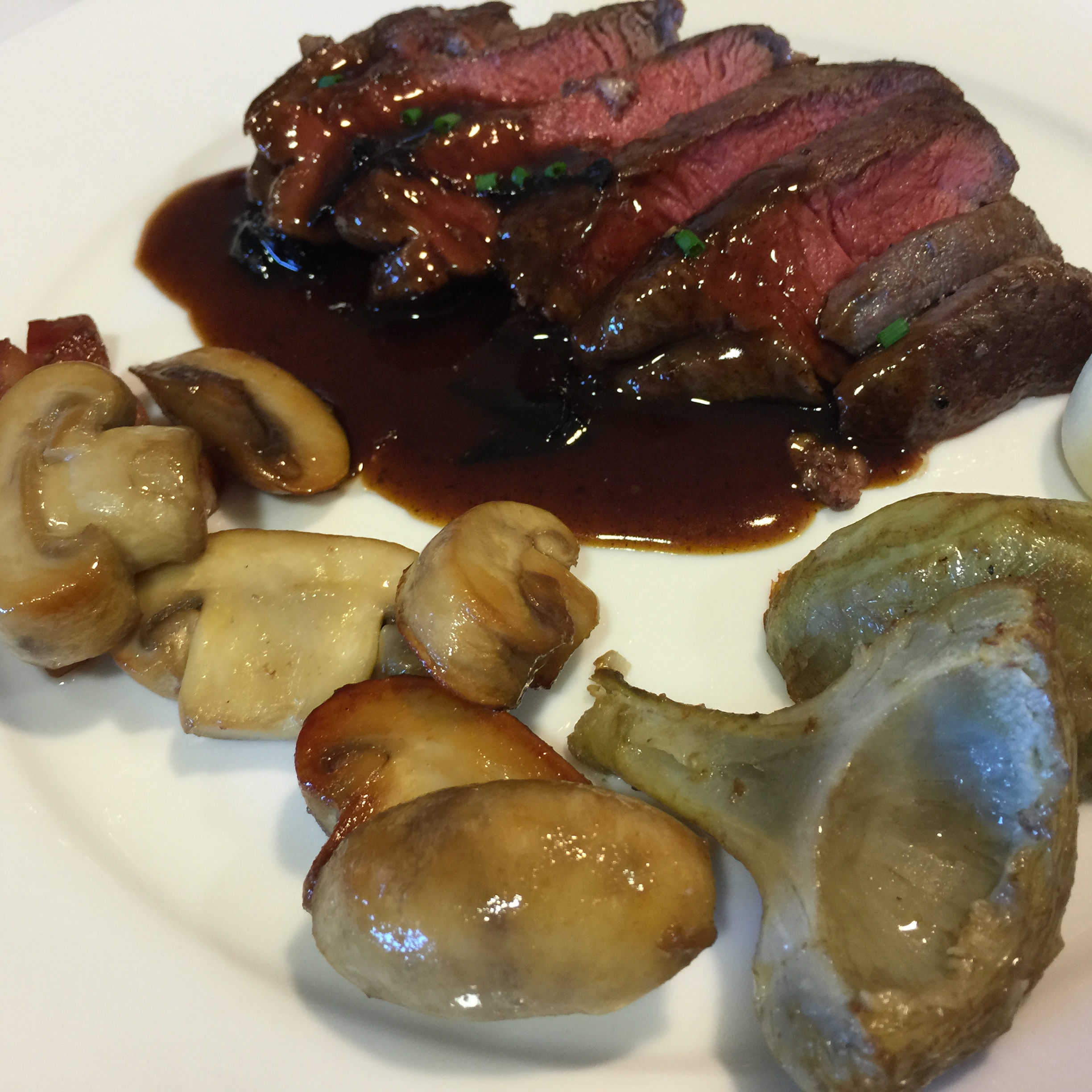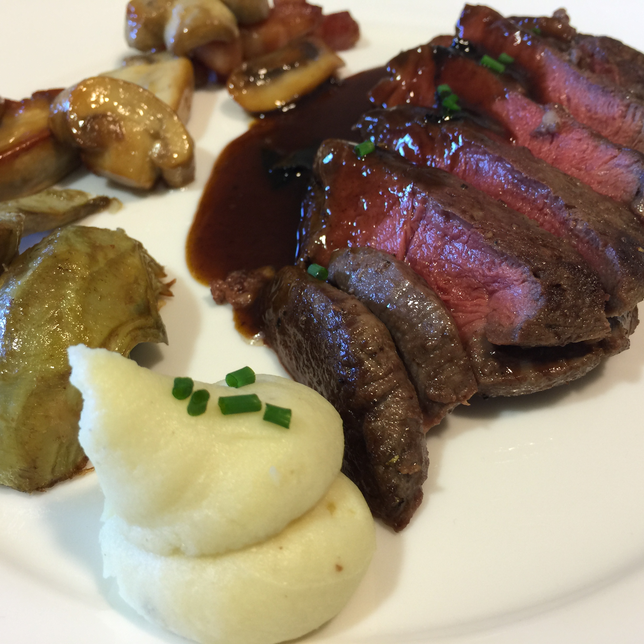 En este momento es cuando empezamos a acabar de limpiar y porcionar el solomillo, con la salsa ya lanzada, troceamos sirviéndonos de guía las cuerdas del bridado.