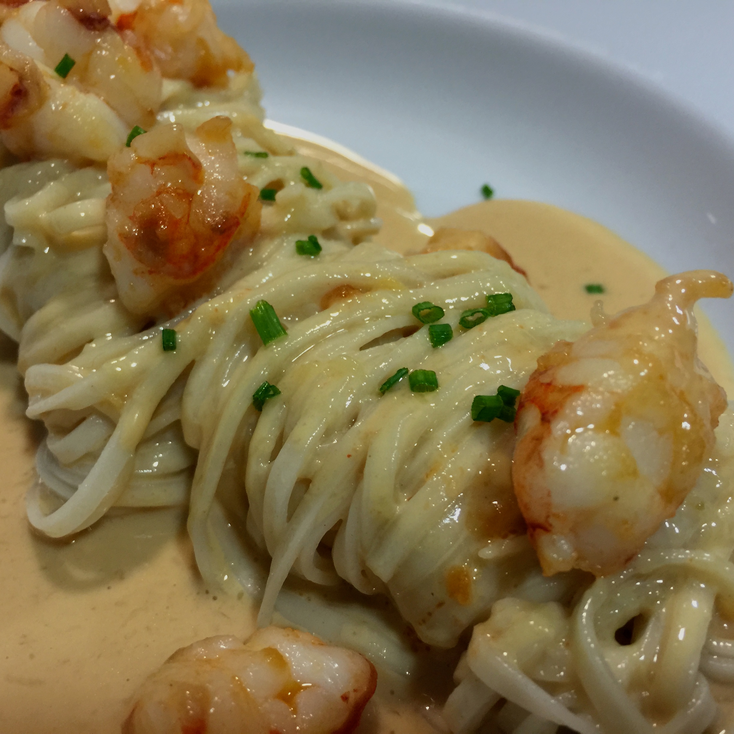 Ponemos un poco de aceite de oliva en una sartén y, cuando esté caliente, echamos las cabezas, las sofreímos y aplastamos para que suelten todo su jugo. Cuando estén doraditas, les echamos la leche y lo dejamos todo cocer a fuego lento durante diez minutos. Pasado este tiempo, lo pasamos por el chino fino, aplastando las cabezas, volvemos a pasarlo a la sartén, le incorporamos la nata y dejamos que evapore un poco. A continuación, le incorporamos el queso hasta que se deshaga, la rectificamos de sal y pimienta y, fuera del fuego, le incorporamos las yemas prácticamente cuando vayamos a servir porque enfriarán algo la salsa.