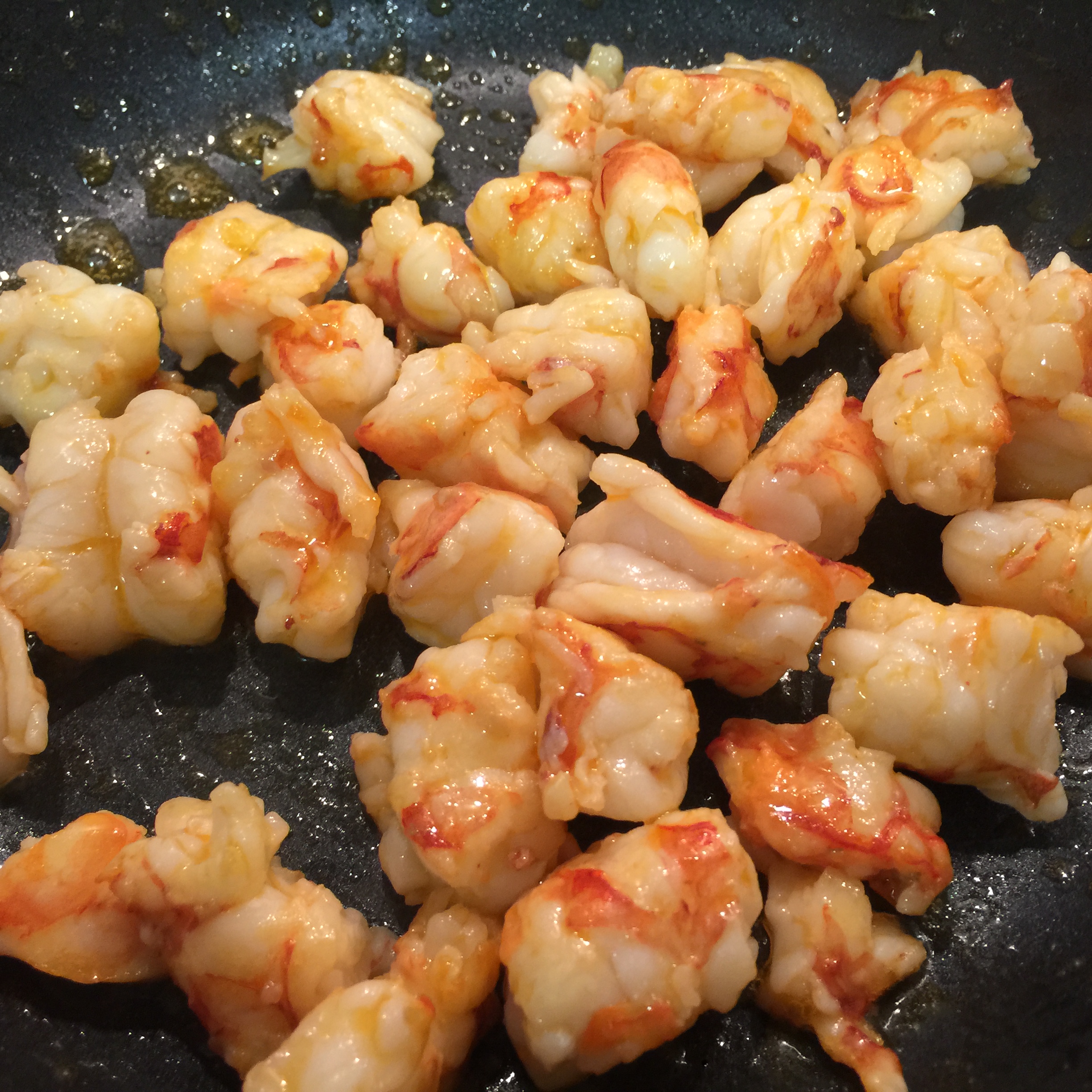Los cuerpos de los langostinos los salteamos y reservamos.