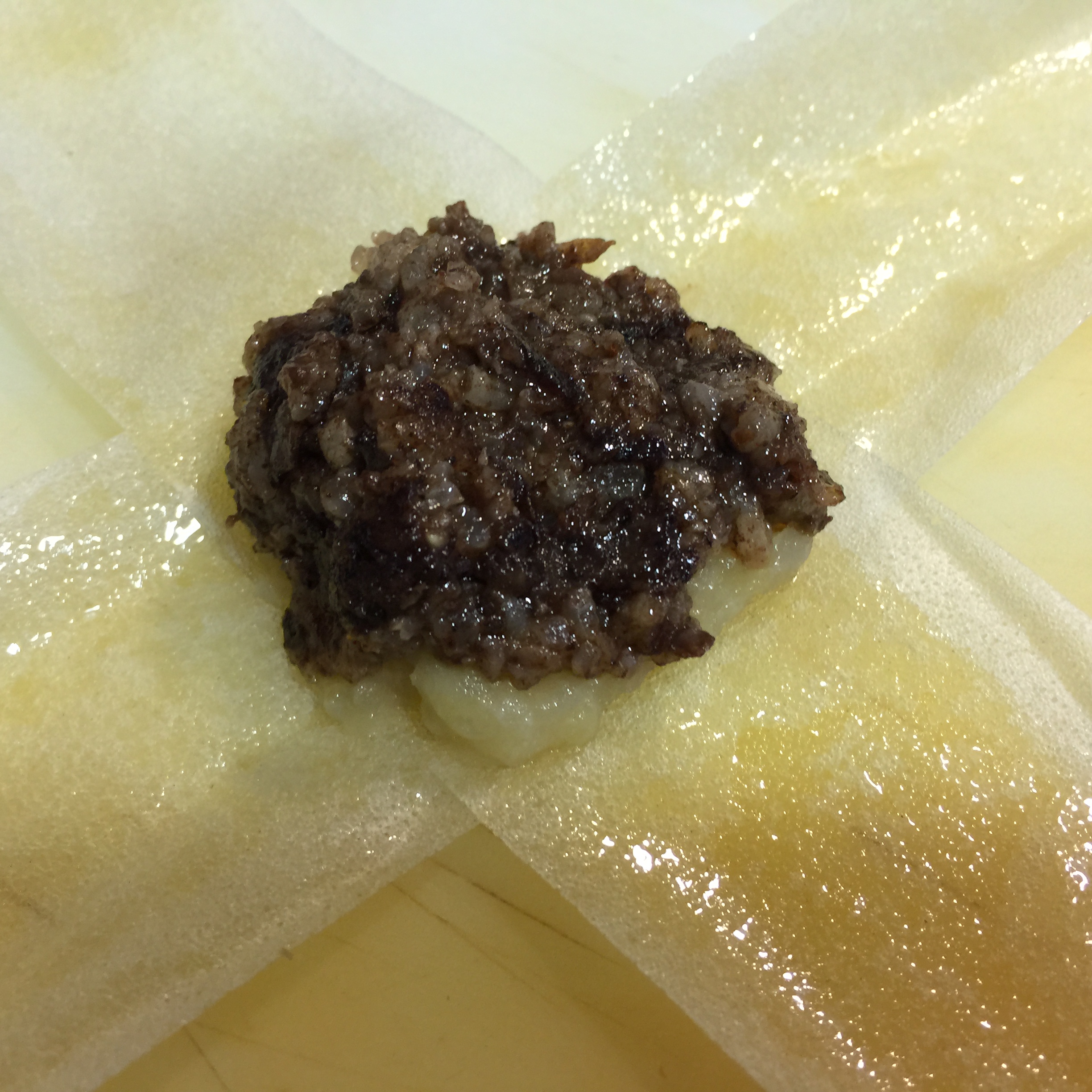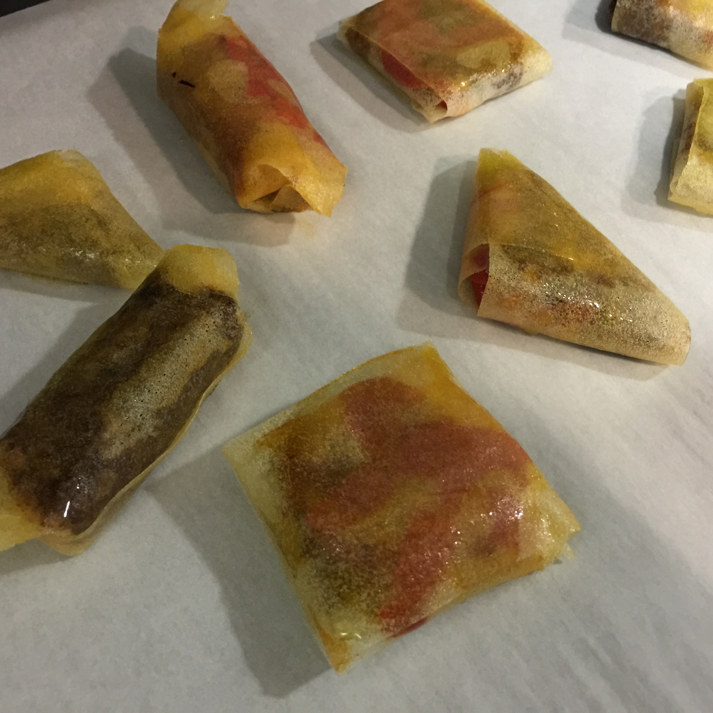 Una vez que tienes esa técnica, nada te impide hacerlos de otras cosas, por ejemplo un puré de patatas con un poquito de pimentón de la Vera, aceite de oliva virgen y un trocito de pulpo, un taquito de bonito al que le has dado un poquito de calor en la sartén con un poco de pisto o tomate frito, una Duxelle de setas, etc… Hay mil cosas que se pueden meter dentro y sorprender a tus comensales.