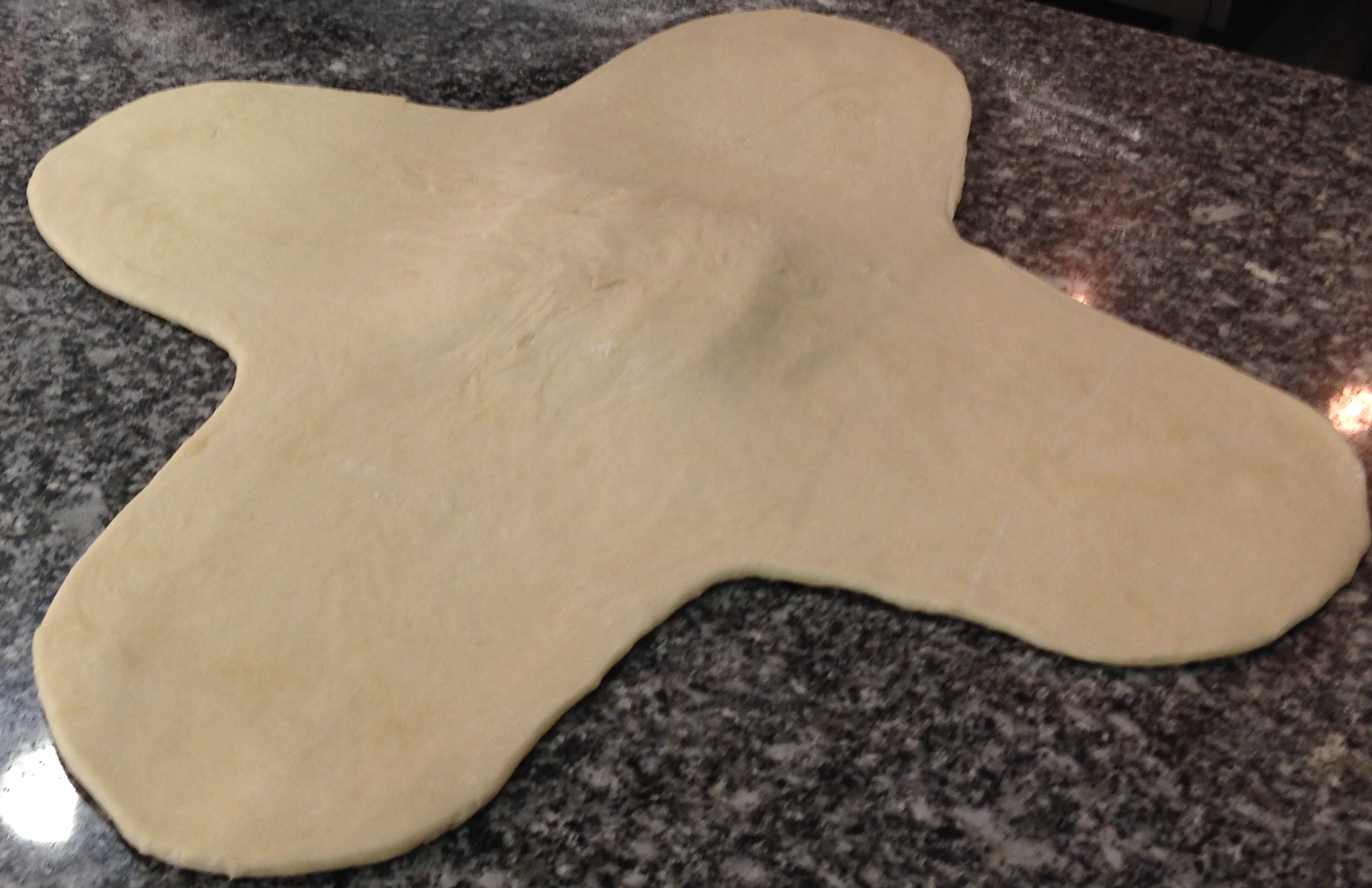 En ese momento, sacamos la masa y la extendemos regularmente en cruz, aprovechando los cortes que hemos hecho a la bola, hasta que, en el interior de esa cruz, nos entre la mantequilla que hemos aplastado y cada uno de los lados, superpuestos encima como aparece en el esquema, nos la cierren por arriba.