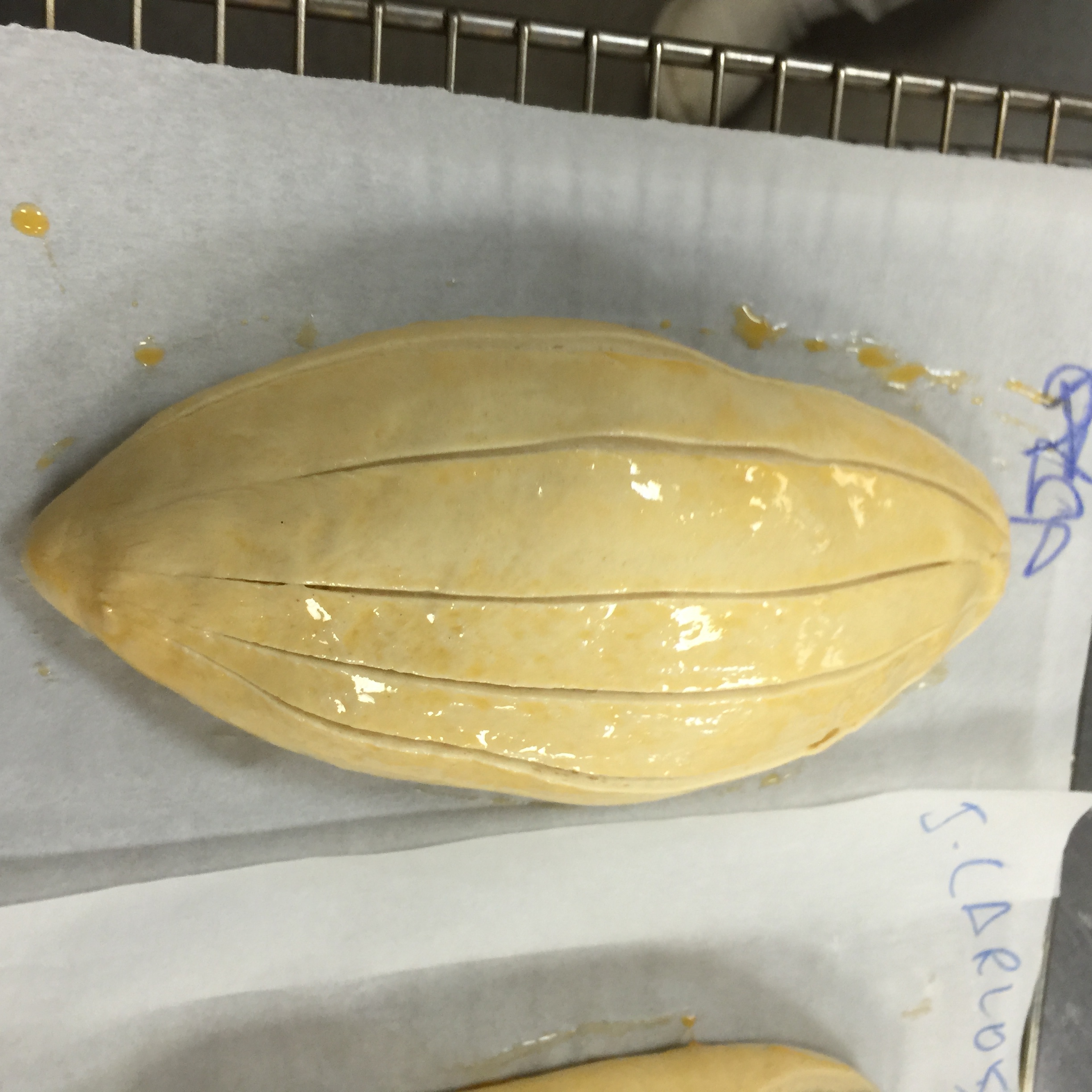 Pasado este tiempo, rompemos la bola para sacarle el aire, moviendo la masa del exterior al interior hasta que se ponga elástica. Al sacarla, la masa está blanda y si presionas con un dedo no recupera, sin embargo, cuando está un poco trabajada, se pone más elástica y recupera. En este momento, le hacemos forma de barra, como en la fotografía, lo pintamos con huevo y le hacemos unos cortes para el dibujo muy poco profundos.