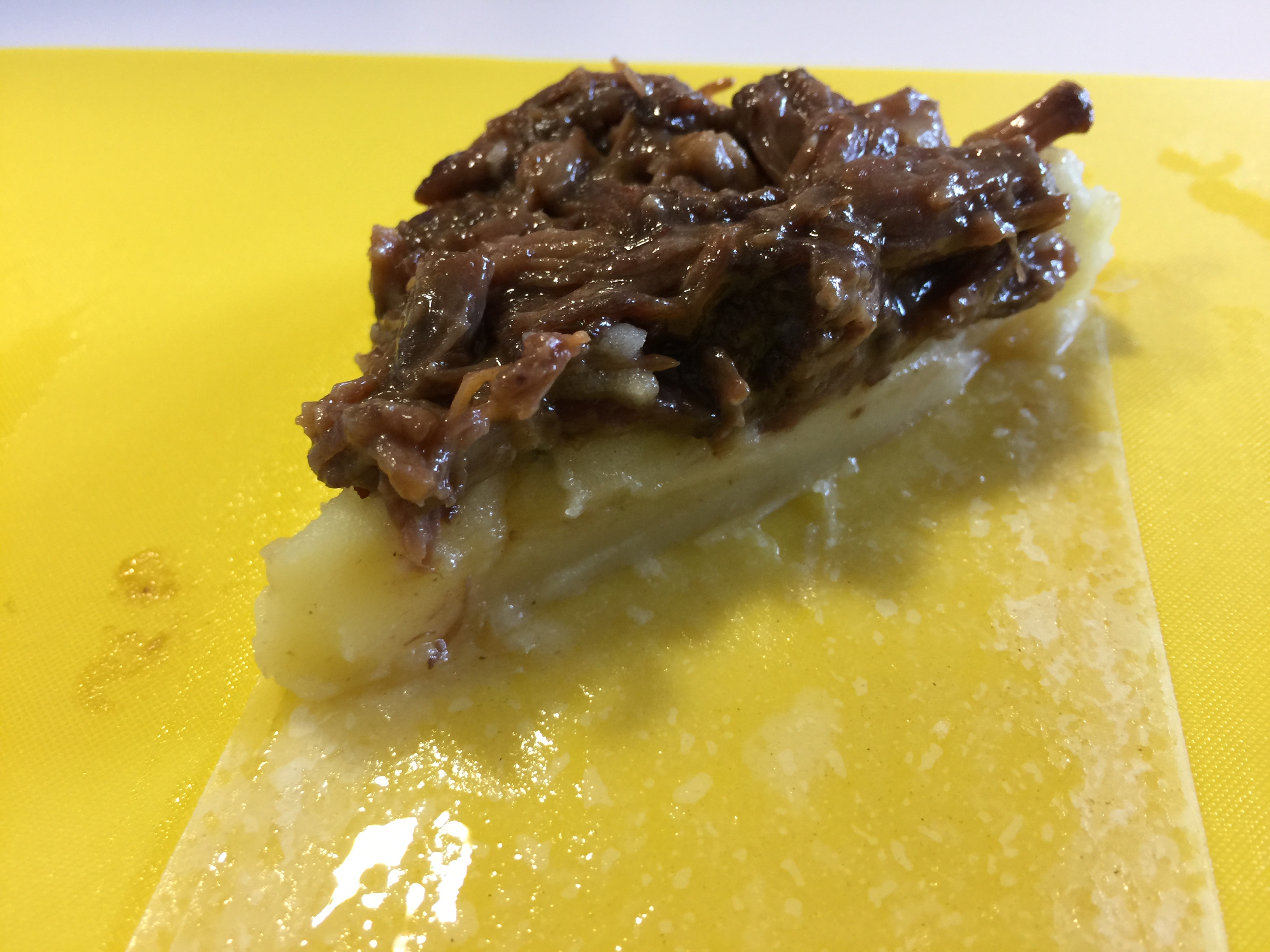 Si no tenemos la pasta Filo, lo podemos emplatar con un aro. Para ello, en una fuente que aguante al horno (Grill) o a la salamandra, ponemos un papel sulfurizado, cogemos un aro, que untamos de mantequilla por su interior, lo ponemos en la fuente y en él vamos colocando la carne que teníamos calentando, escurrida y presionándola con el puré de patata que hemos puesto en la manga pastelera para más comodidad, rellenamos el molde hasta arriba y repasamos con una paleta para que queda plana y regular, sobre éste espolvoreamos pan rallado y perejil picado, ponemos encima unas pizcas de mantequilla y lo llevamos al horno o salamandra a dorar. Cuando esté, lo sacamos.