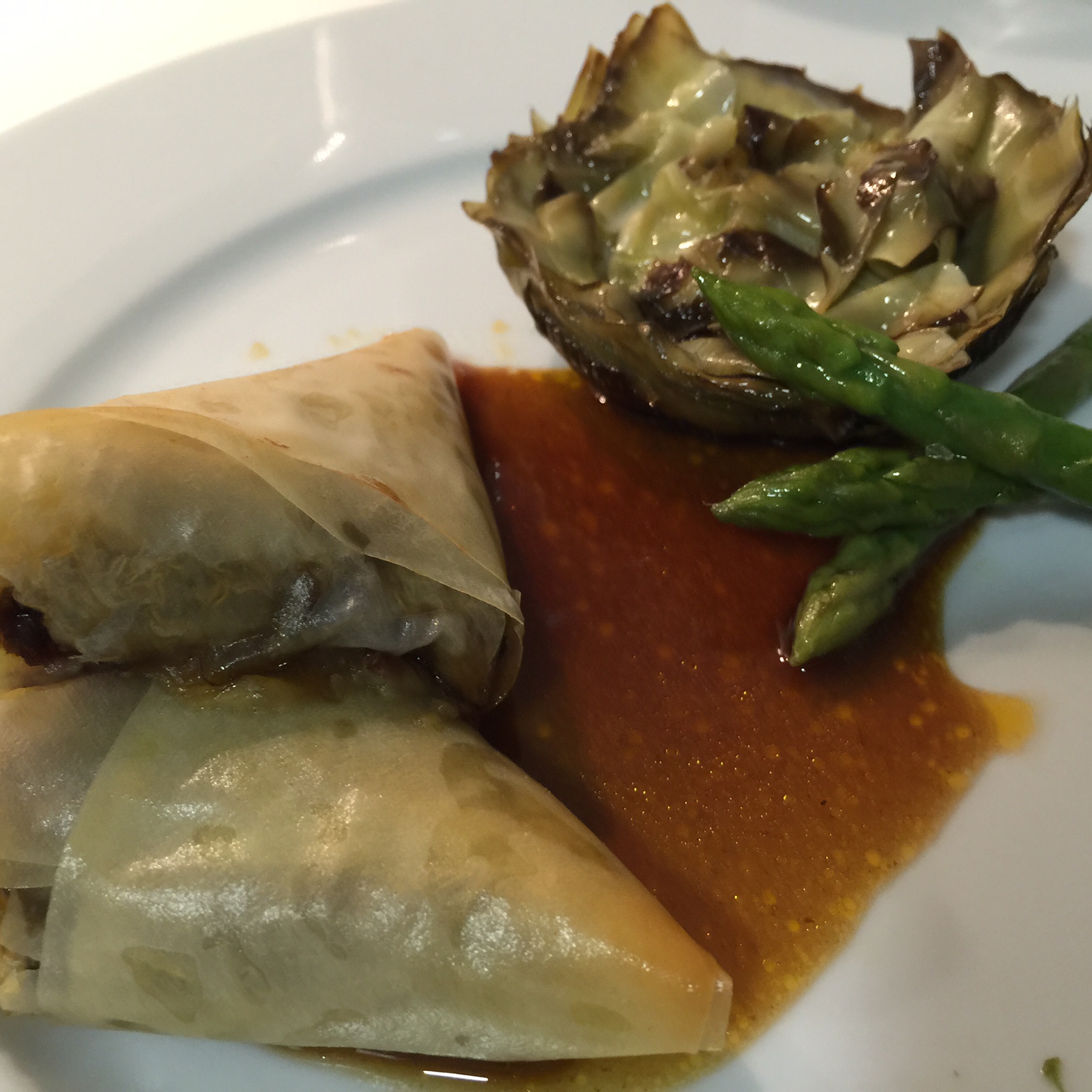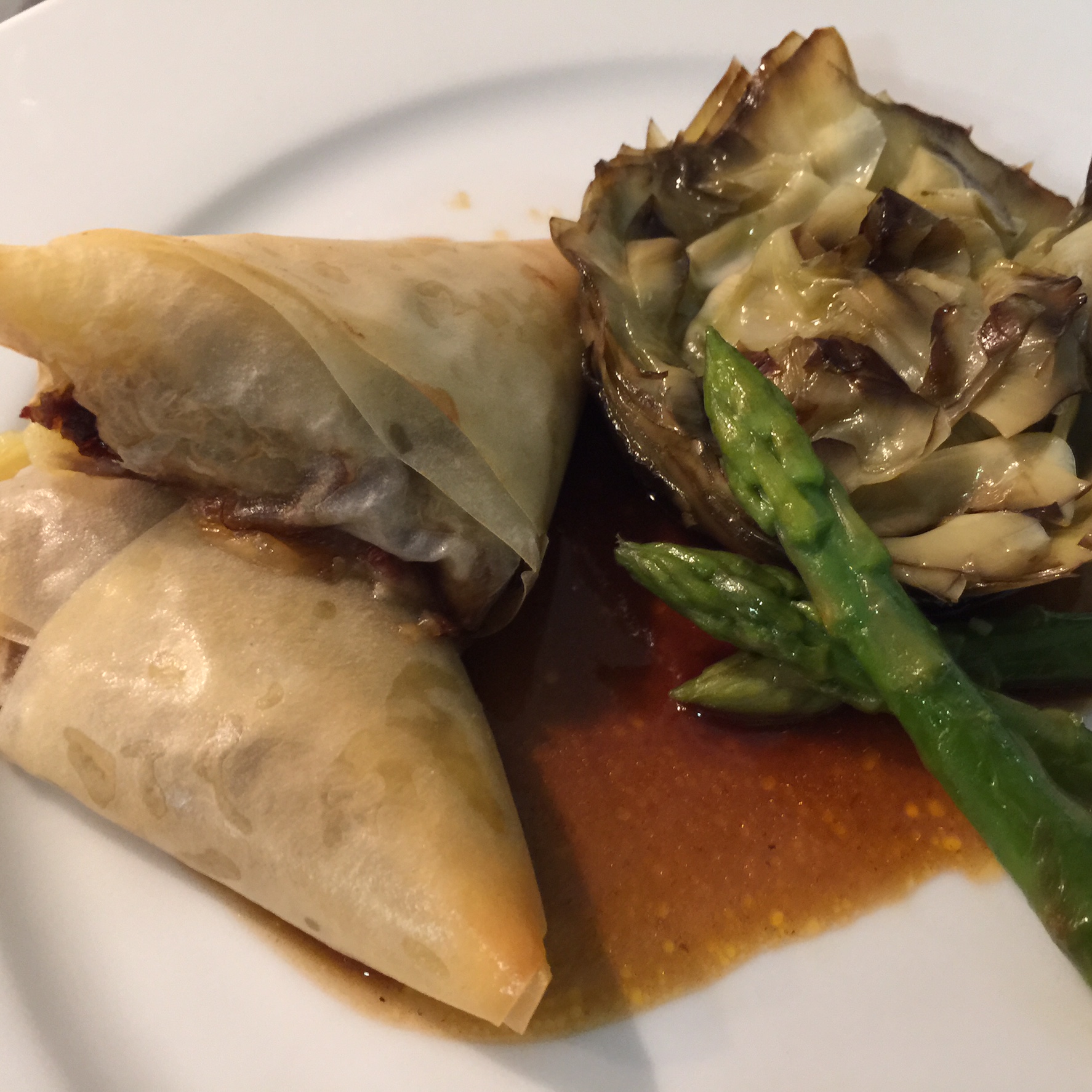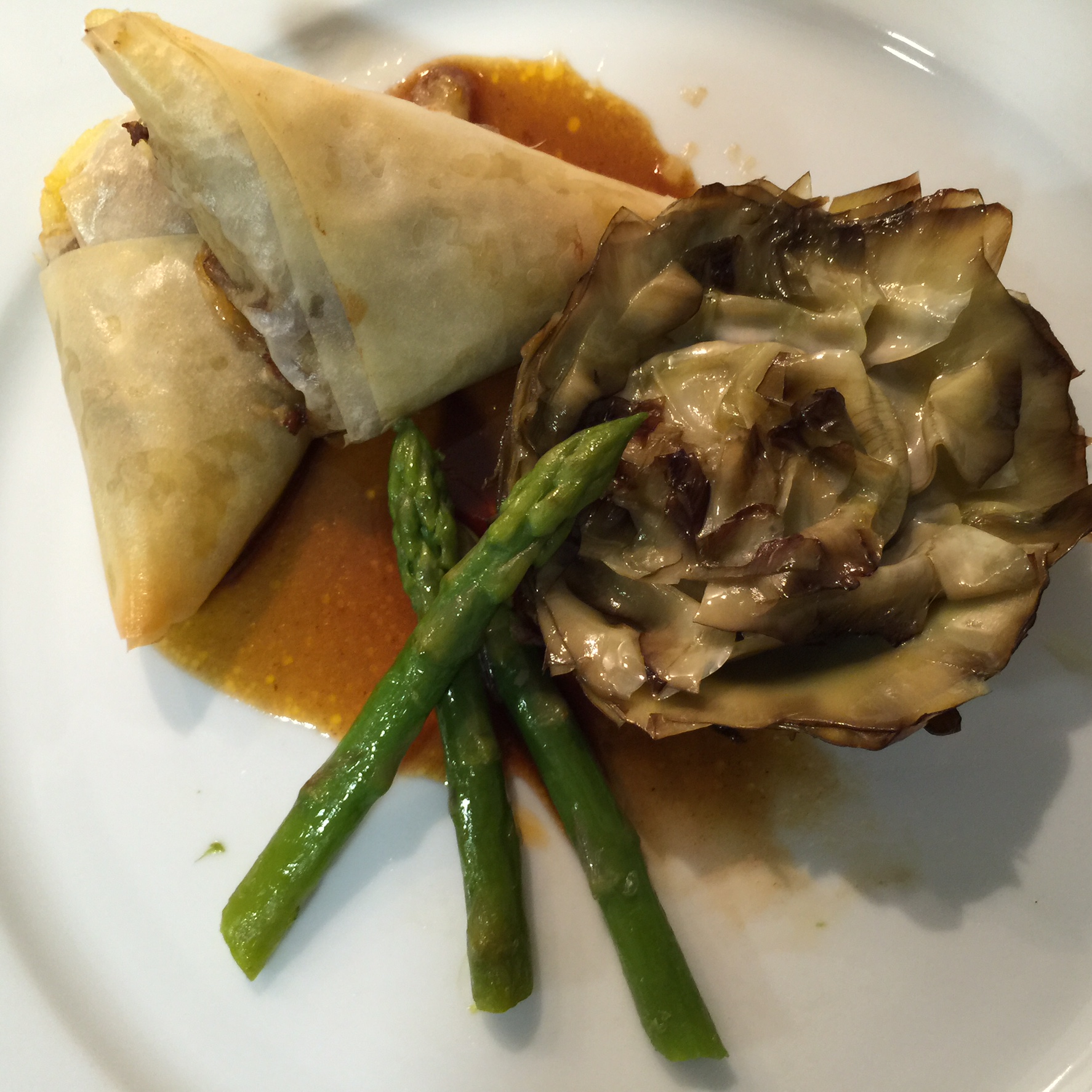 En este plato utilizaremos técnicas de corte, de cocción (inglesa para la verdura, estofado para el rabo y confitado para las alcachofas), utilizamos la pasta filo y ofrecemos dos tipos de emplatado y presentacion.