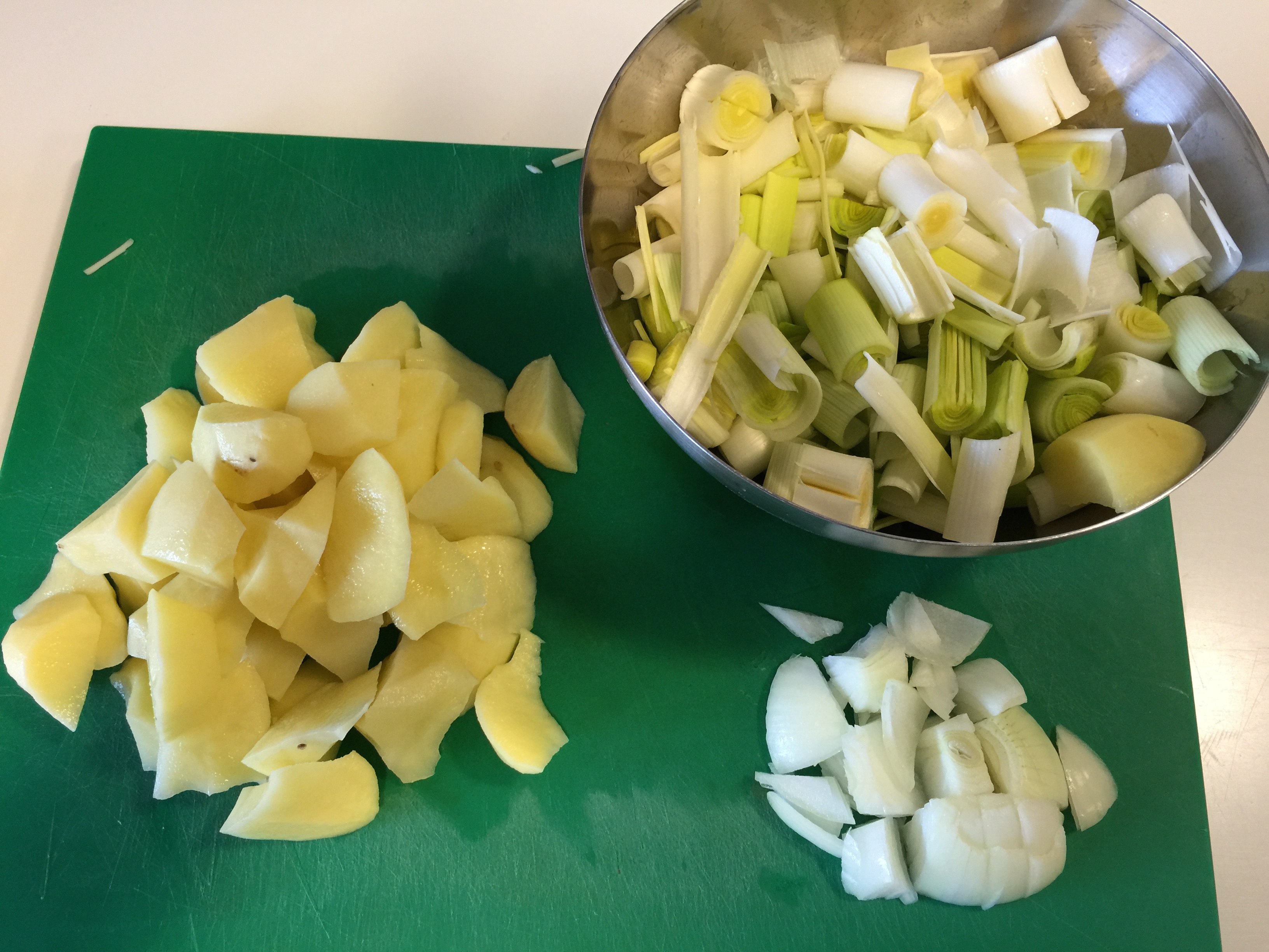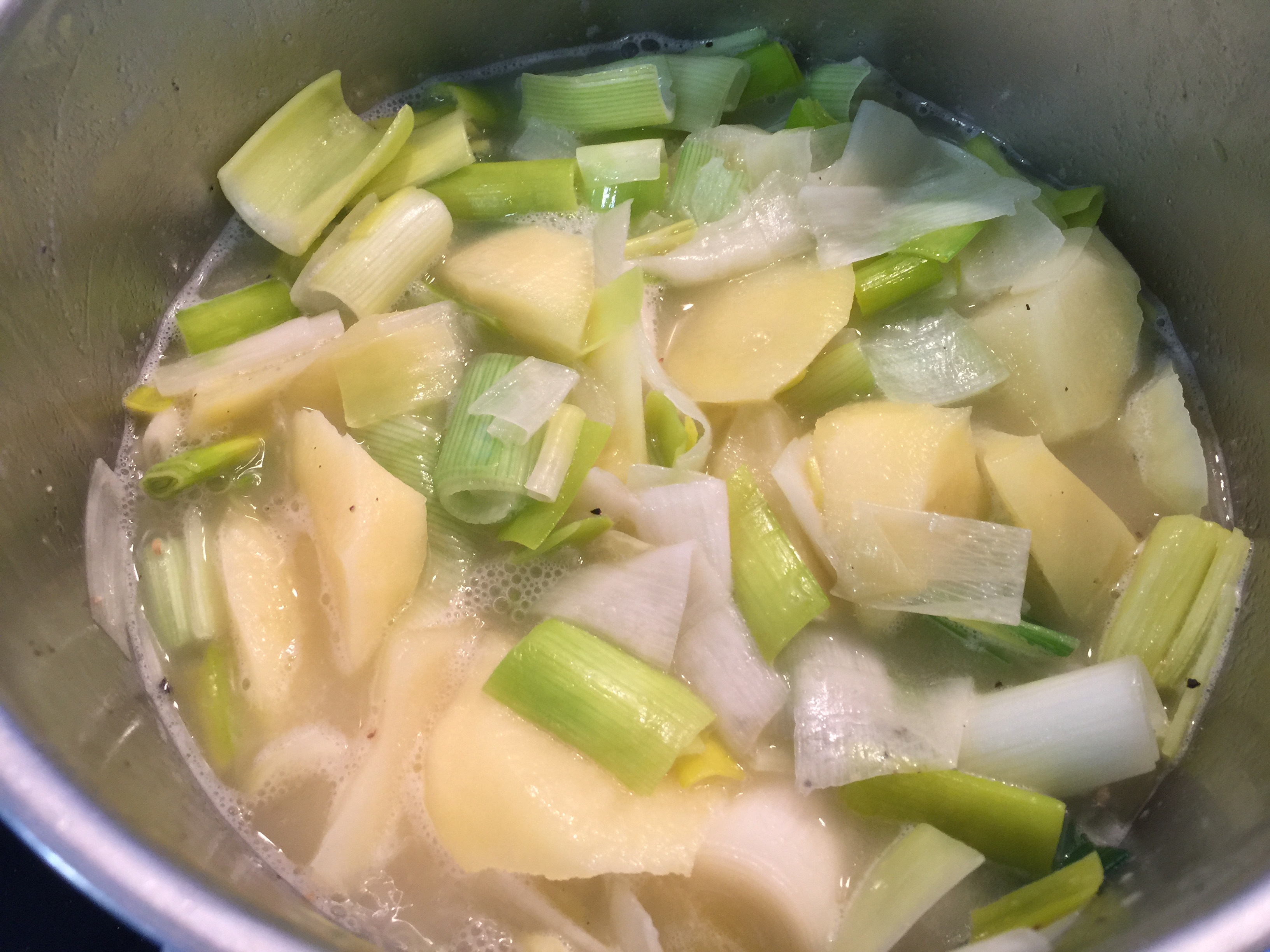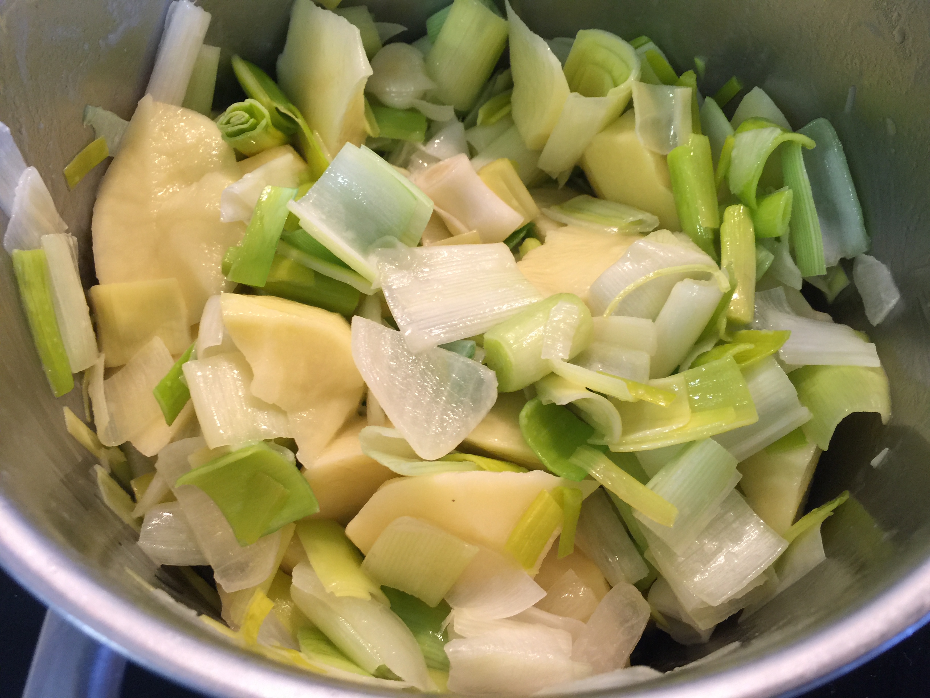 Cortamos la cebolla, el puerro y la patata en trozos no muy pequeños, ponemos en una cazuela adecuada la mantequilla a derretir y sobre ella echamos la cebolla a sudar un poco con una pizca de sal. Una vez esté transparente, incorporamos el puerro y la patata, le ponemos agua apenas para cubrirlo, no hace falta que lo cubra entero, le echamos la pimienta, tapamos la cacerola y lo dejamos a fuego medio durante unos 15 minutos, o hasta que veamos que está hecho.