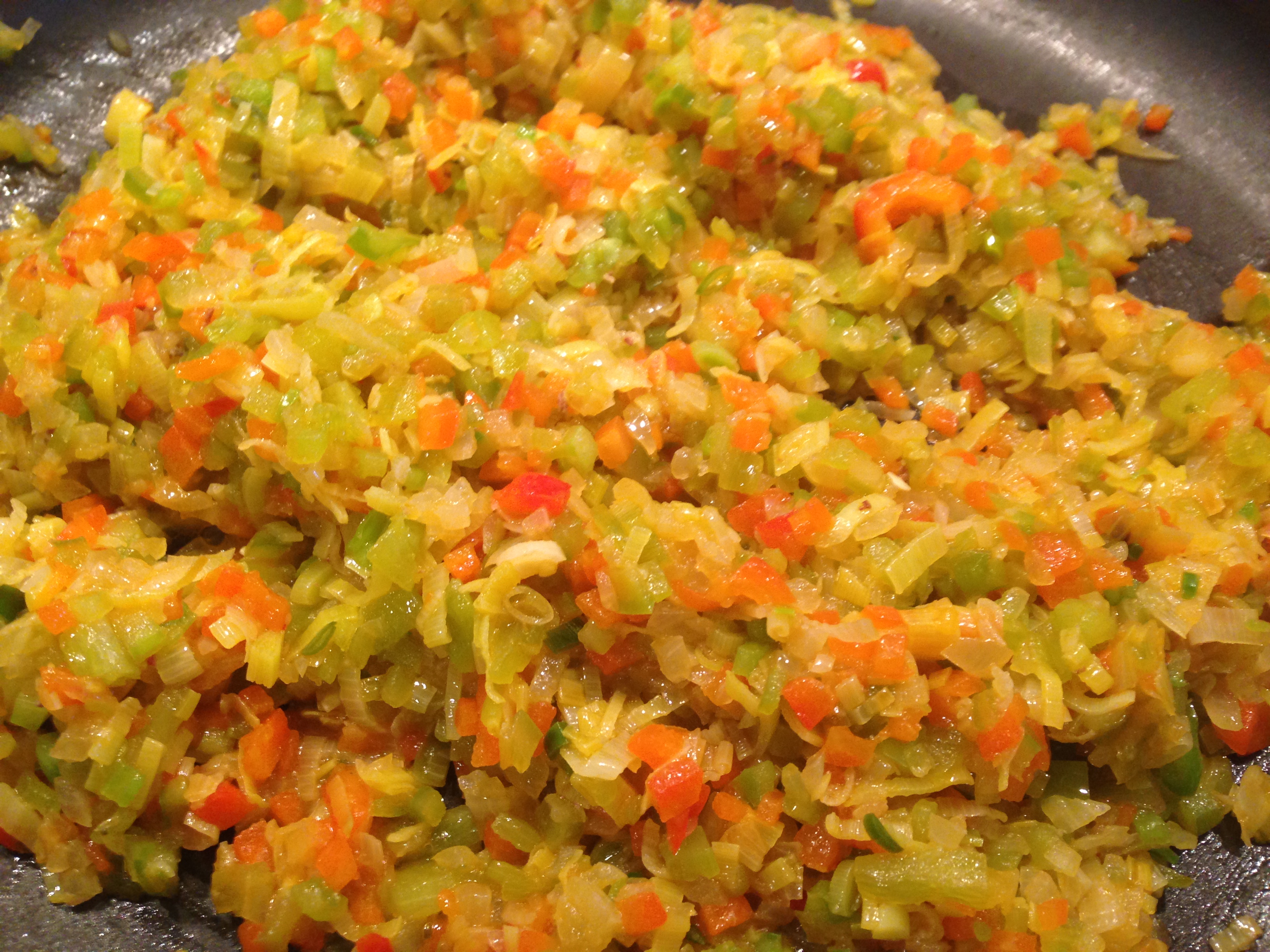 En cuanto a los pimientos, les quitamos las simientes, los nervios interiores y yo, aunque no es necesario, los pelo también. Los cortamos muy finos en cuadraditos de 4×4 mm aproximadamente y, cuando la cebolla está sudada, los incorporamos a la sartén, siempre a fuego lento.