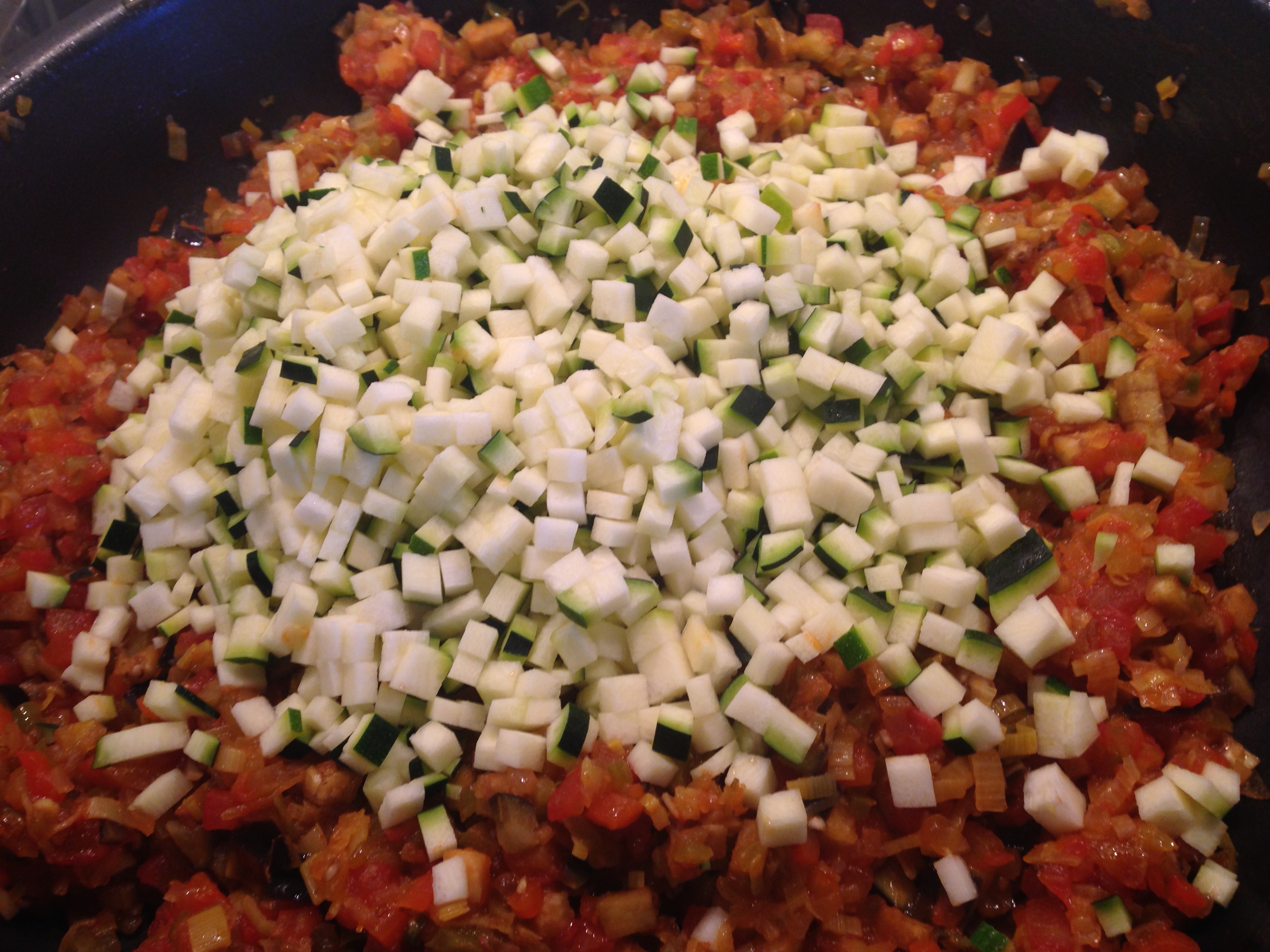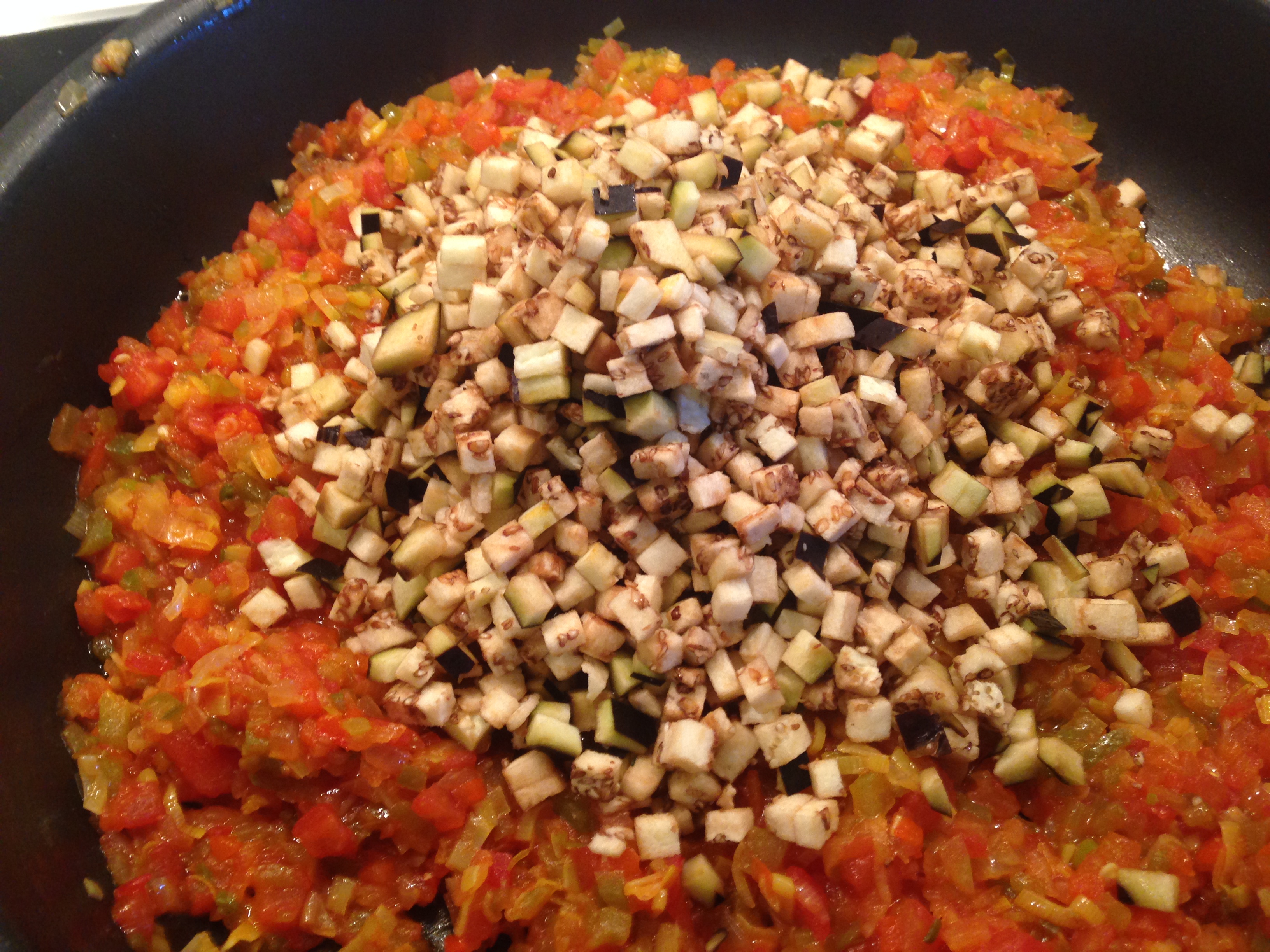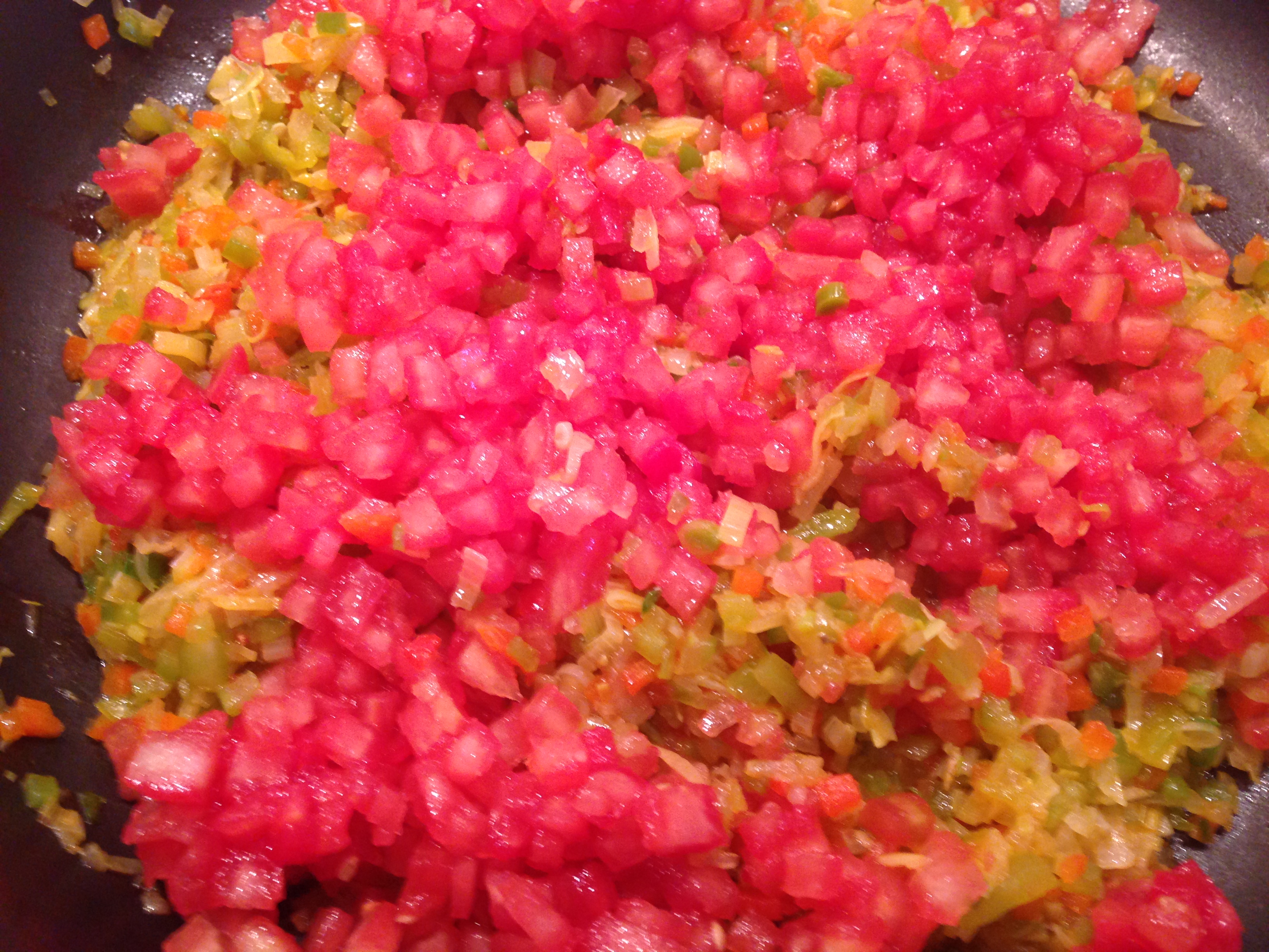 Escaldamos los tomates, les quitamos las simientes y la piel, los cortamos también en cuadraditos de 4×4 mm y los incorporamos a la sartén.