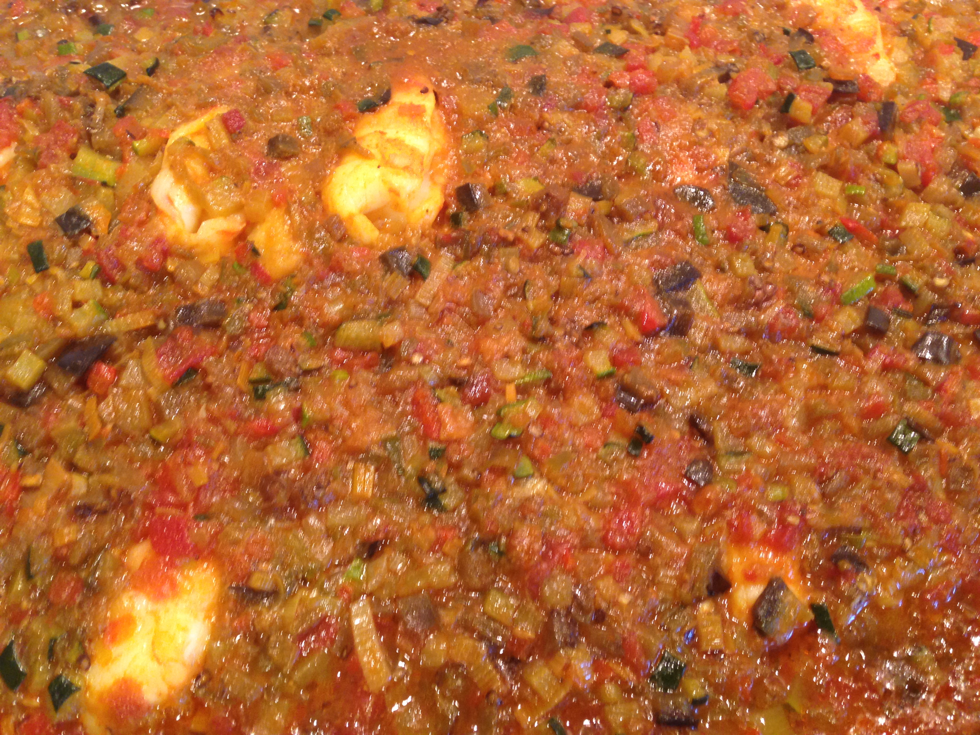 Lavamos el calabacín y la berenjena, los cortamos al mismo tamaño que el resto, los incorporamos, primero la berenjena y luego el calabacín y lo dejamos todo que se vaya haciendo. Se trata de un pisto con la base en el aceite de los langostinos y el bacalao que dejaremos haciendo a fuego suave.