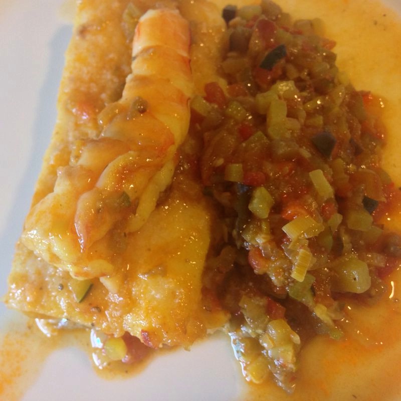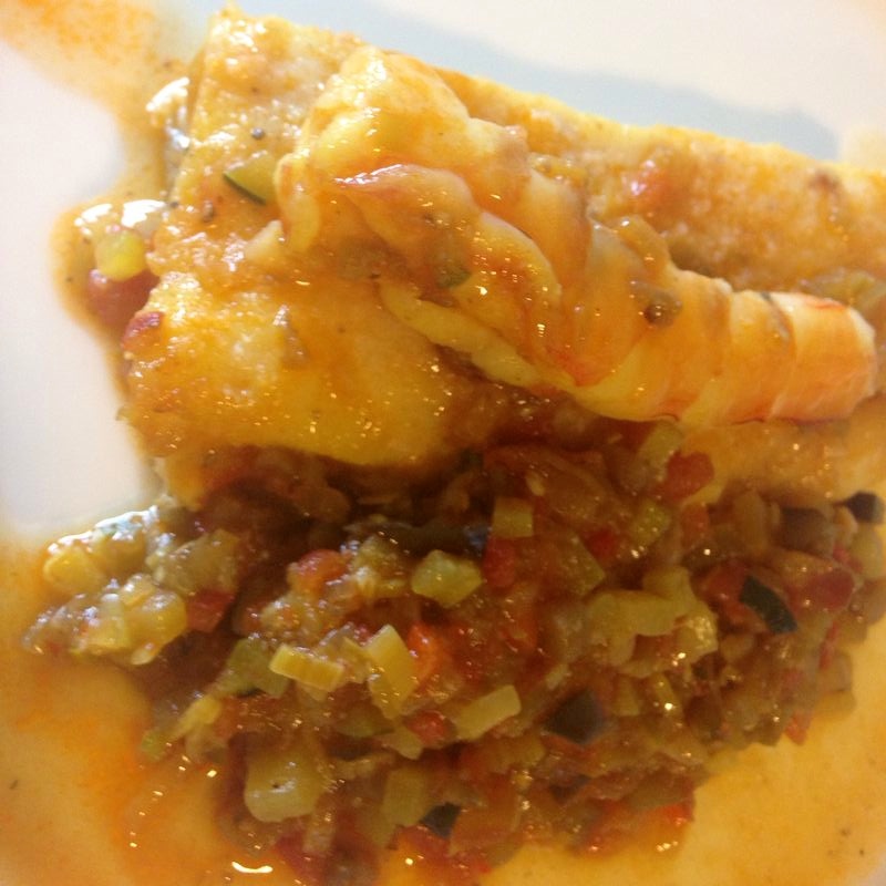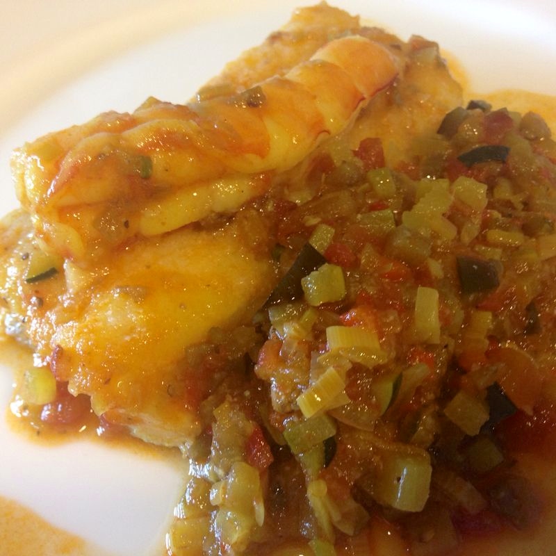 Prácticamente ya lo tenemos hecho. Toda la verdura está ya a punto, aún tiene algo de líquido, la probamos de sal y pimienta y rectificamos, la echamos por encima de los lomos de bacalao y los langostinos cubriéndolos y metemos la fuente en el horno precalentado a 160º durante 10 minutos. Finalmente, lo sacamos, tapamos con papel de aluminio o film y dejamos reposar, aunque estará mucho más rico al día siguiente. Para servirlo le hacemos una cama de verduras y, sobre ella o apoyado en ella, ponemos el lomo y encima el langostino. Se puede adornar con cebollino o una hoja de perejil frita.