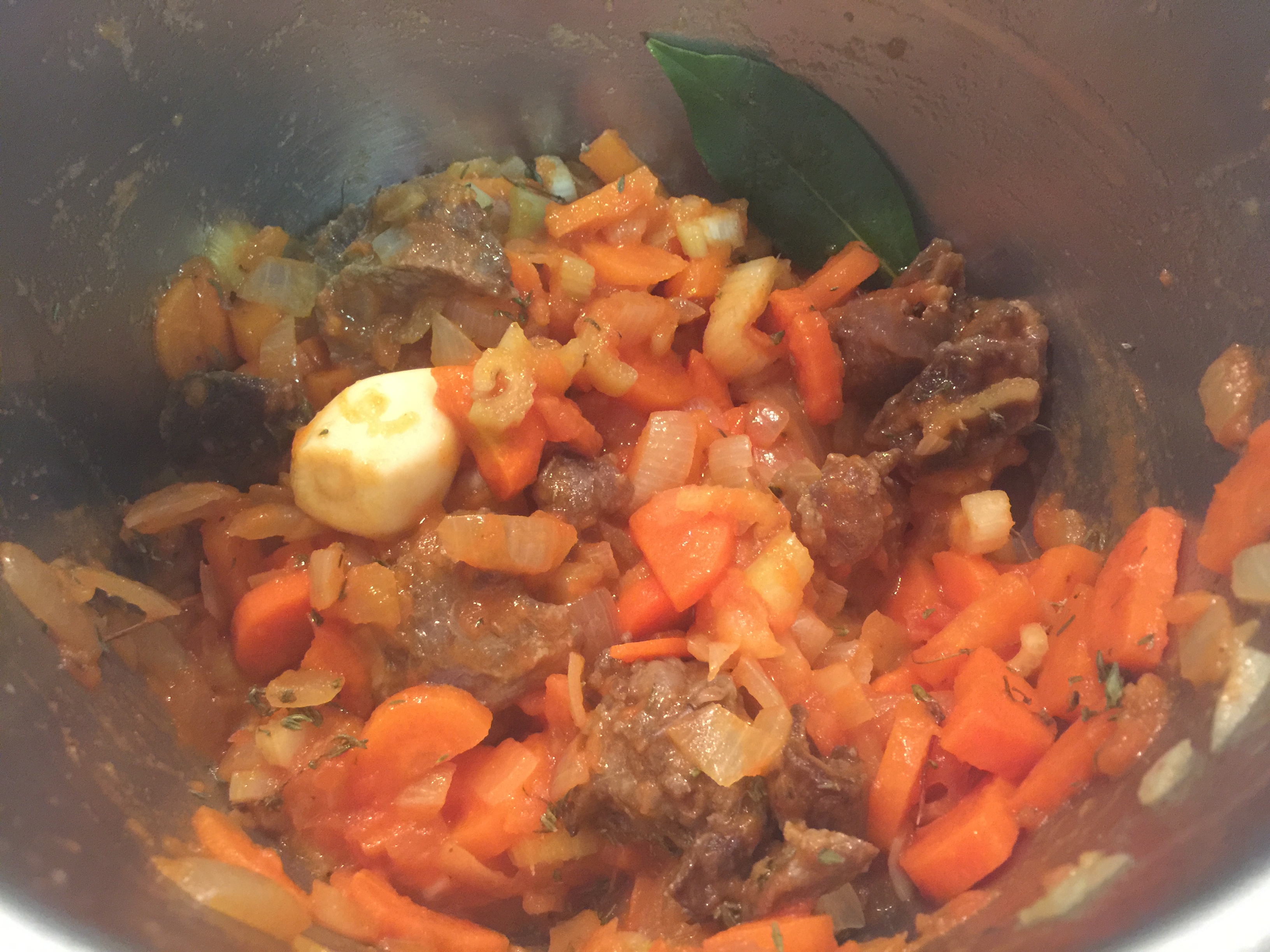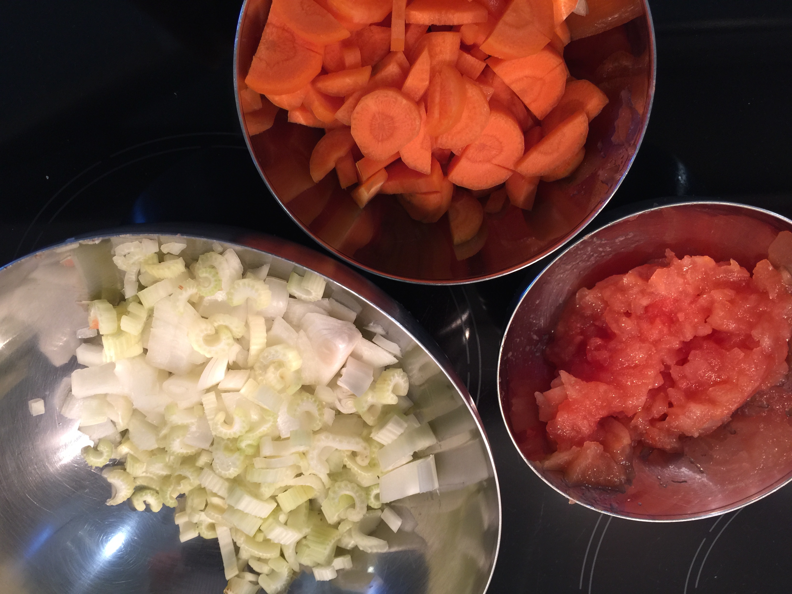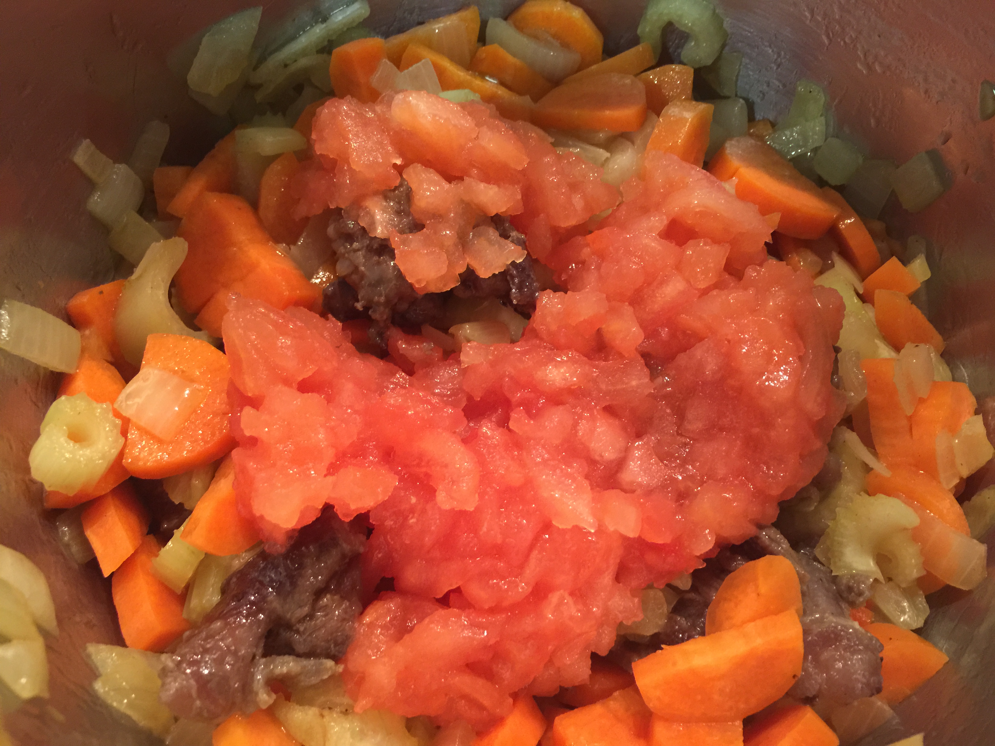 Seguidamente, pelamos, lavamos y cortamos las verduras. Sobre el aceite de sellar y los recortes, echamos la cebolla a sudar con una pizca de sal y, al cabo de unos minutos, le incorporamos el apio y la zanahoria. Mientras esta verdura está sudando, escaldamos los tomates, los pelamos, eliminamos las simientes y los picamos muy fino. A continuación, los incluimos también y los rehogamos un poco. Luego añadimos la cucharada de tomate concentrado, le damos unas vueltas y ponemos el cognac hasta que se reduzca a seco.
