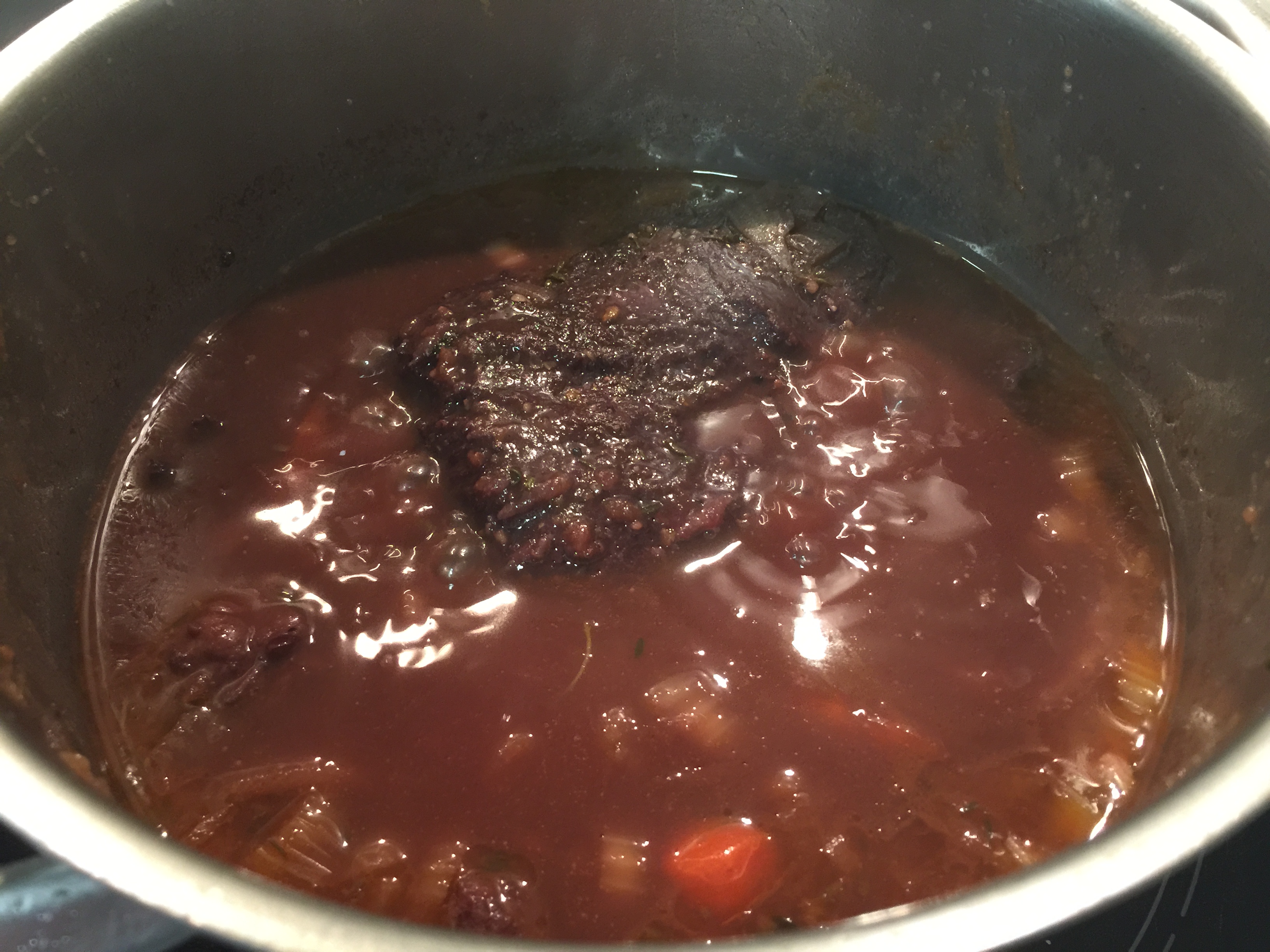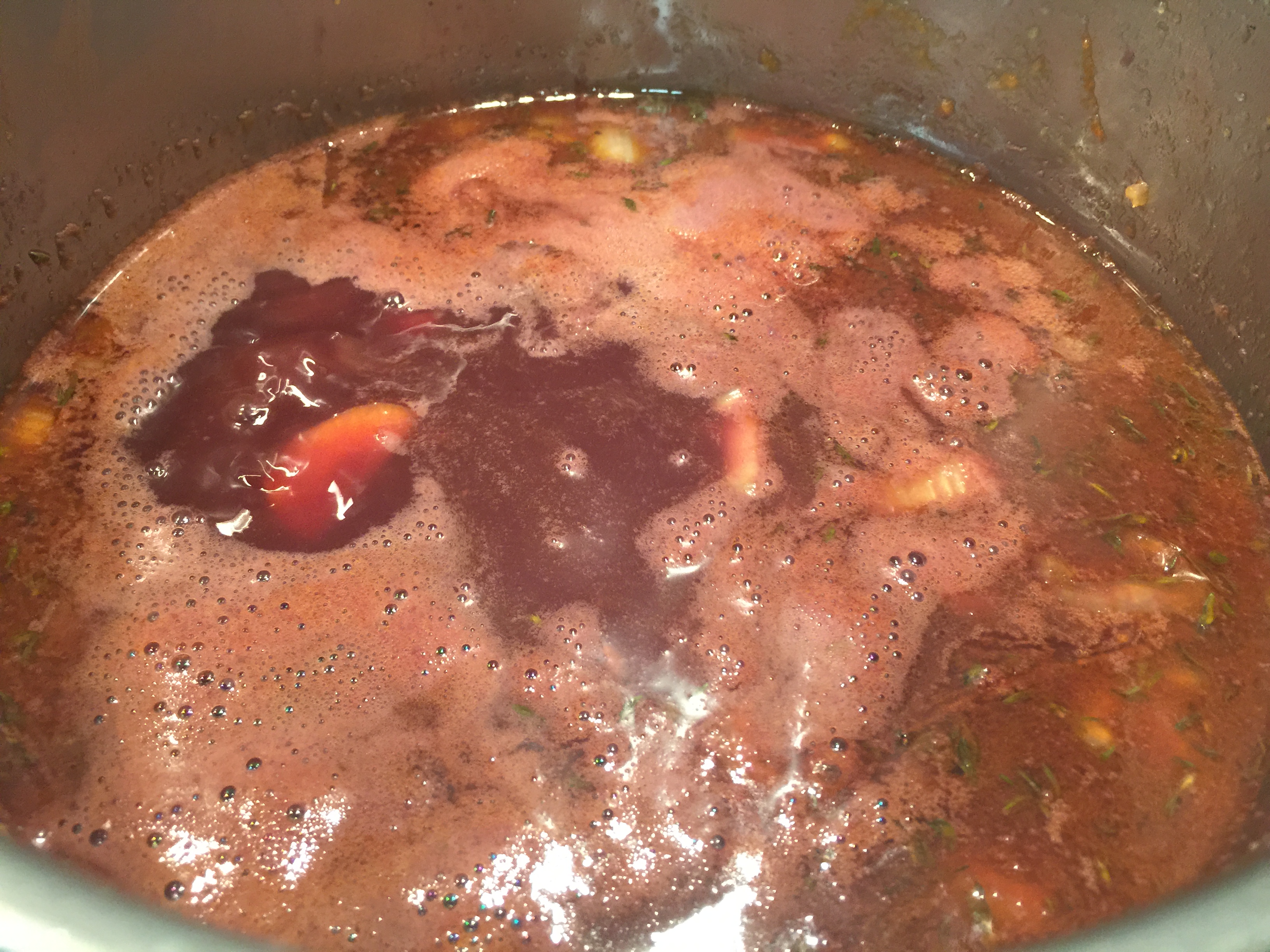 En este momento, le incorporamos el vino tinto, el fondo oscuro de ternera y las carrilleras. Lo llevamos a ebullición, desespumamos y bajamos mucho el fuego, dejándolo con un hervor muy suave, hasta que estén cocidas.