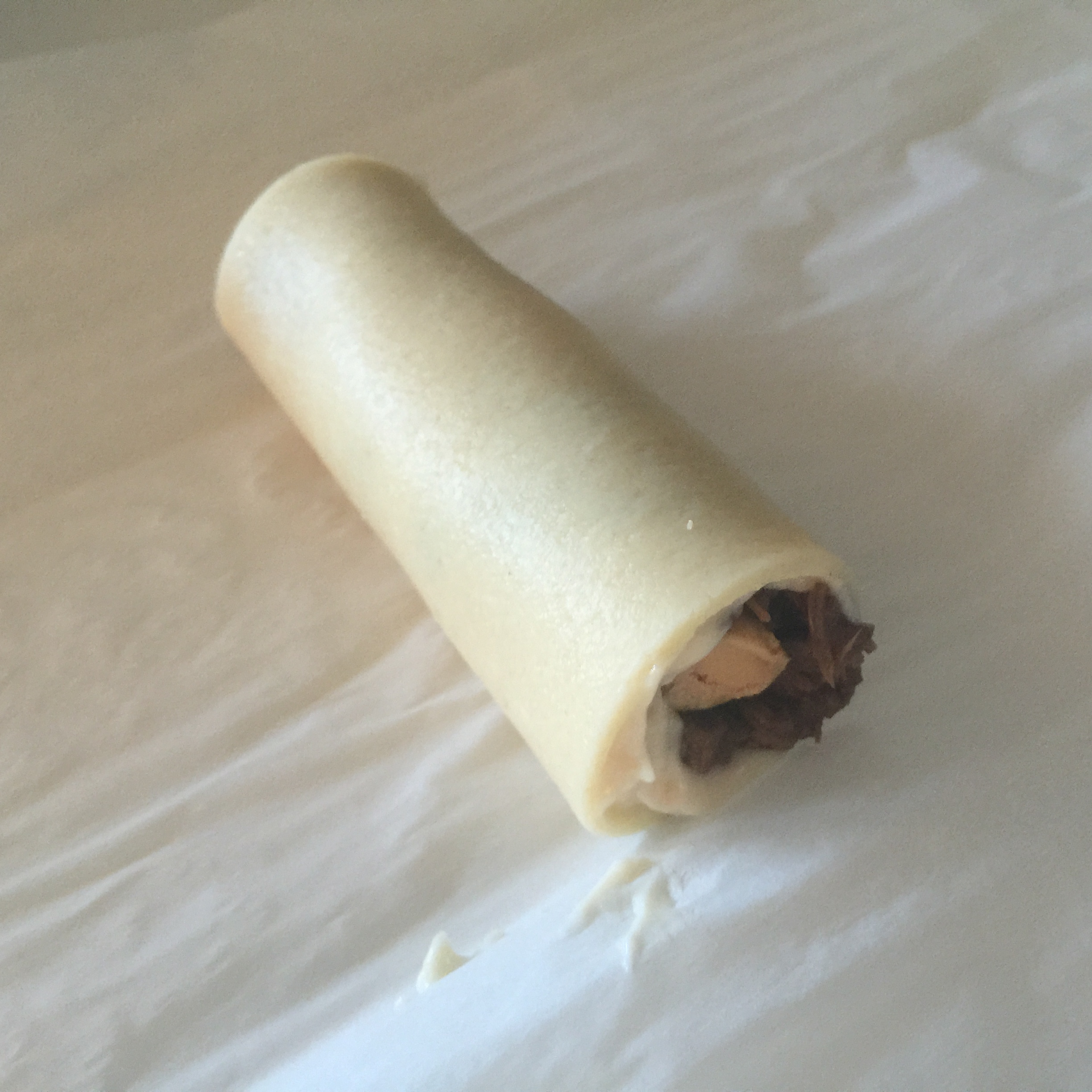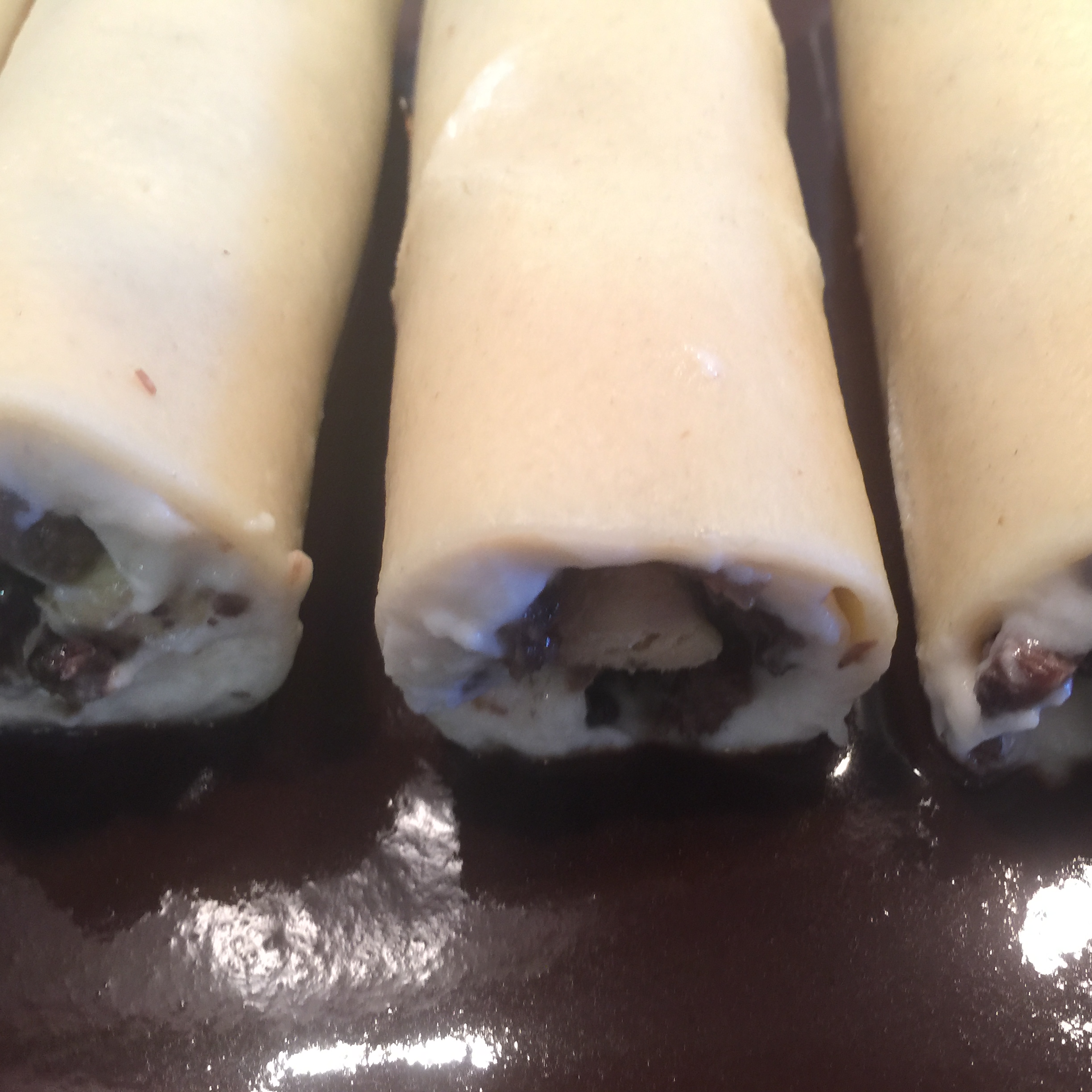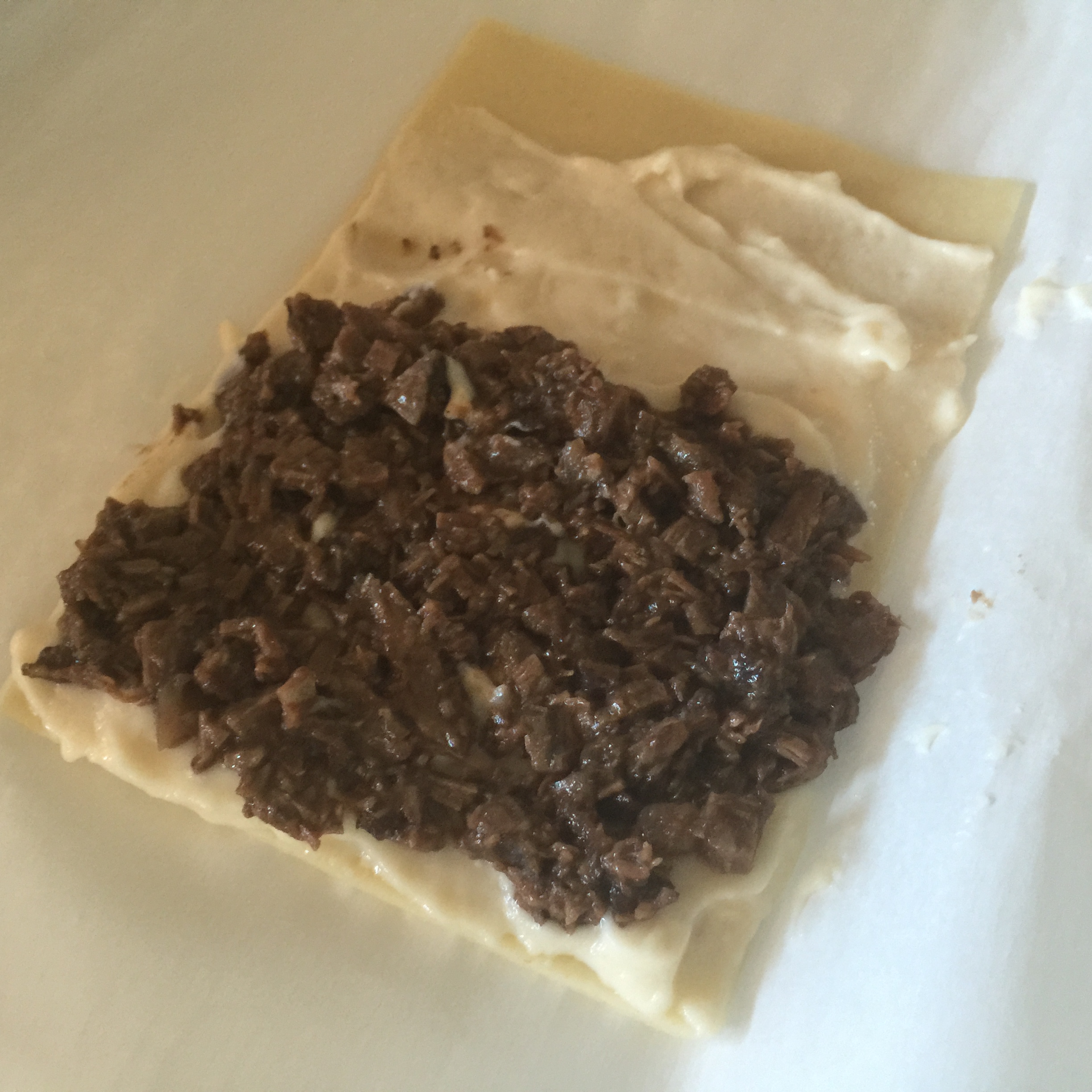 En primer lugar, colocamos la pasta bien seca. Sobre ella, y con ayuda de una espátula, extendemos la bechamel que teníamos enfriando sin llegar hasta el borde final. Sobre ésta, extendemos una capa de la carne de la carrillera y, en el centro de ésta, colocamos un bastoncillo de foie, que previamente hemos sacado del congelador, sacado del film que lo rodeaba y cortado del tamaño del canelón. Una vez hecho todo esto, lo enrollamos y colocamos en la fuente donde vayamos a hornear.