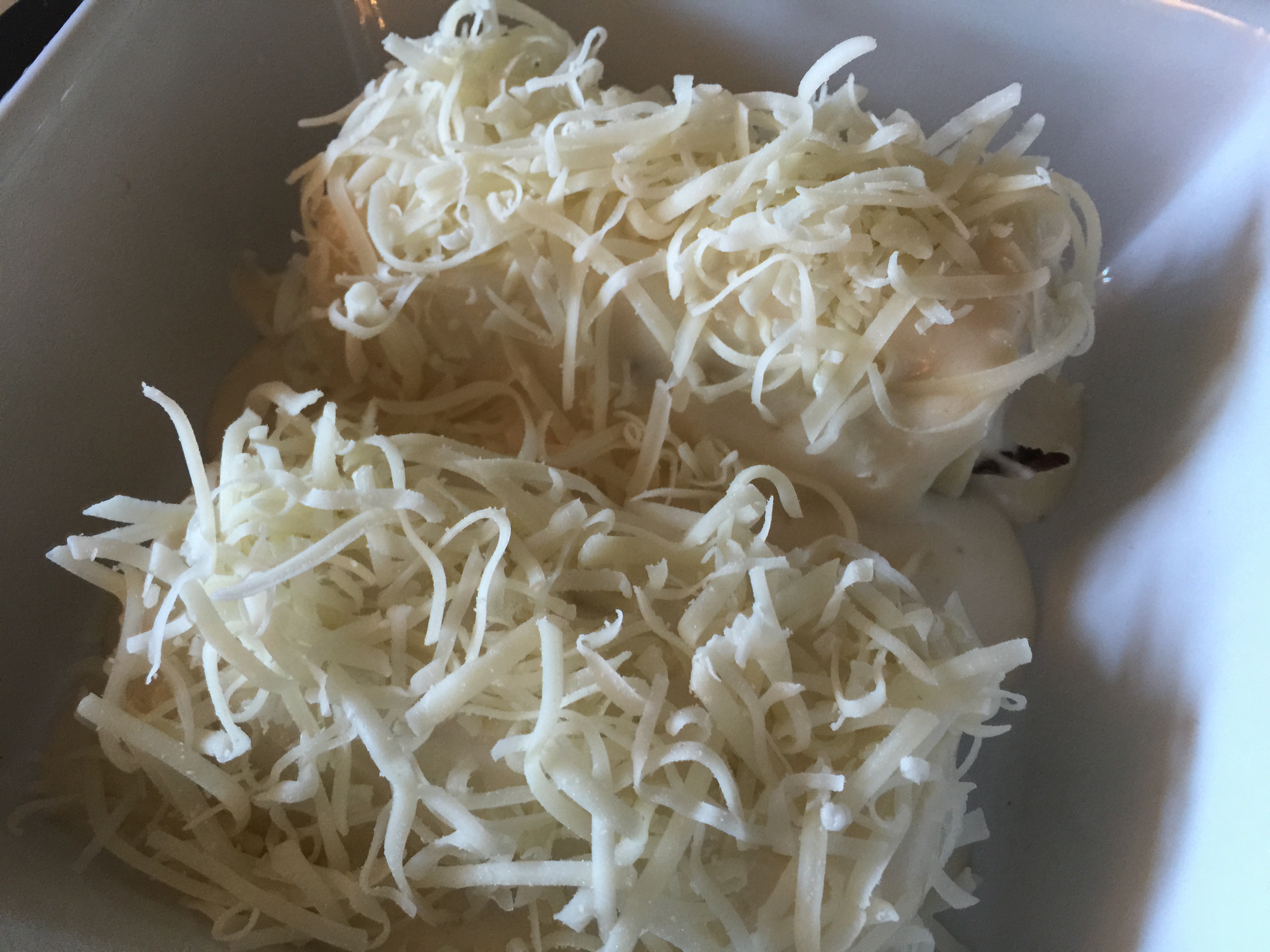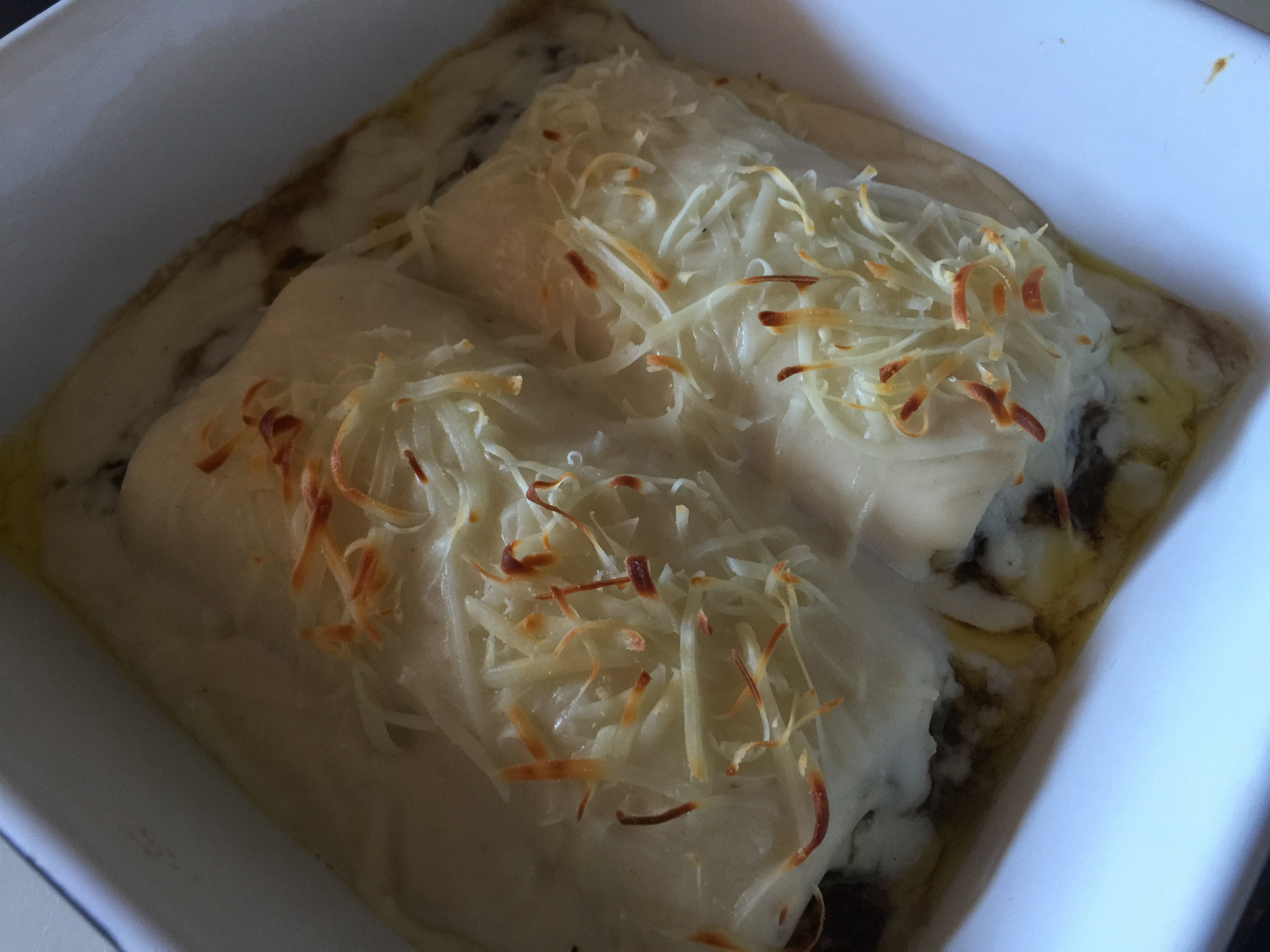Cubrimos los canelones con la bechamel, le ponemos queso por encima y los horneamos con el horno previamente calentado a 160º, sólo grill superior, hasta que empiecen a dorarse.
