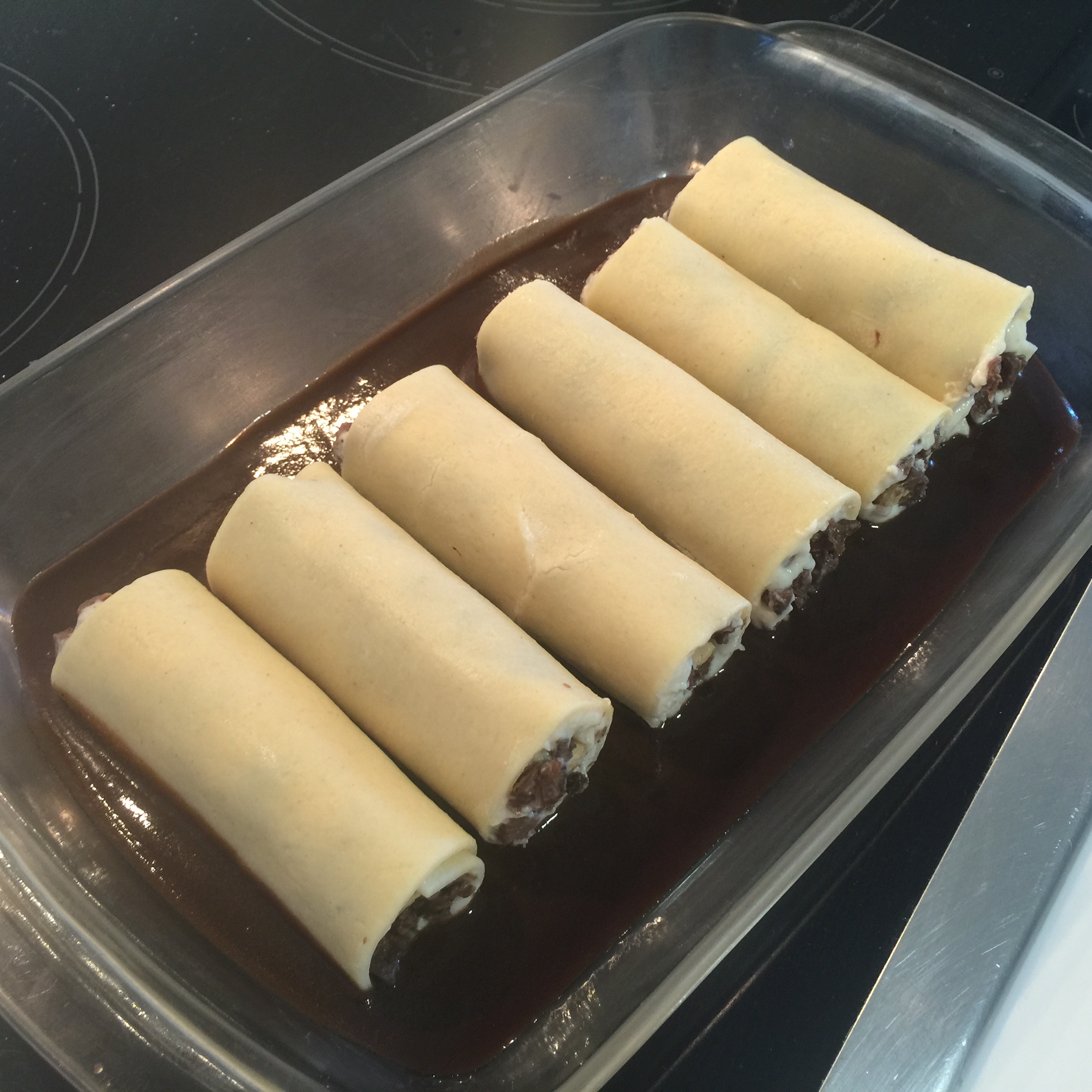 Una vez tengamos todos, si queremos podemos ponerlos en una fuente colectiva, en lugar de emplatados individuales. En este caso, vertimos la salsa reducida de las carrilleras en la base y, sobre ésta, los canelones. Salseamos con la bechamel por encima, luego el queso y…¡al horno!