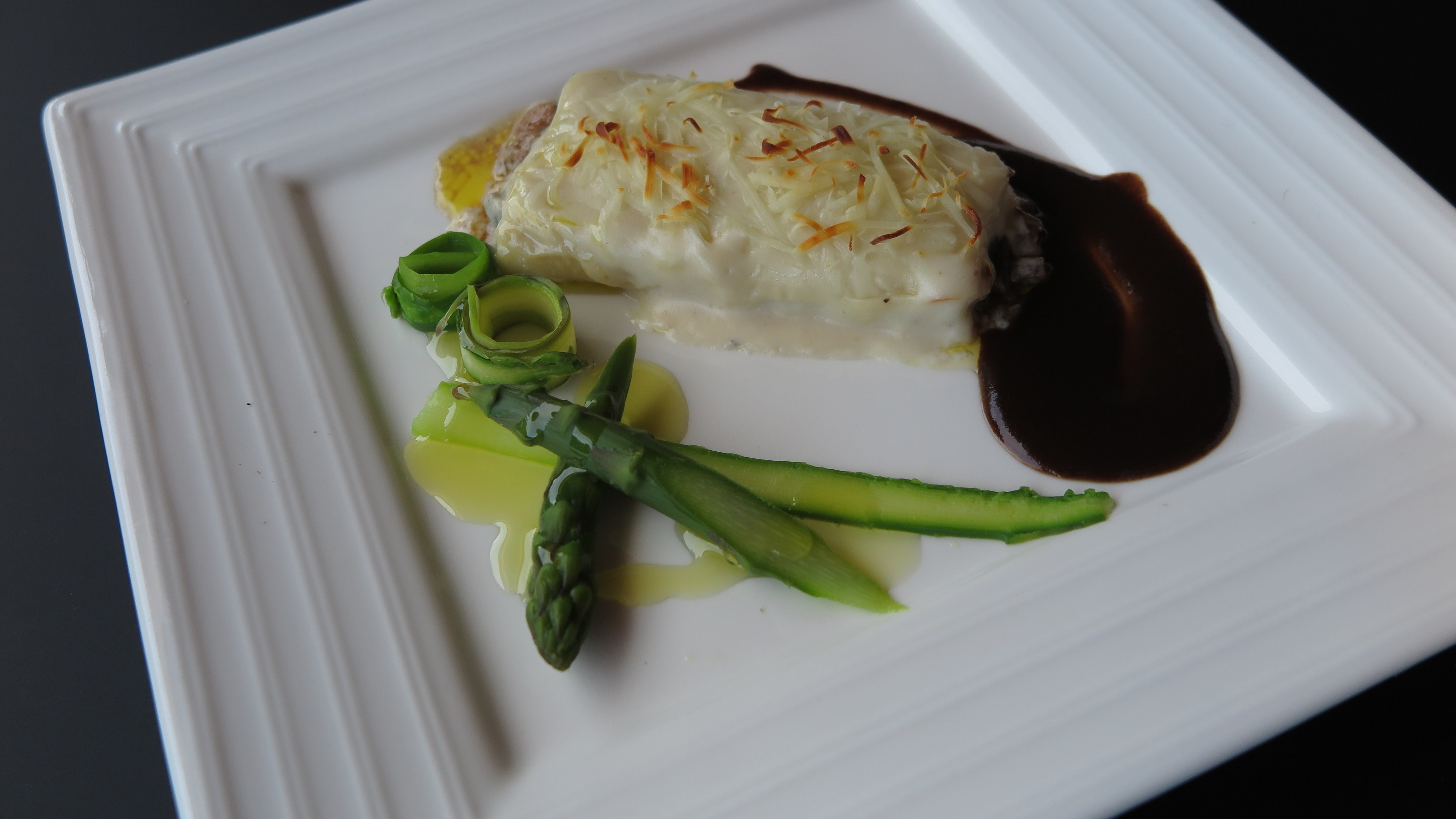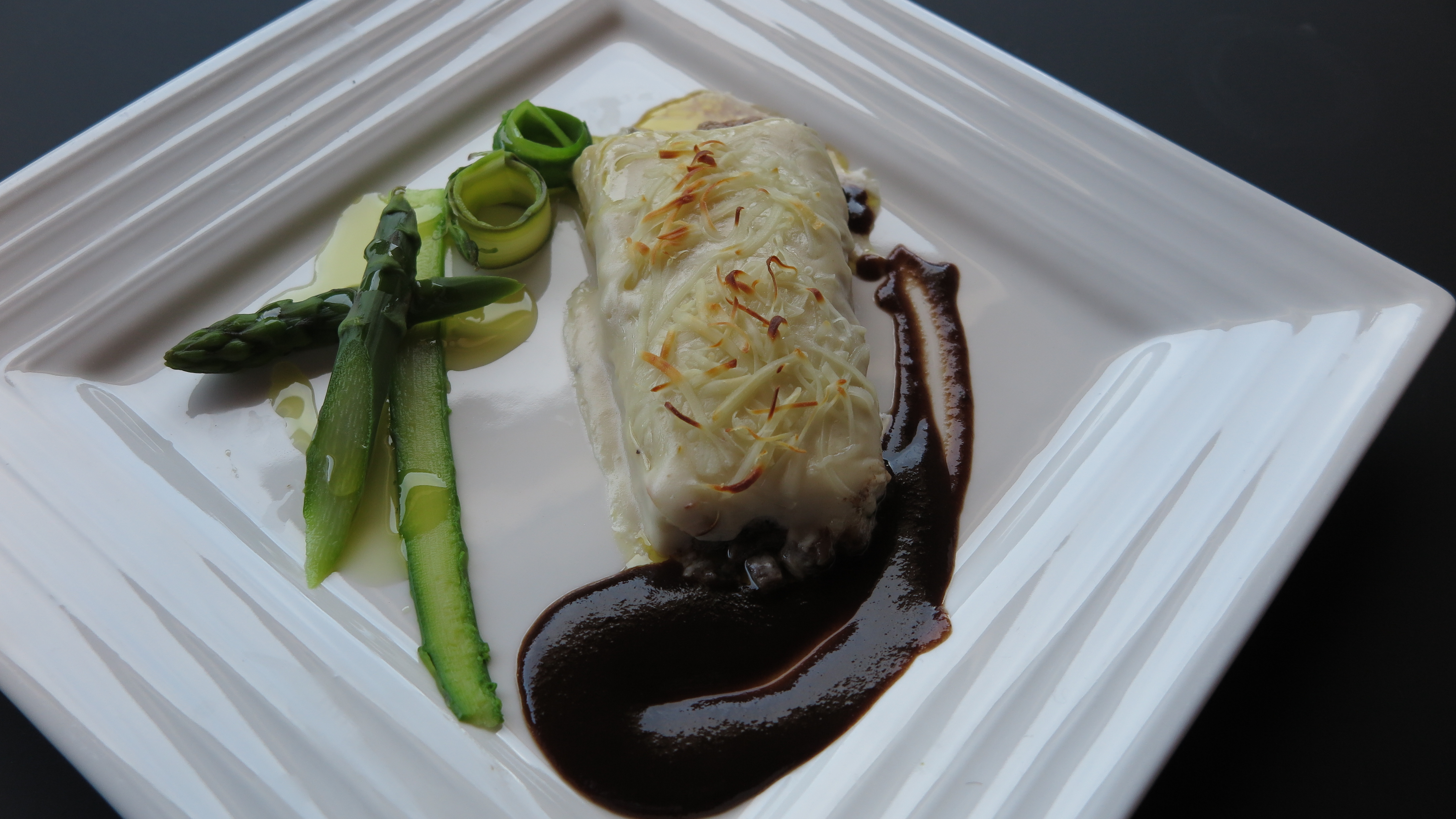 Tras hornearlos, procedemos a su montaje en el plato adornado con los espárragos y añadiendo un poco de salsa de las carrilleras.