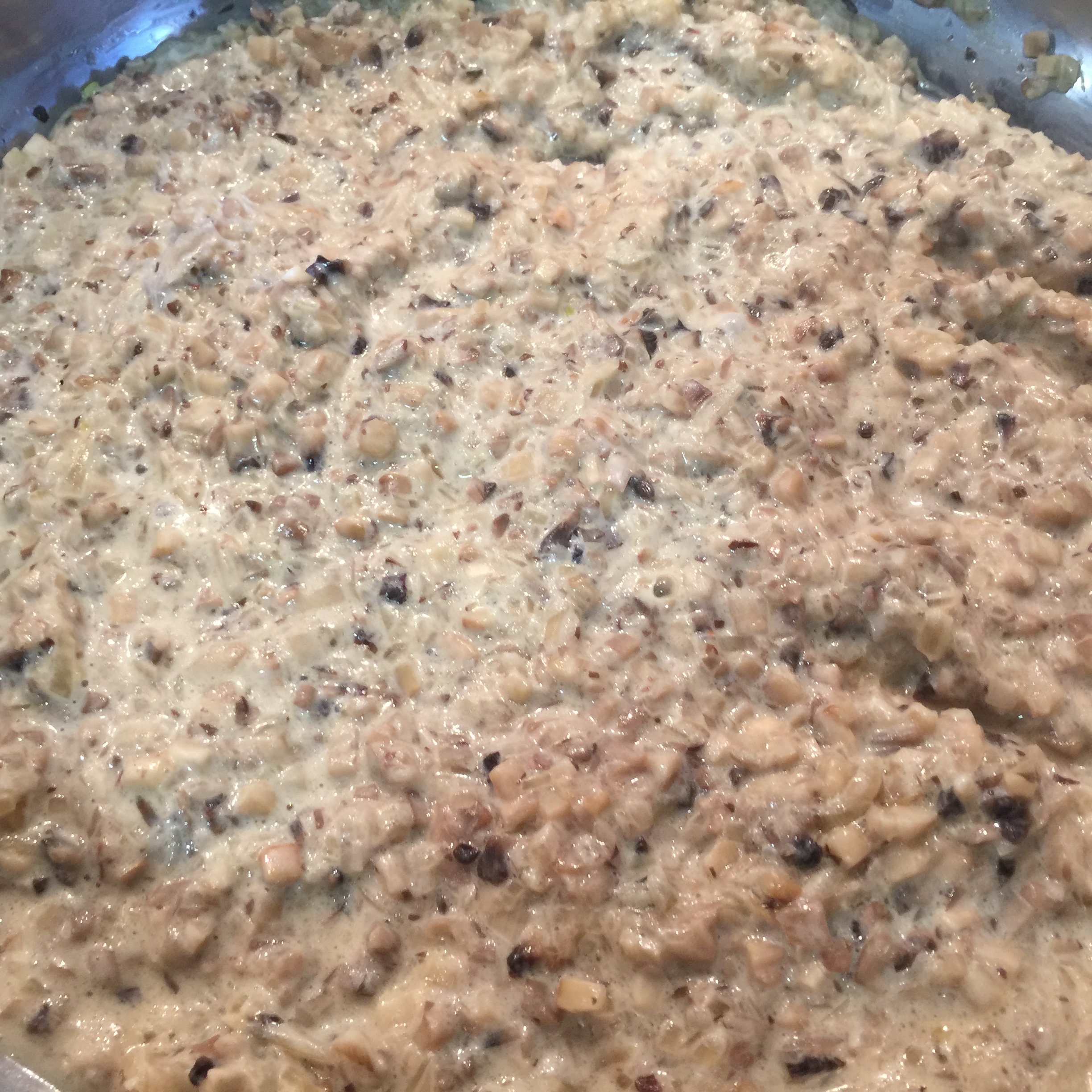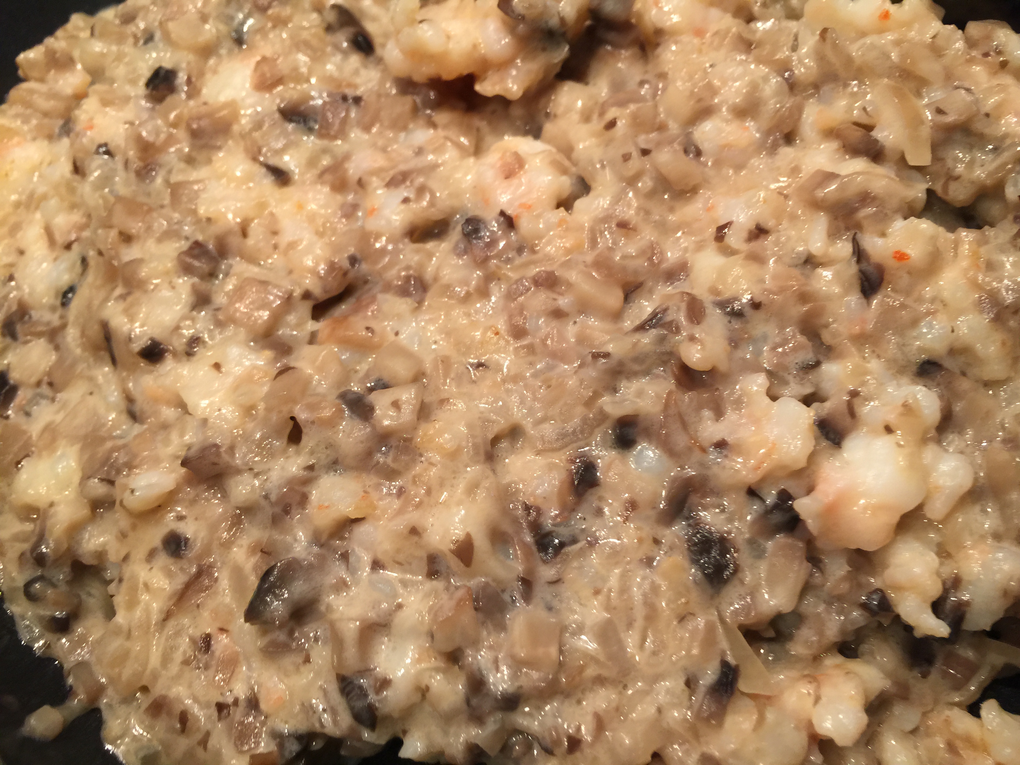 Cuando la Duxelle de los champiñones esté ya casi cocida, le añadimos la nata y dejamos que evapore. En ese momento, le incorporamos los langostinos, lo retiramos del fuego y mezclamos bien, salpimentamos, rellenamos con ello una manga pastelera desechable y dejamos enfriar un poco.