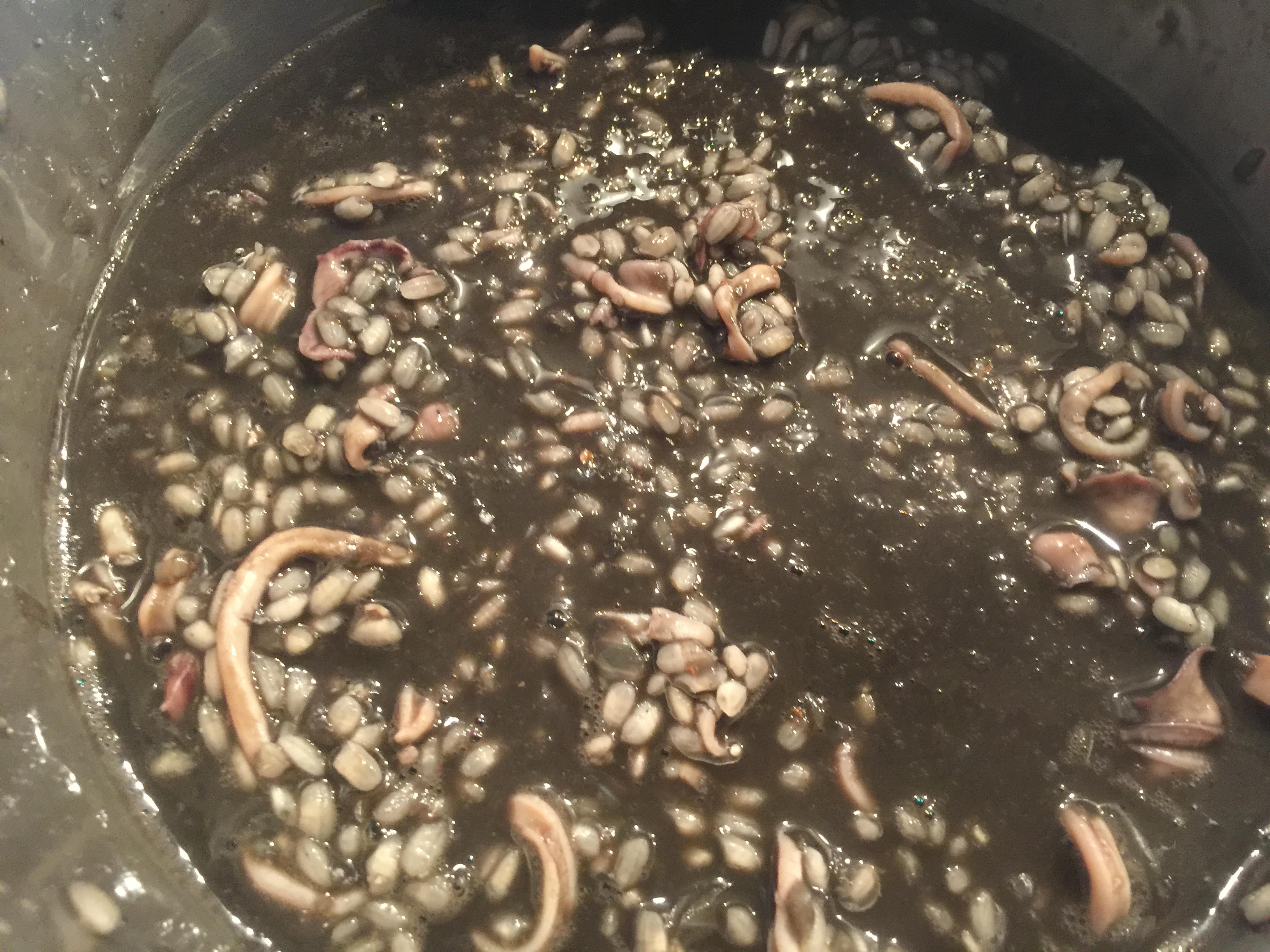 Seguidamente, pelamos y cortamos la chalota del risotto, la rehogamos un poco sobre el aceite de las cabezas con una pizca de sal, le añadimos el vino, reducimos a seco y después incorporamos el arroz hasta que esté nacarado. Asimismo, añadiremos las aletas y los chipirones que nos sobren después de rellenarlos todos los cortaremos en pequeños trozos para incorporarlos también y lo removemos bien. Tenemos calentando el fondo de ave, que bien podría ser de pescado, donde disolveremos las tintas y que iremos incorporando poco a poco al arroz, sin dejar de remover.