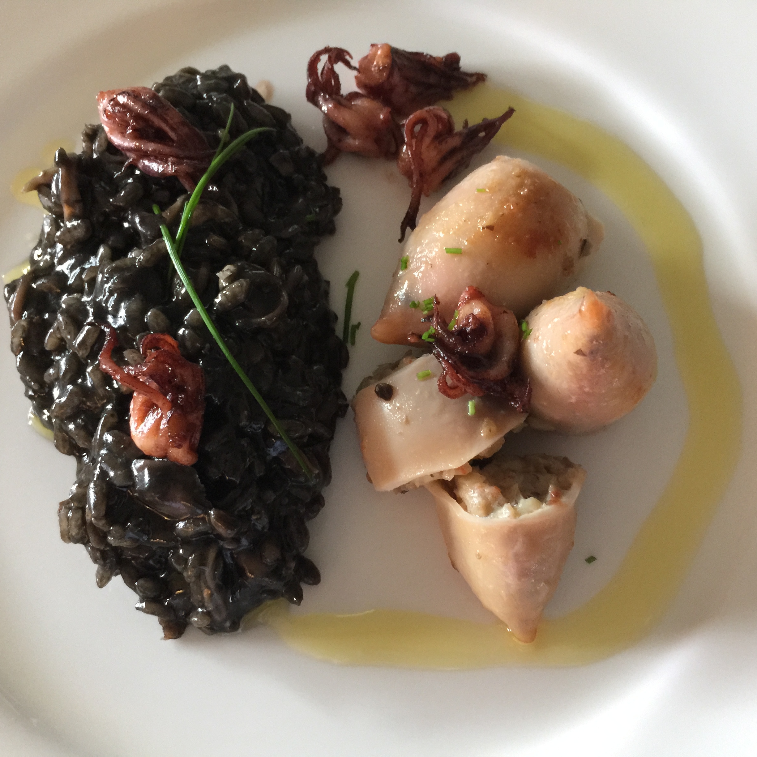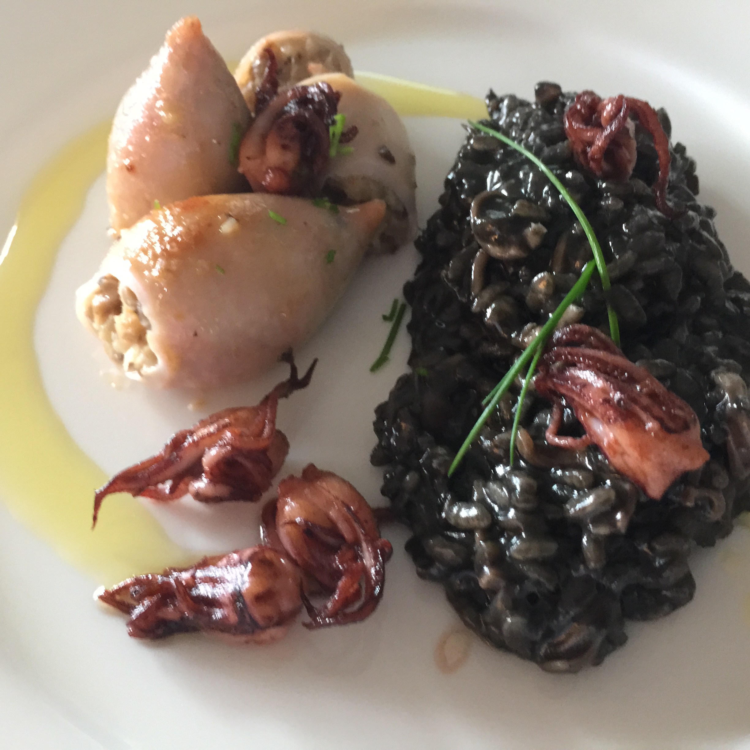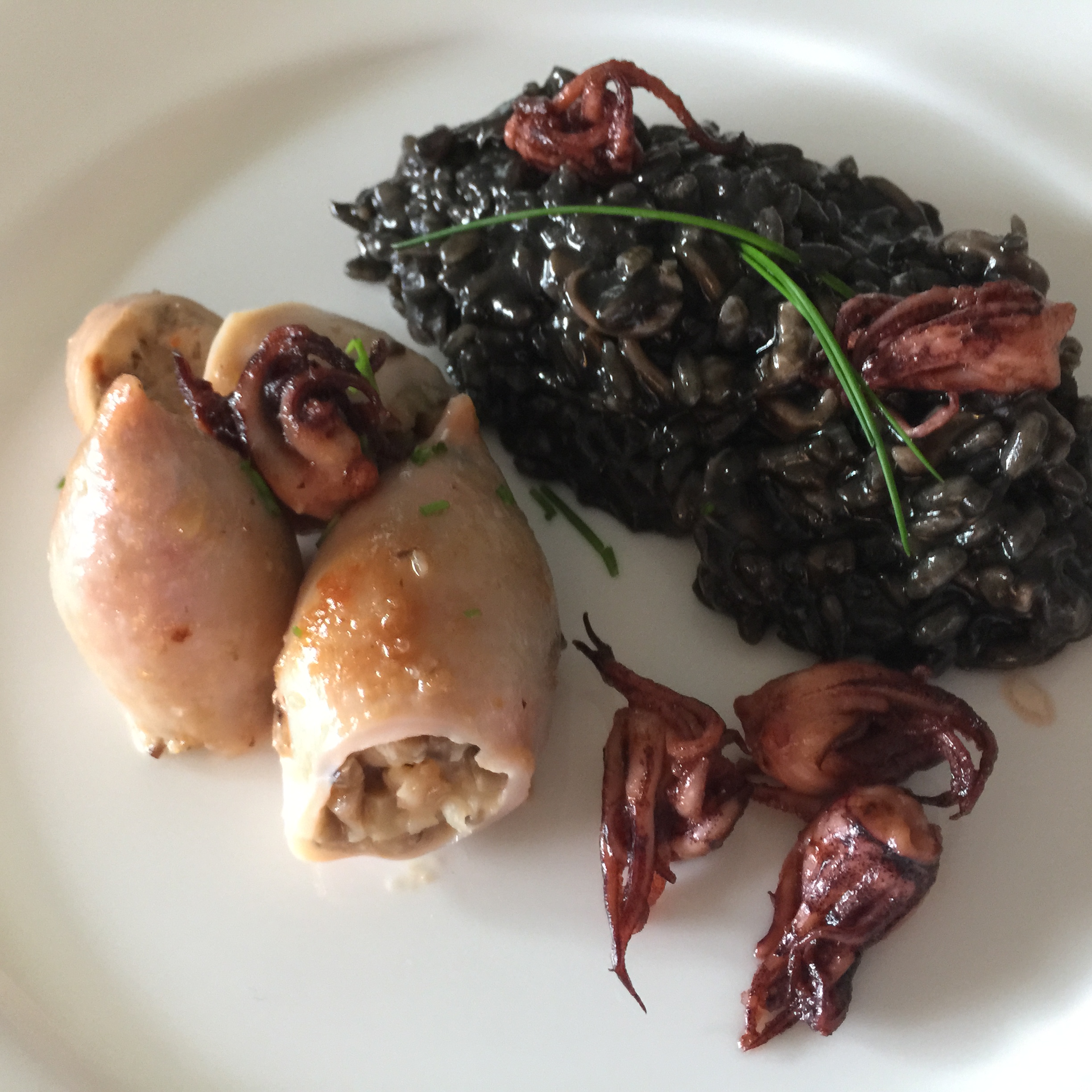 Emplatamos colocando el risotto y los cuerpos rellenos, adornamos con las patitas y un poquito de cebollino y ponemos un chorrito de aceite de adorno.