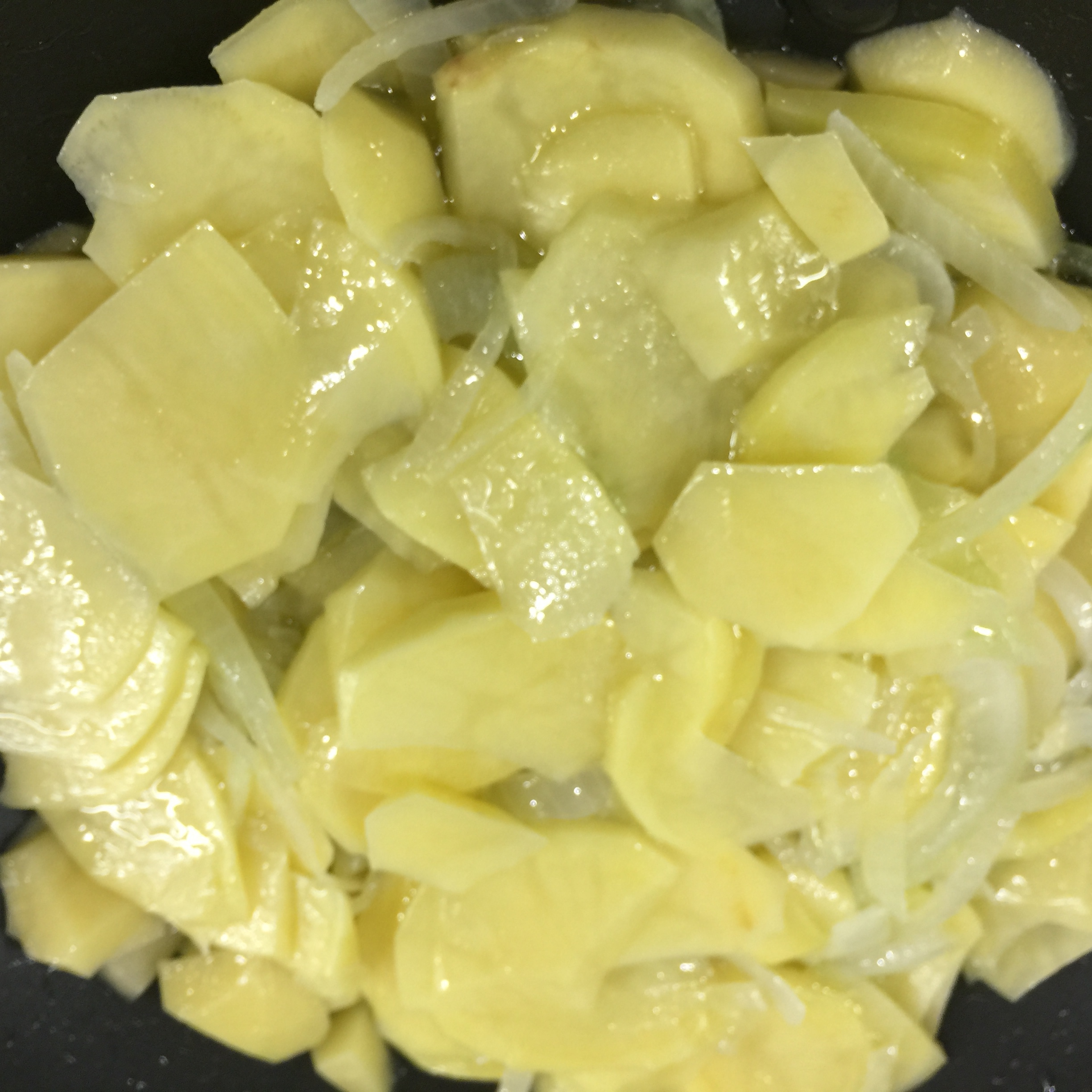 A continuación, colocamos una sartén al fuego con aceite abundante, mejor de oliva aunque se puede utilizar cualquier tipo y ponemos en él la cebolla a fuego medio para que poche un poco y empiece a ponerse transparente. En ese momento echamos las patatas, removemos bien para que el aceite llegue bien a todas ellas y que se mezclen con la cebolla puesto que, si se quedase ésta en el fondo sin mezclar, podría dorarse en exceso. Ahora podemos subirle el fuego hasta que vuelva a coger temperatura, momento en el cual lo bajaremos, 4 en una escala de 10, le ponemos una tapa encima, las dejamos y le damos la vuelta de vez en cuando.